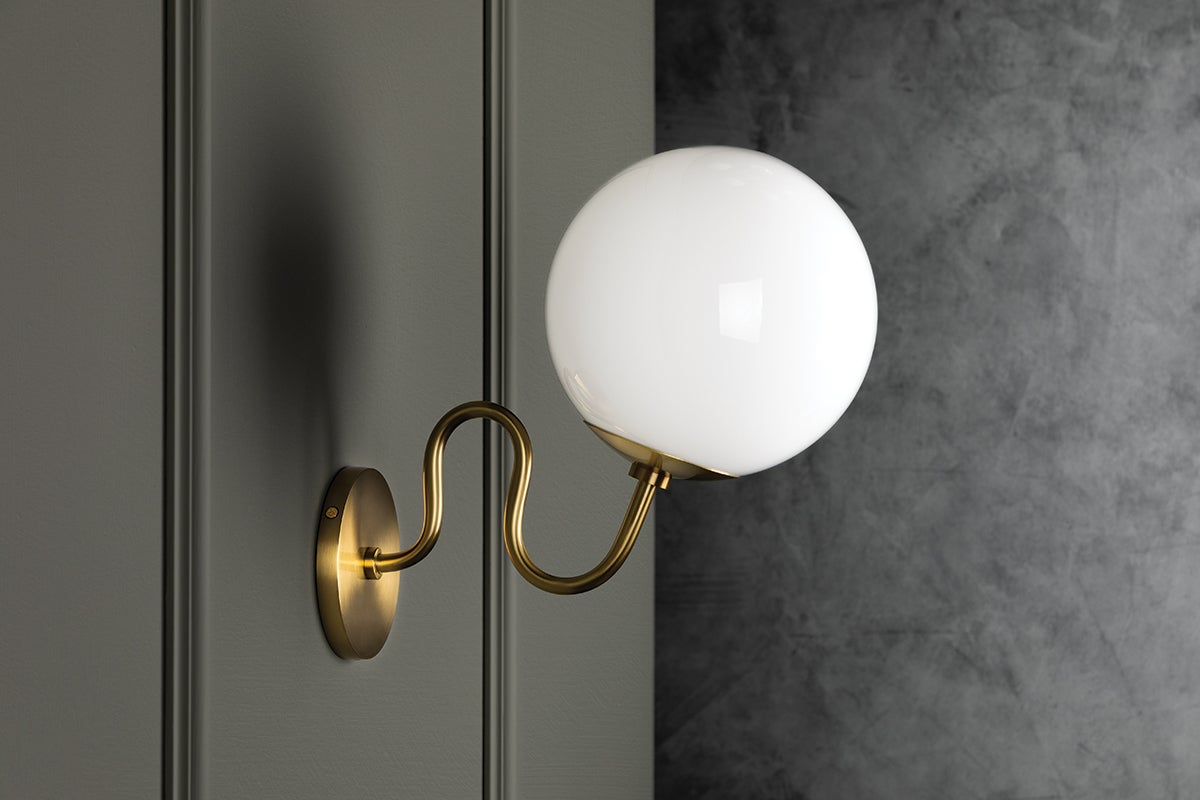 Art nouveau meets midcentury Italian, the Havana wall sconce and chandelier indulge in of-the-moment, whimsical design. Available in aged brass, old bronze, and polished nickel, Havana is engaged in shape play and features a wavy arm and glossy opal globe shade. Available in small and large chandelier.