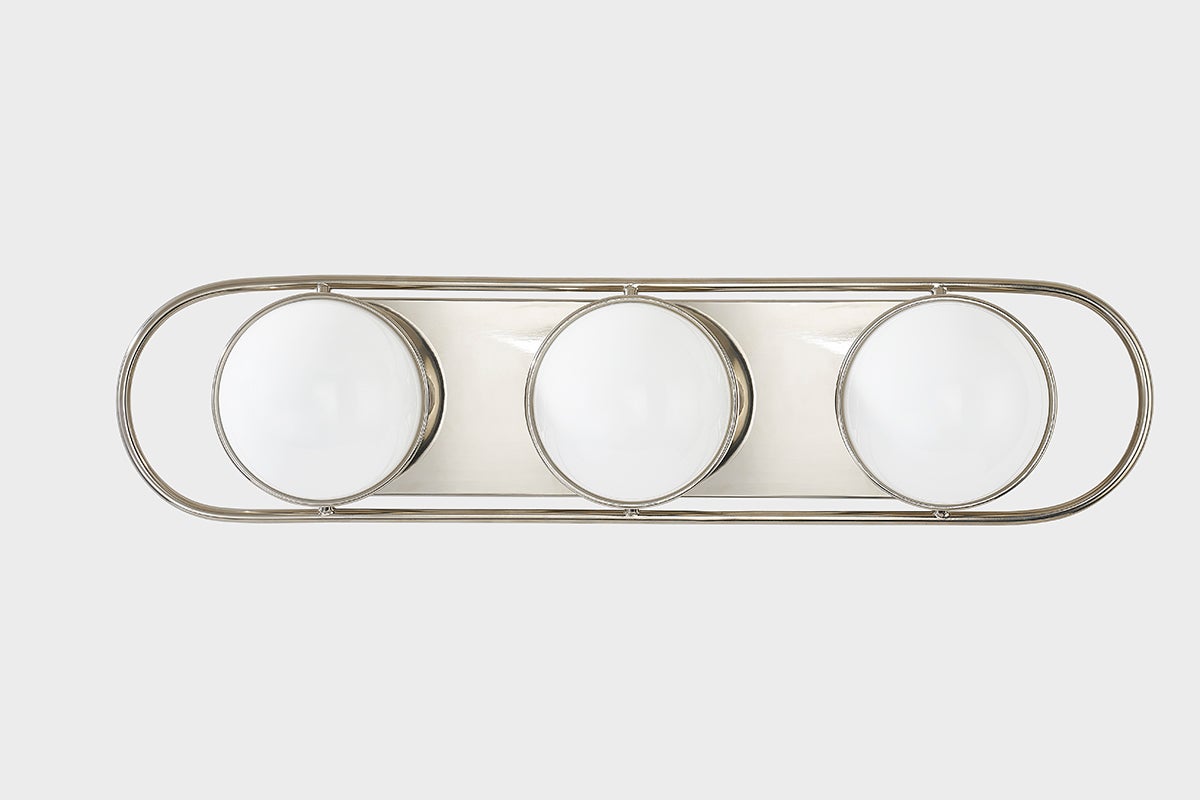 Opal glass spheres are held gem-like within a Polished Nickel or Aged Brass setting, bringing a modern jewelry aesthetic to the bath or powder room. The two-, three-, and four-light options are displayed within an elegant metal racetrack frame and can be mounted vertically or horizontally making them perfect solo above a mirror or in pairs alongside it.