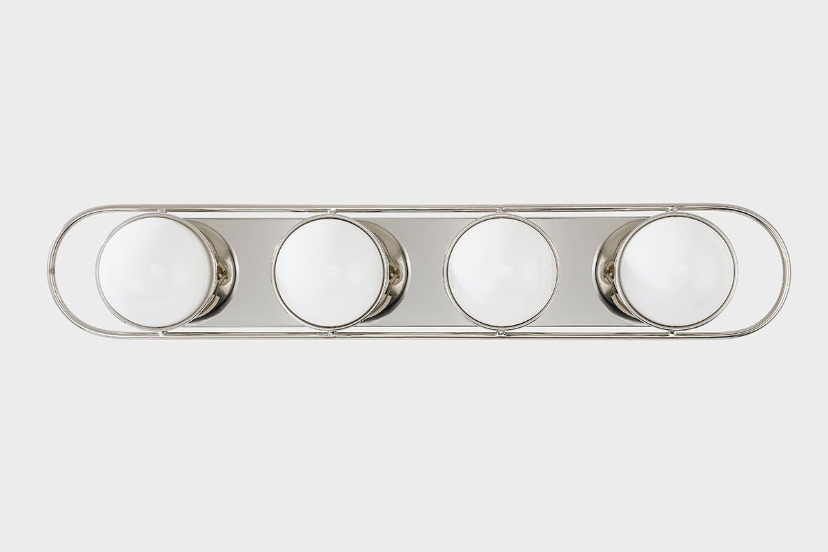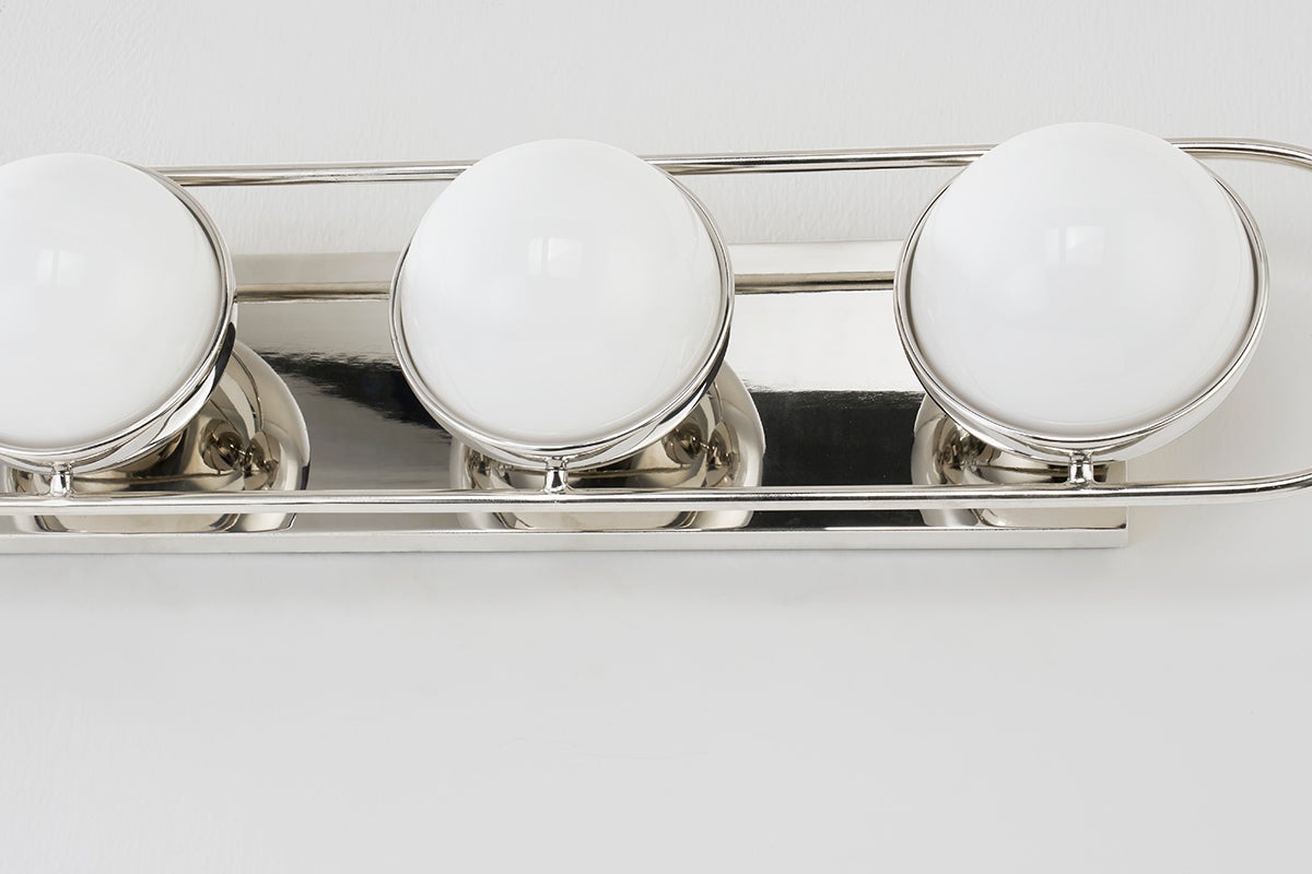 Opal glass spheres are held gem-like within a Polished Nickel or Aged Brass setting, bringing a modern jewelry aesthetic to the bath or powder room. The two-, three-, and four-light options are displayed within an elegant metal racetrack frame and can be mounted vertically or horizontally making them perfect solo above a mirror or in pairs alongside it.