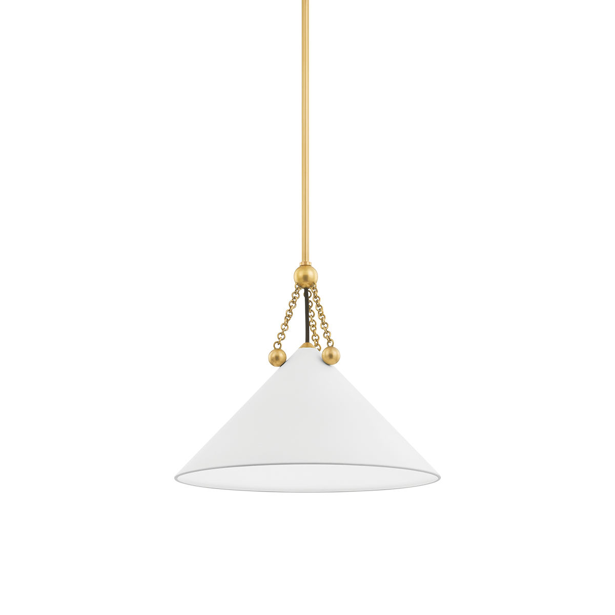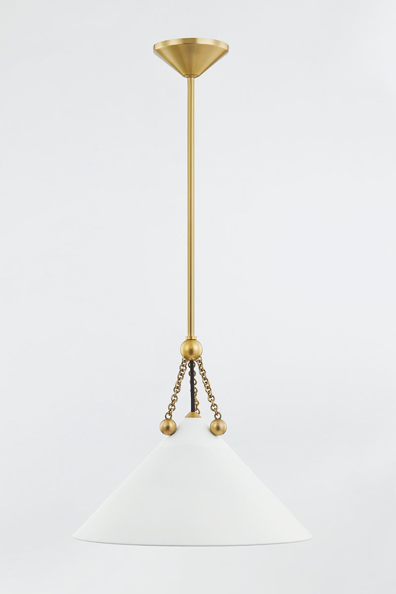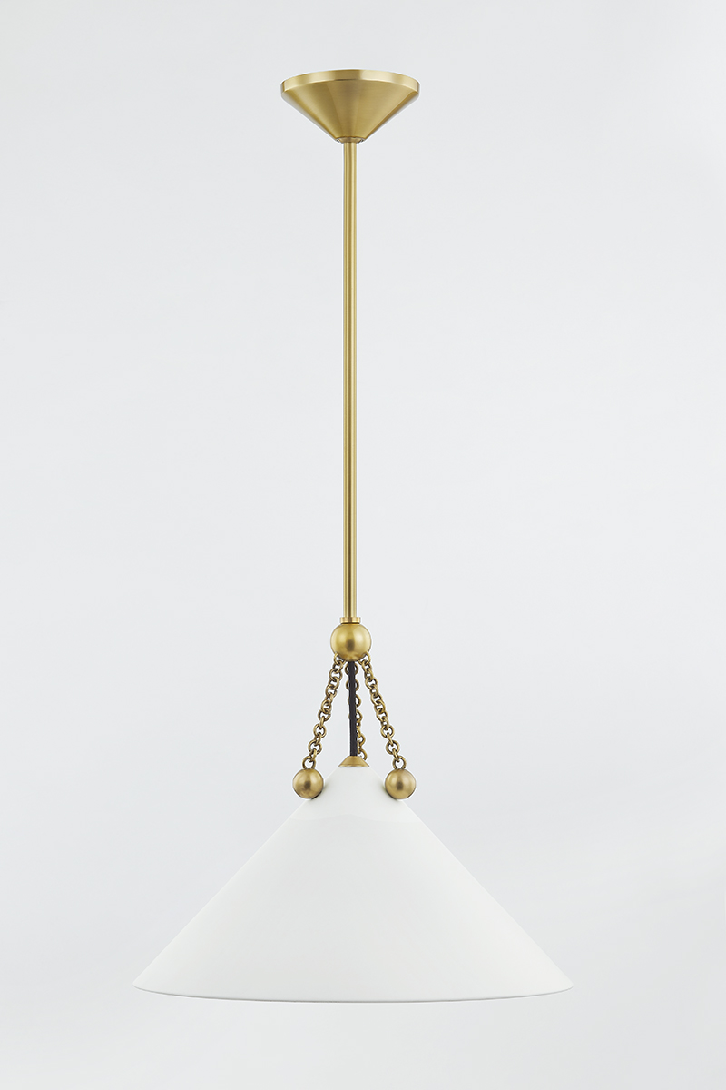 Boho meets Bauhaus in this ornamental and architectural pendant. The detailed Aged Brass chainwork, orb accents, and metal tip at the top decorate the straightforward, angular shade with jewelry-like accents. The all-over Soft White finish feels crisp and clean, while the Soft Black shade has a Soft White interior for a more dramatic effect.