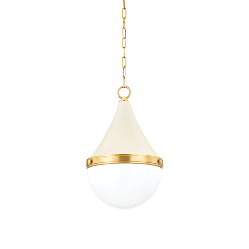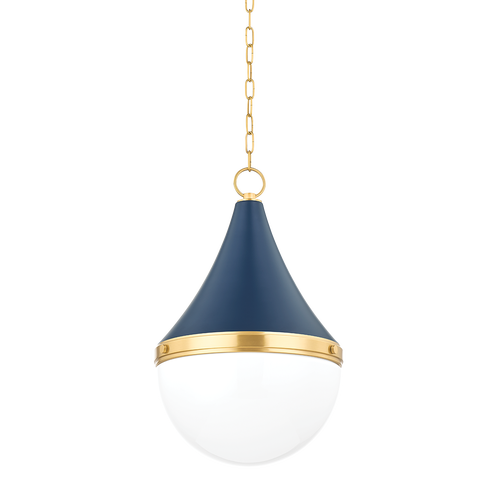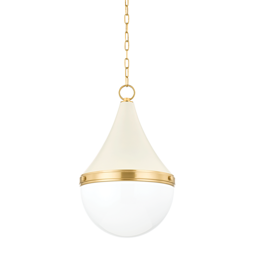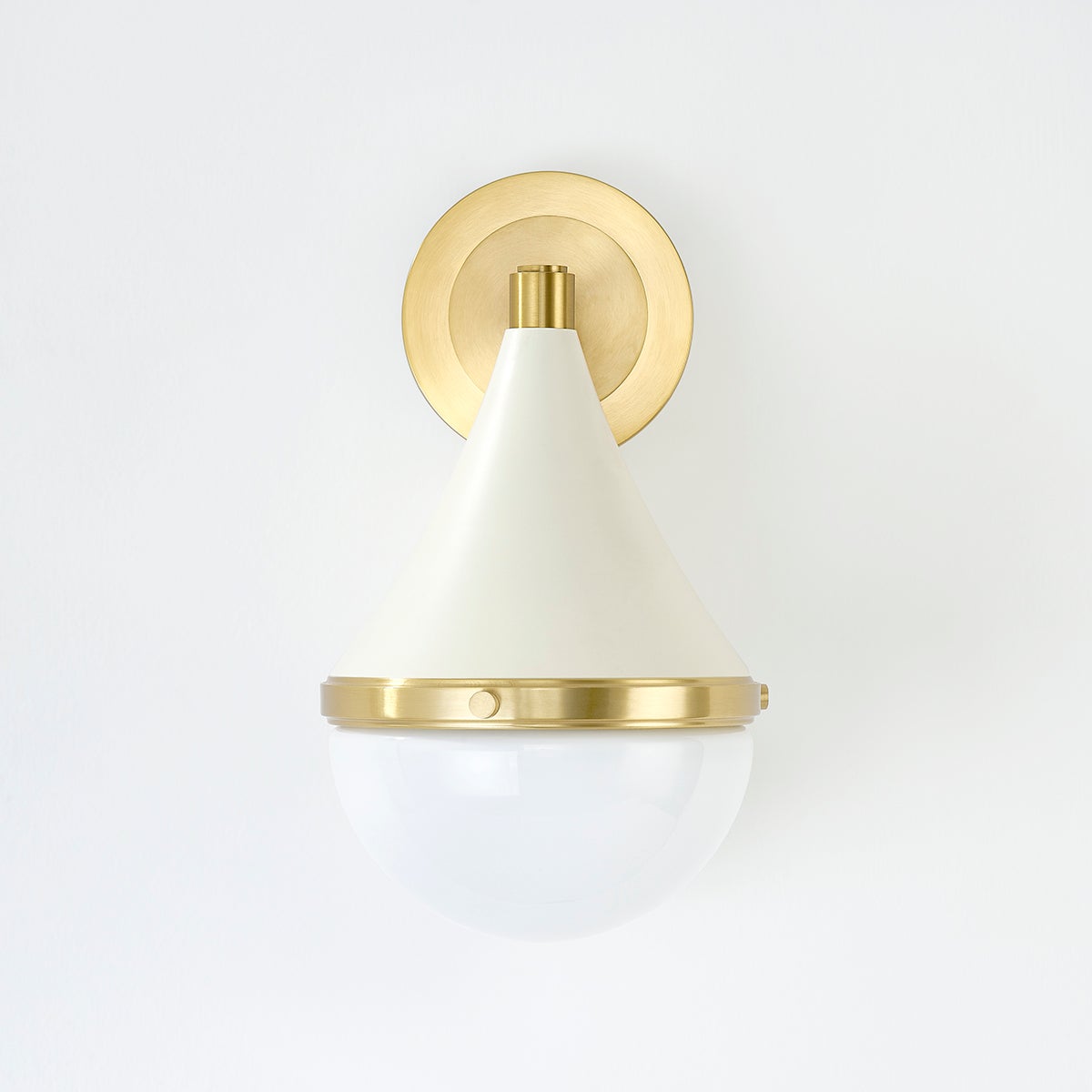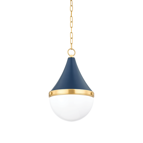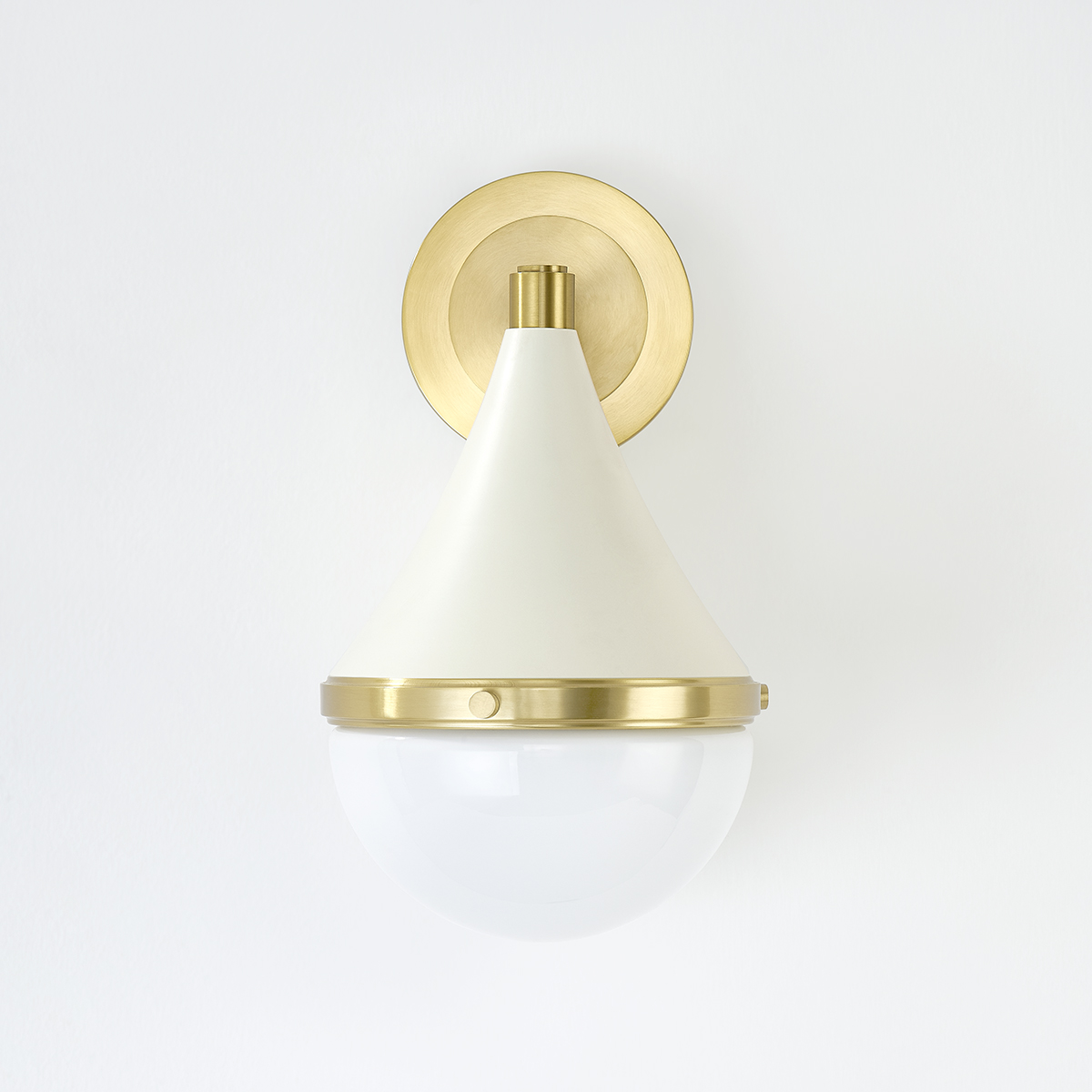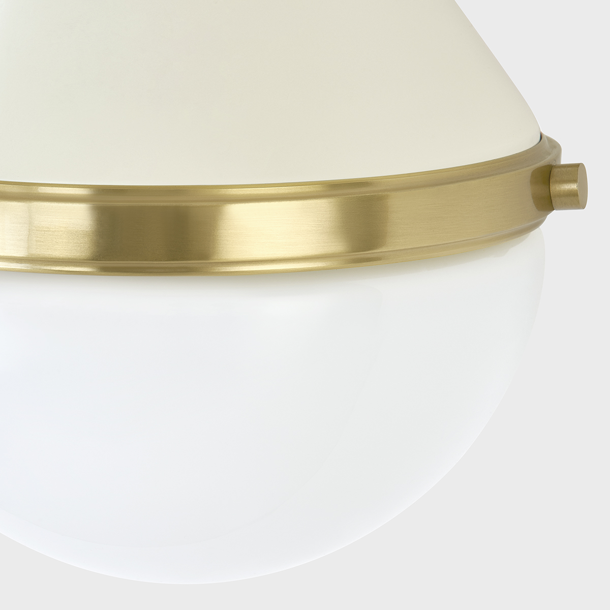 With a slight nod to the nautical, Ciara reimagines a classic design in a way that feels current and modern. A conical metal shade holds an opal glossy glass diffuser creating an overall teardrop silhouette. The beveled Aged Brass band at the center separates the shade and the diffuser while the exposed hardware adds a subtle industrial edge. The shade is available in a clean Soft Cream finish or a refined Soft Navy.