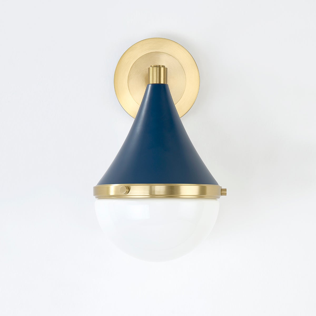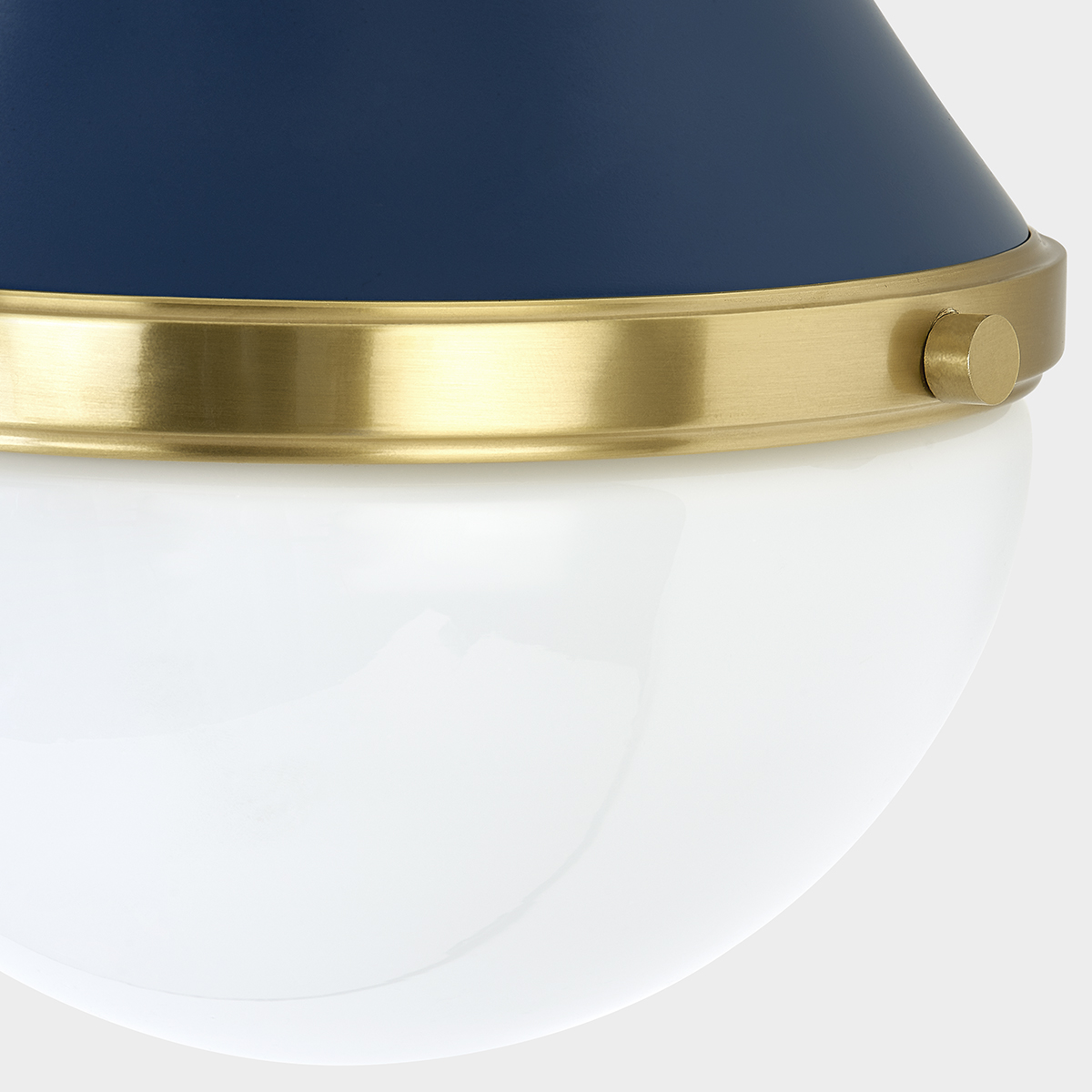 With a slight nod to the nautical, Ciara reimagines a classic design in a way that feels current and modern. A conical metal shade holds an opal glossy glass diffuser creating an overall teardrop silhouette. The beveled Aged Brass band at the center separates the shade and the diffuser while the exposed hardware adds a subtle industrial edge. The shade is available in a clean Soft Cream finish or a refined Soft Navy.