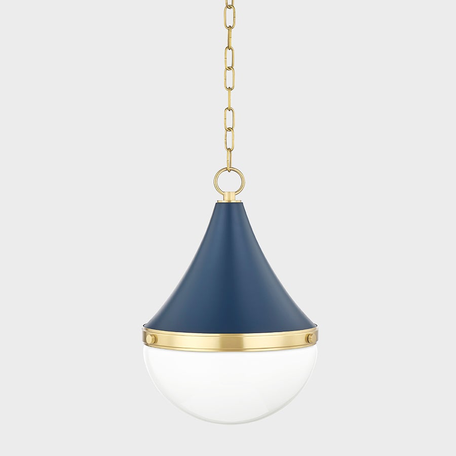 With a slight nod to the nautical, Ciara reimagines a classic design in a way that feels current and modern. A conical metal shade holds an opal glossy glass diffuser creating an overall teardrop silhouette. The beveled Aged Brass band at the center separates the shade and the diffuser while the exposed hardware adds a subtle industrial edge. The shade is available in a clean Soft Cream finish or a refined Soft Navy.