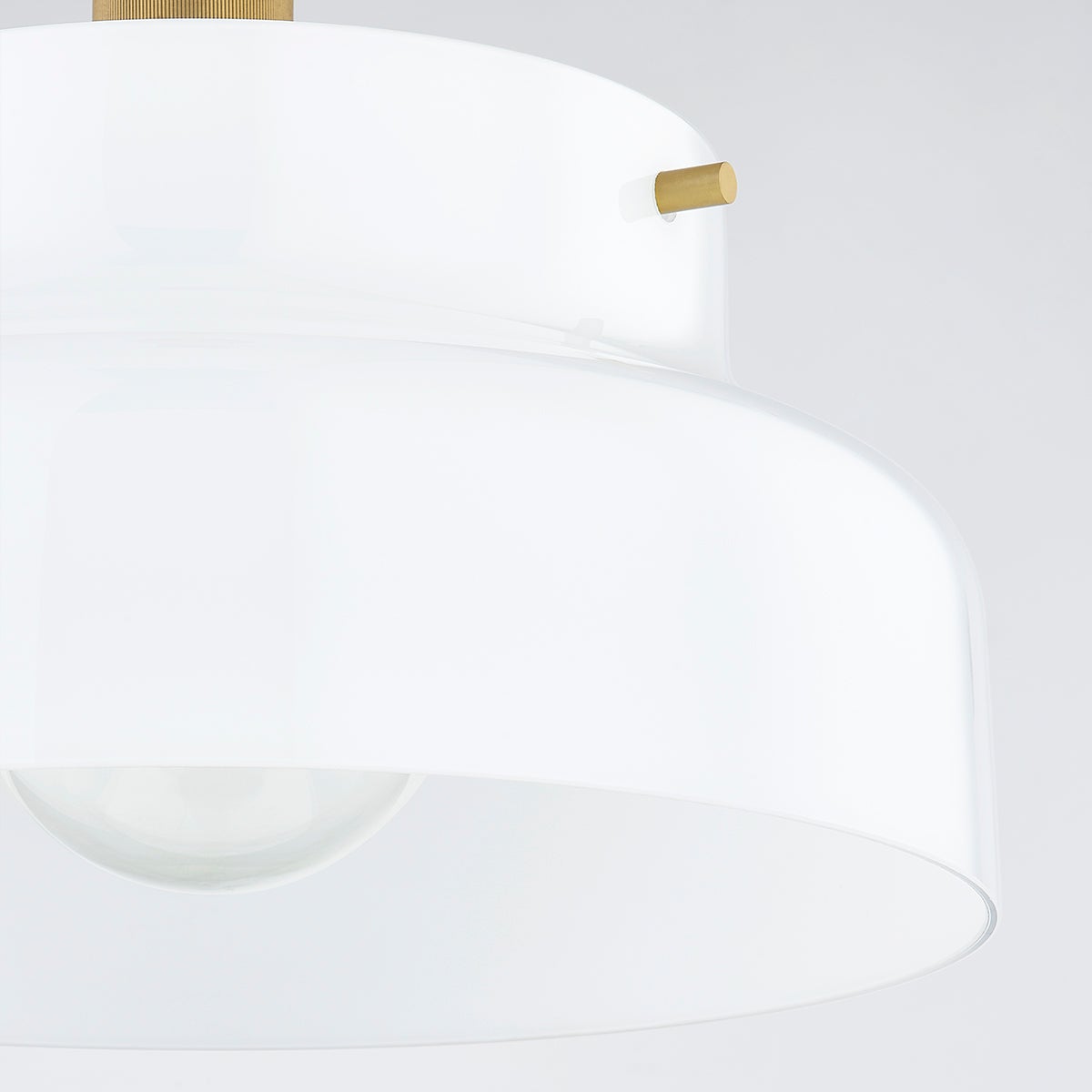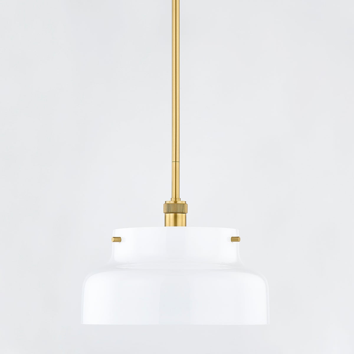 A streamlined opal glossy glass shade is accented with subtle metal details, like the knurling on the socket cup, adding visual interest to this modern pendant's clean, minimal look. A great choice to style in multiples over the kitchen island or solo over a small dining area.