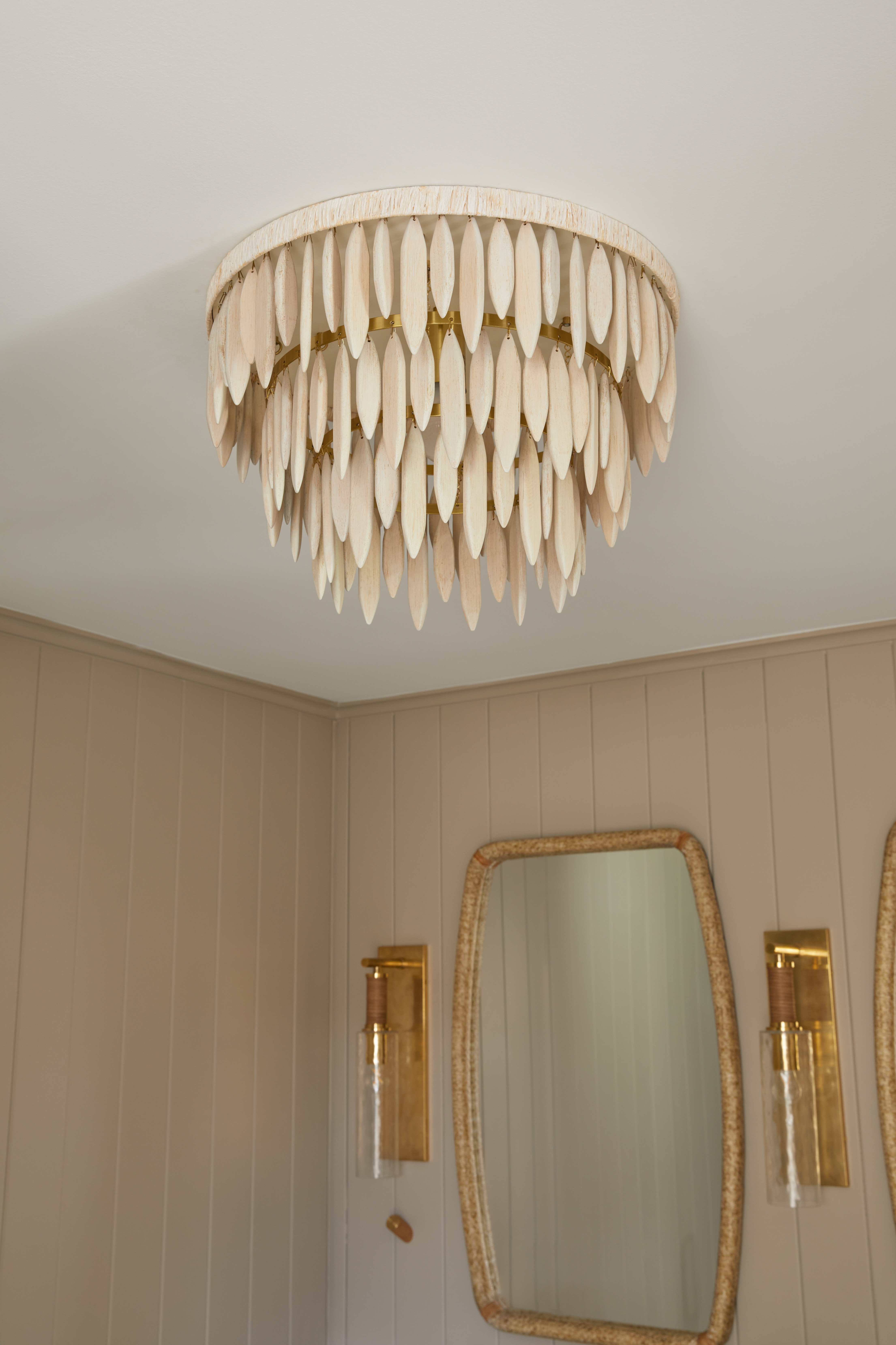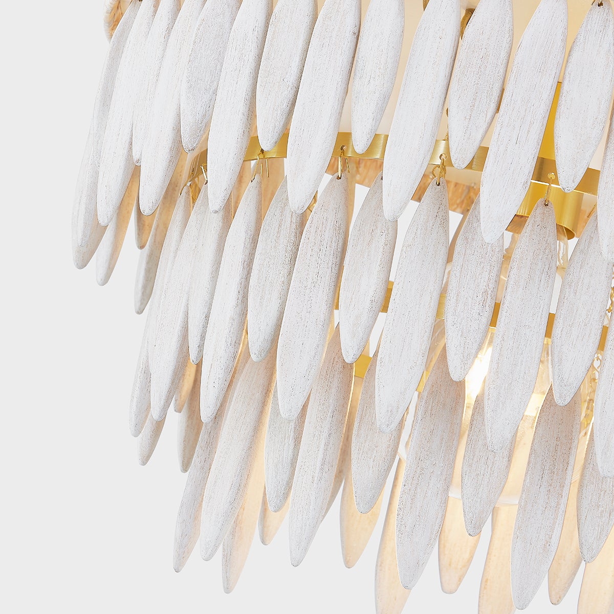 This elevated organic design blends soft natural elements with an elegant, sculptural form. A series of elongated white-washed wood beads are arrayed in tiers around an Aged Brass framework. The top ring of the frame is wrapped in white raffia adding to the clean, fresh feel. The neutral tone makes it the perfect way to add an organic, coastal vibe to a space. Available as a semi-flush, pendant, and chandelier.