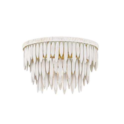 This elevated organic design blends soft natural elements with an elegant, sculptural form. A series of elongated white-washed wood beads are arrayed in tiers around an Aged Brass framework. The top ring of the frame is wrapped in white raffia adding to the clean, fresh feel. The neutral tone makes it the perfect way to add an organic, coastal vibe to a space. Available as a semi-flush, pendant, and chandelier.