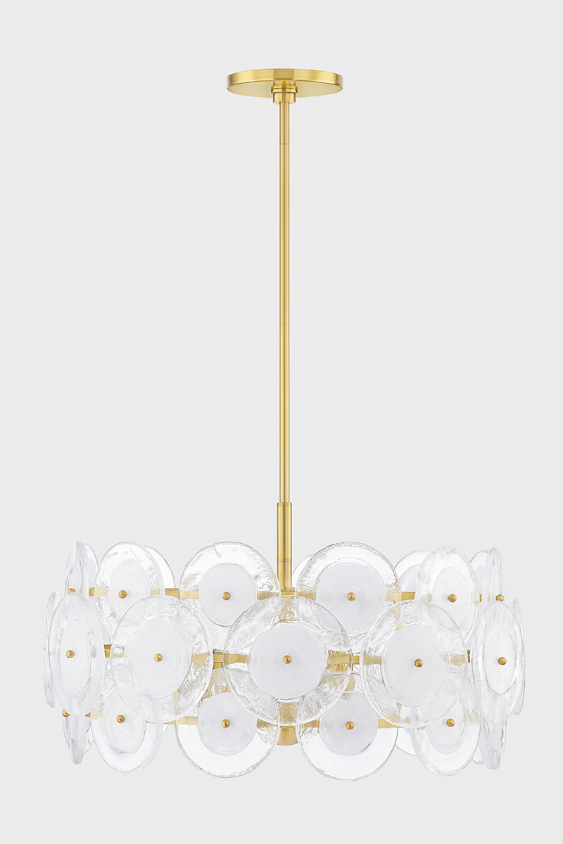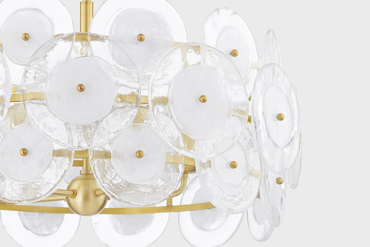 An elegant reimagining of the classic drum shade silhouette, this dazzling chandelier features discs of clear cast glass, each with an opaque Blonchino at the center, layered around a three-tiered Aged Brass ring framework. The glass discs have a metal accent in the middle and vary in size, creating visual interest and a lighting effect that feels simultaneously glamorous and warm.