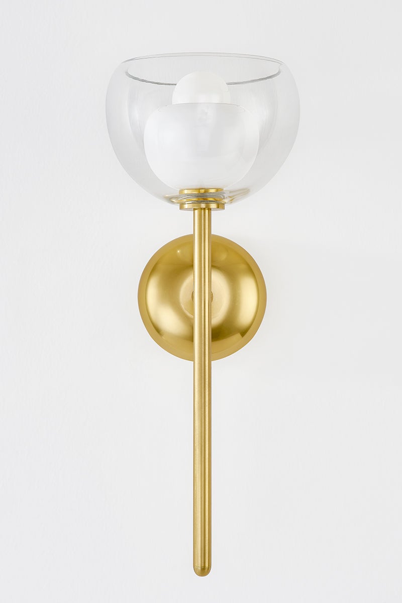 Cortney is a gorgeous combination of mixed glass with Aged Brass. An opal glossy glass shade is captured within a clear glass shade for a look that is both trendy and useable. Light flows through the open shades and reflects inside them. The opal glass table lamp, with its visible Aged Brass pull chain, adds a stylish pop and polish to any space. Also available as a wall sconce, semi-flush, and pendant. Part of our Home Ec. x Mitzi Tastemakers collection.