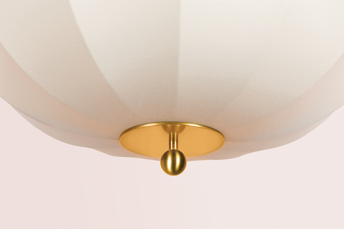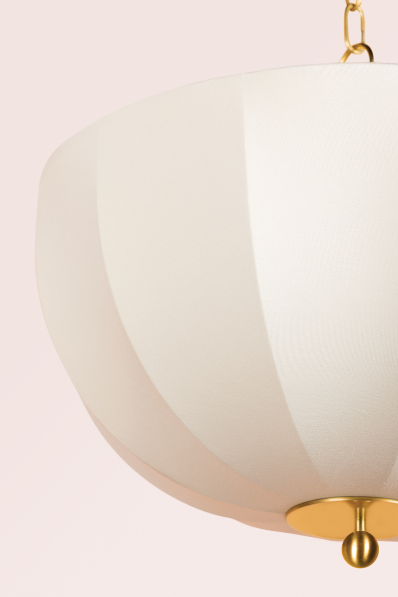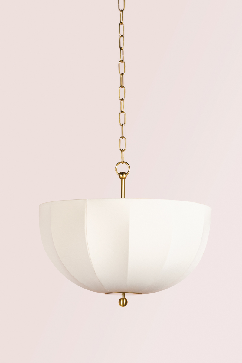 Inspired by mid-century Danish design, Meshelle features a whimsical umbrella shape. Light flows both through the shade and softly glows around it. Aged Brass accents on the finials, chain detailing, and the floor lamp's pull chain, add a sophisticated touch to this usable fixture. Part of our Home Ec. x Mitzi Tastemakers collection.