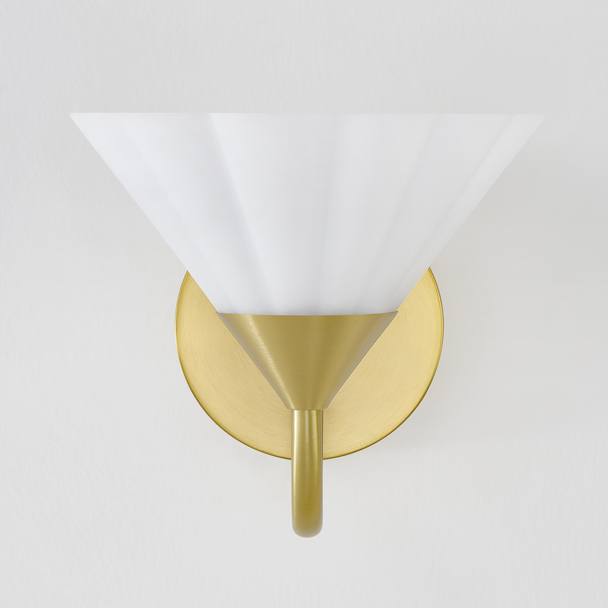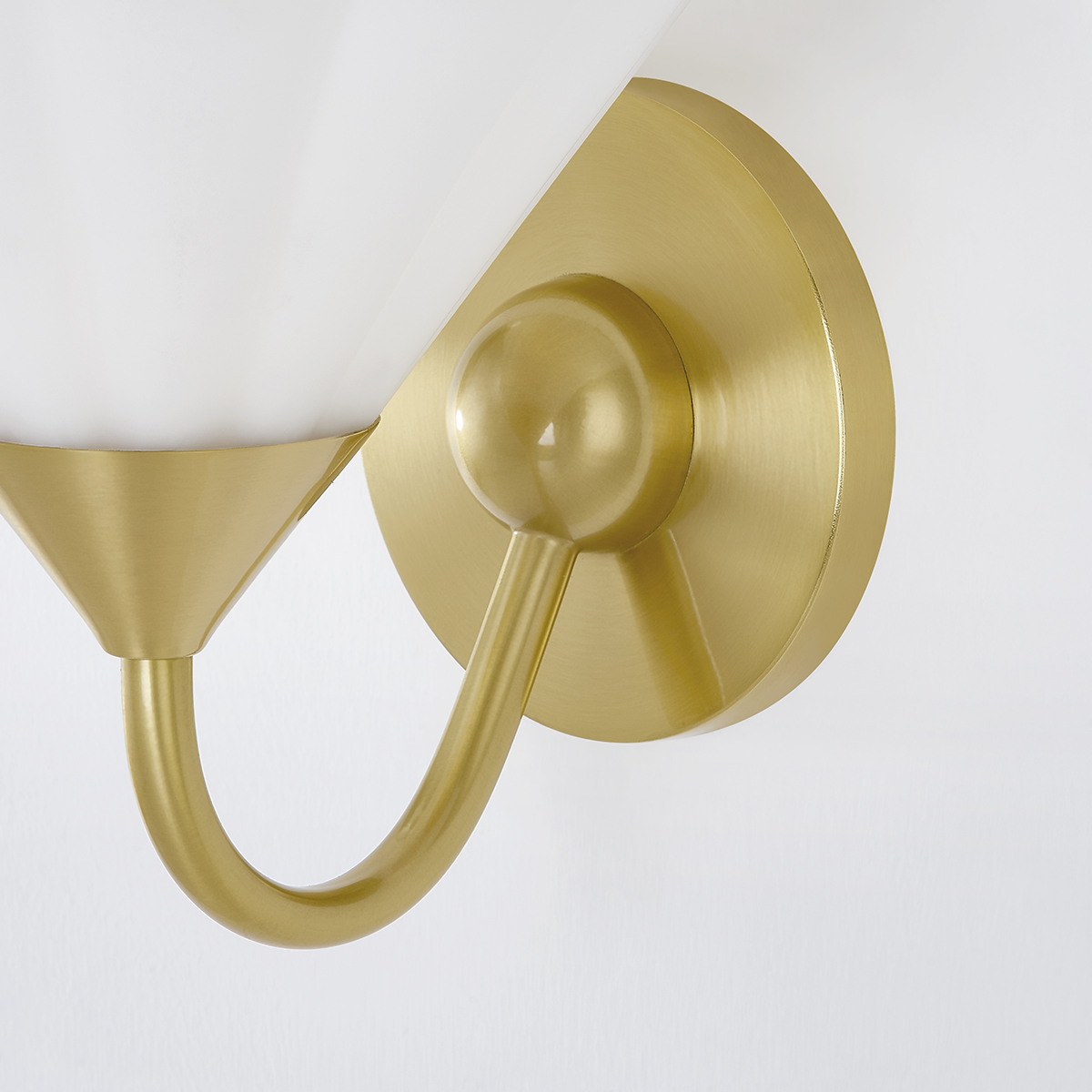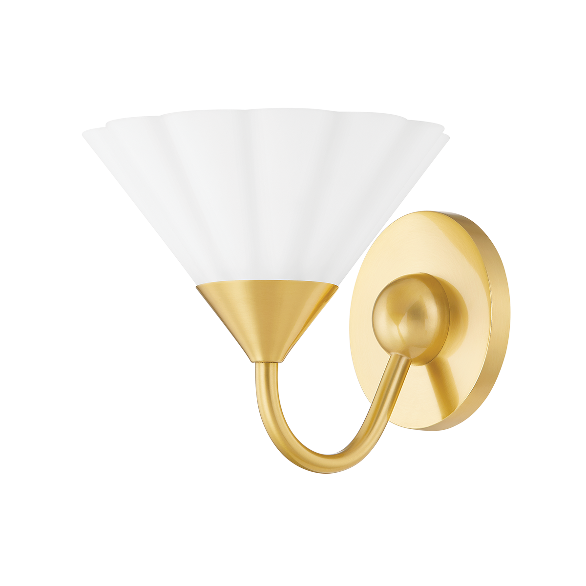 Softly ruffled opal etched glass shades mounted on slender, curved arms give this stylish design a sculptural feel whether hanging from the ceiling or mounted on the wall. The Textured White finish produces a clean, monochromatic effect, while the Aged Brass finish option adds a hint of shine. Mounted for uplight and available as a wall sconce, bath, or chandelier, Kelsey works in spaces throughout the home. Part of our Home Ec. x Mitzi Tastemakers collection.