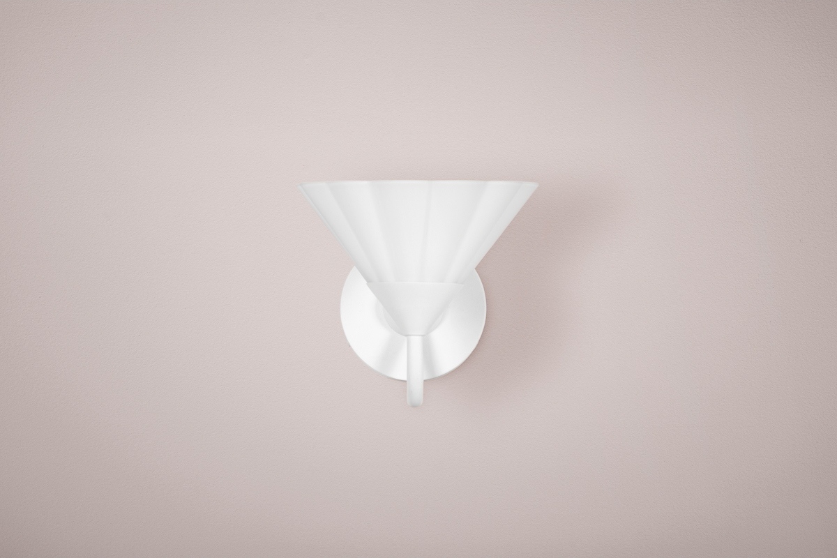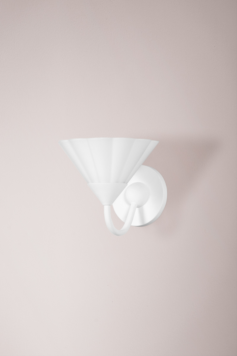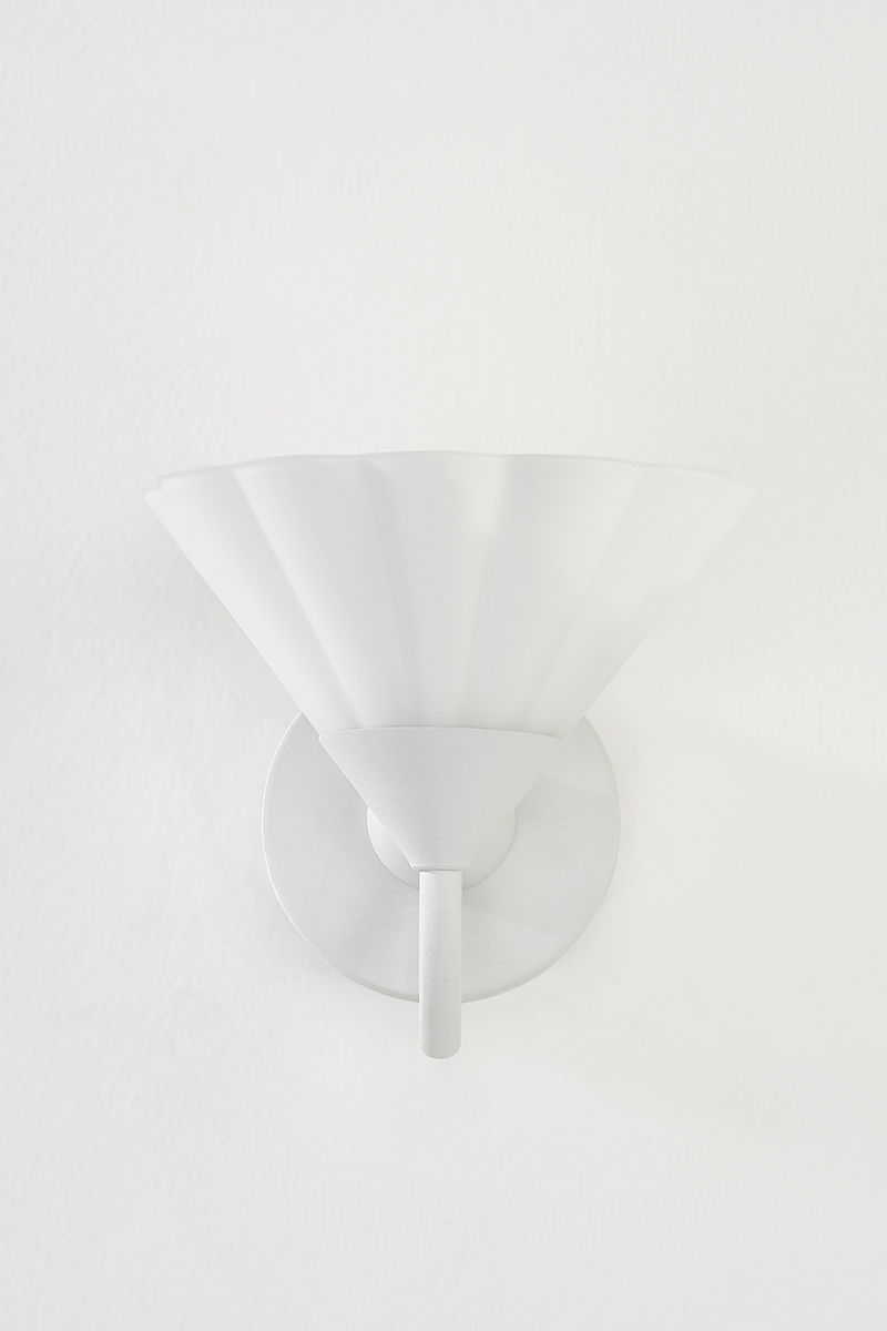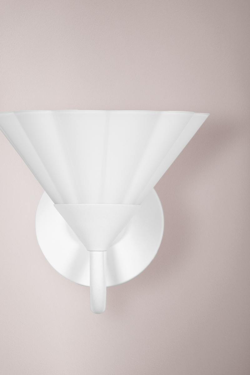 Softly ruffled opal etched glass shades mounted on slender, curved arms give this stylish design a sculptural feel whether hanging from the ceiling or mounted on the wall. The Textured White finish produces a clean, monochromatic effect, while the Aged Brass finish option adds a hint of shine. Mounted for uplight and available as a wall sconce, bath, or chandelier, Kelsey works in spaces throughout the home. Part of our Home Ec. x Mitzi Tastemakers collection.