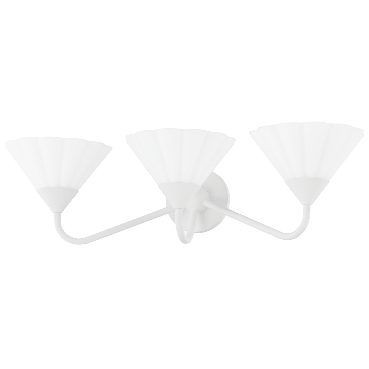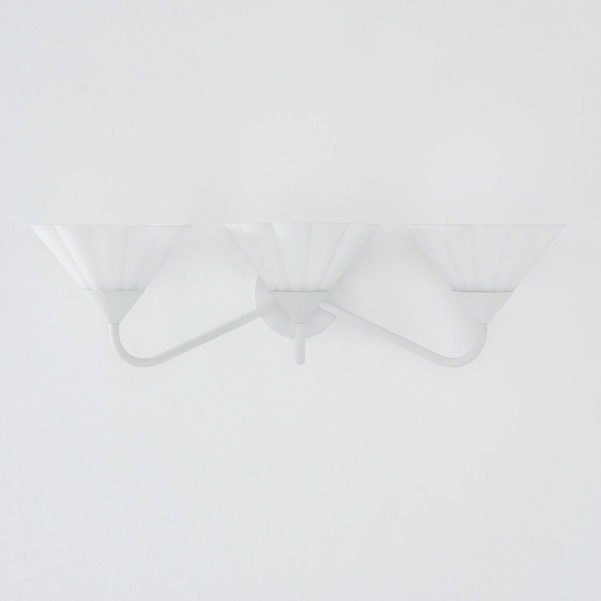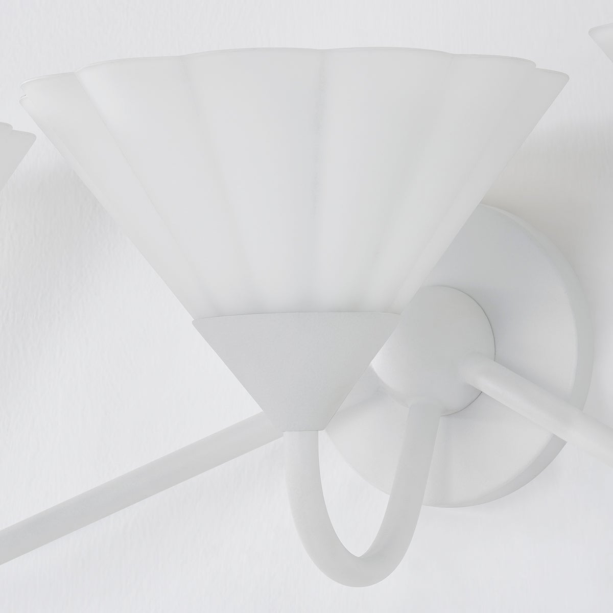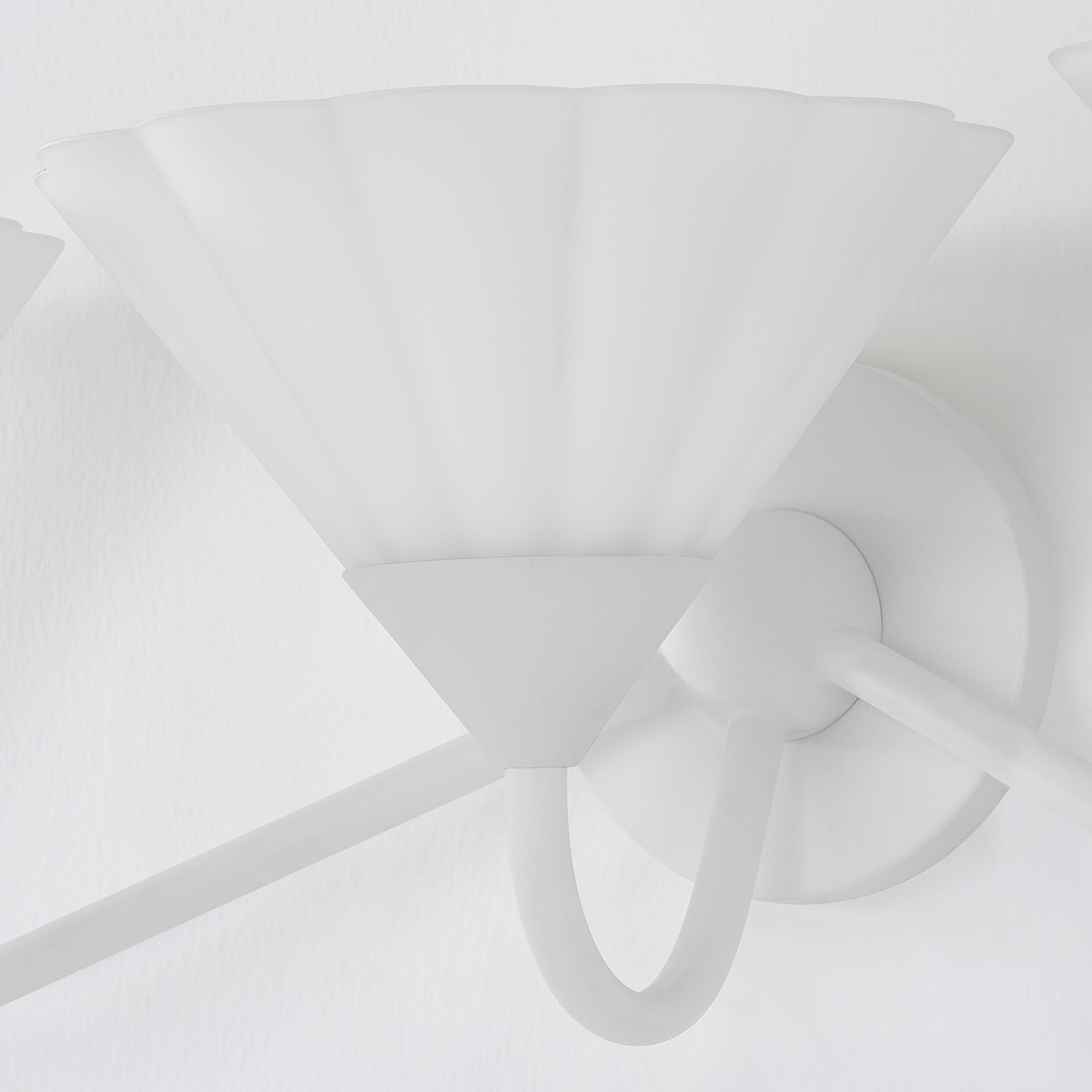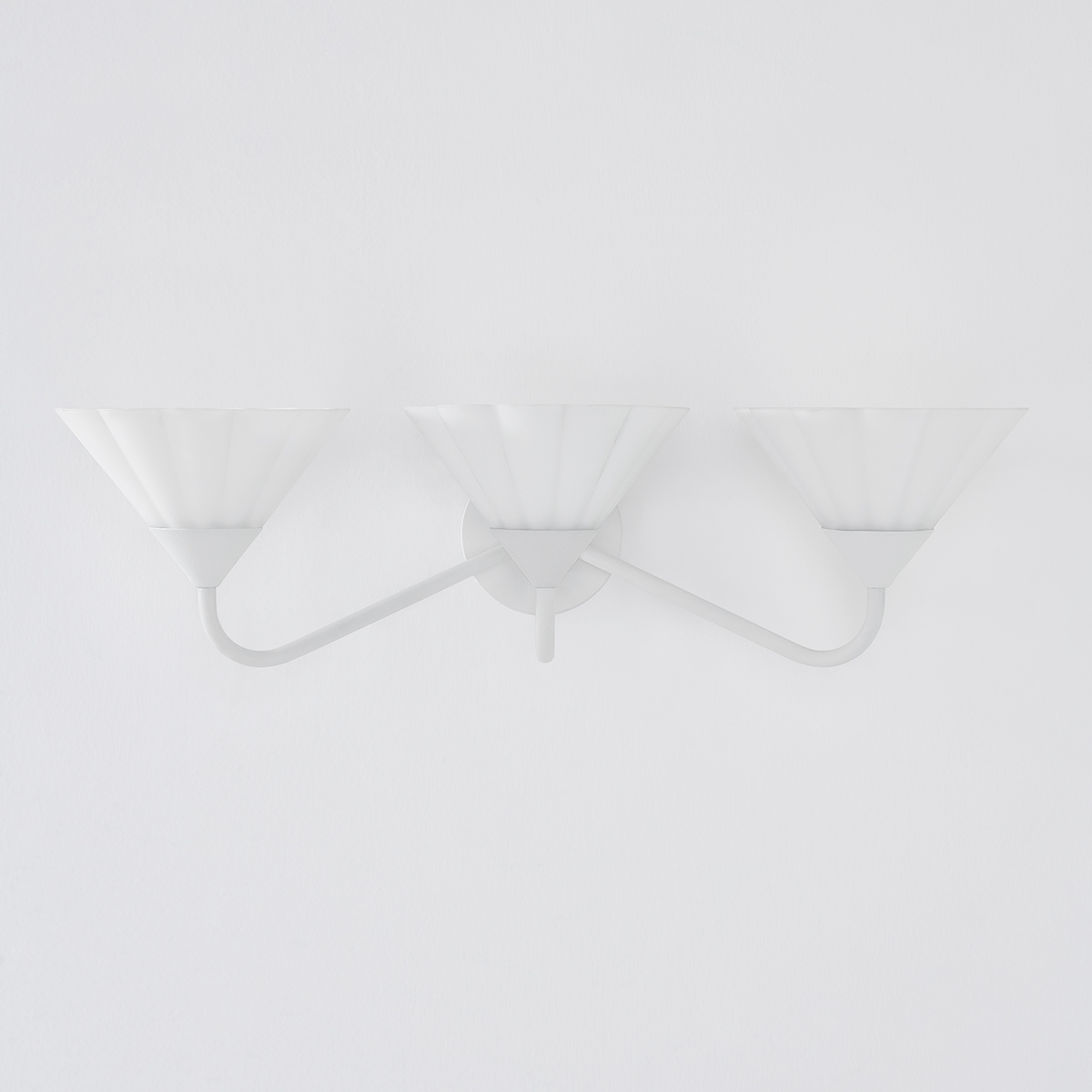 Softly ruffled opal etched glass shades mounted on slender, curved arms give this stylish design a sculptural feel whether hanging from the ceiling or mounted on the wall. The Textured White finish produces a clean, monochromatic effect, while the Aged Brass finish option adds a hint of shine. Mounted for uplight and available as a wall sconce, bath, or chandelier, Kelsey works in spaces throughout the home. Part of our Home Ec. x Mitzi Tastemakers collection.