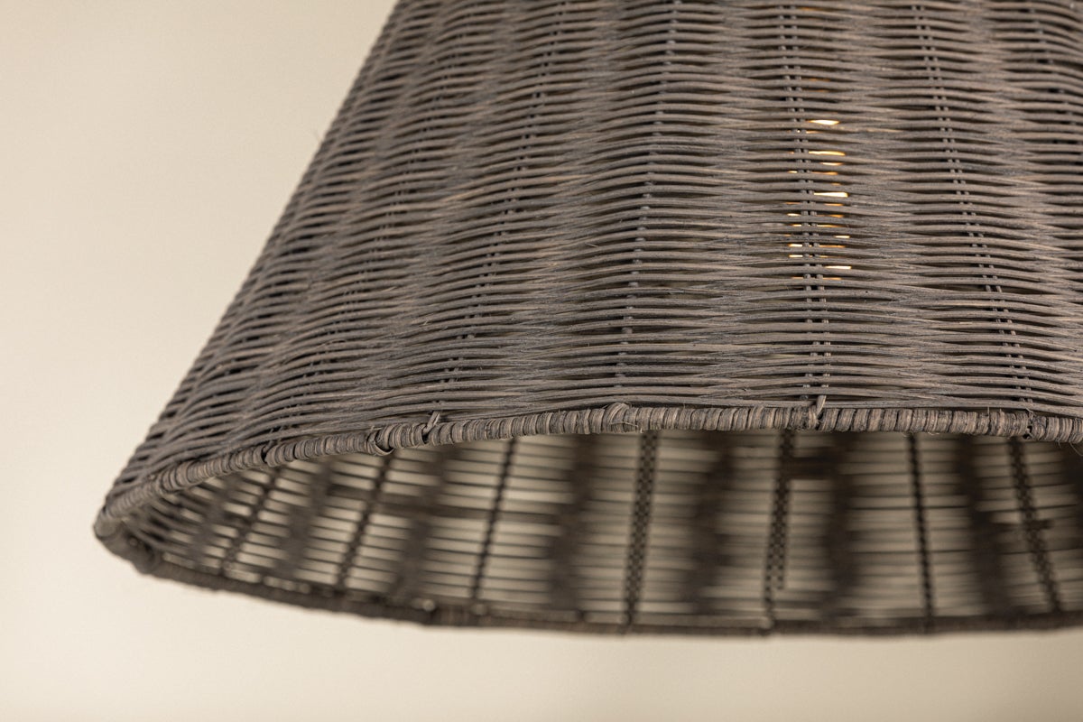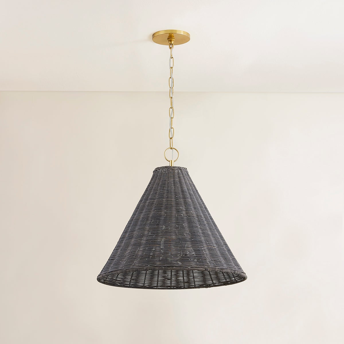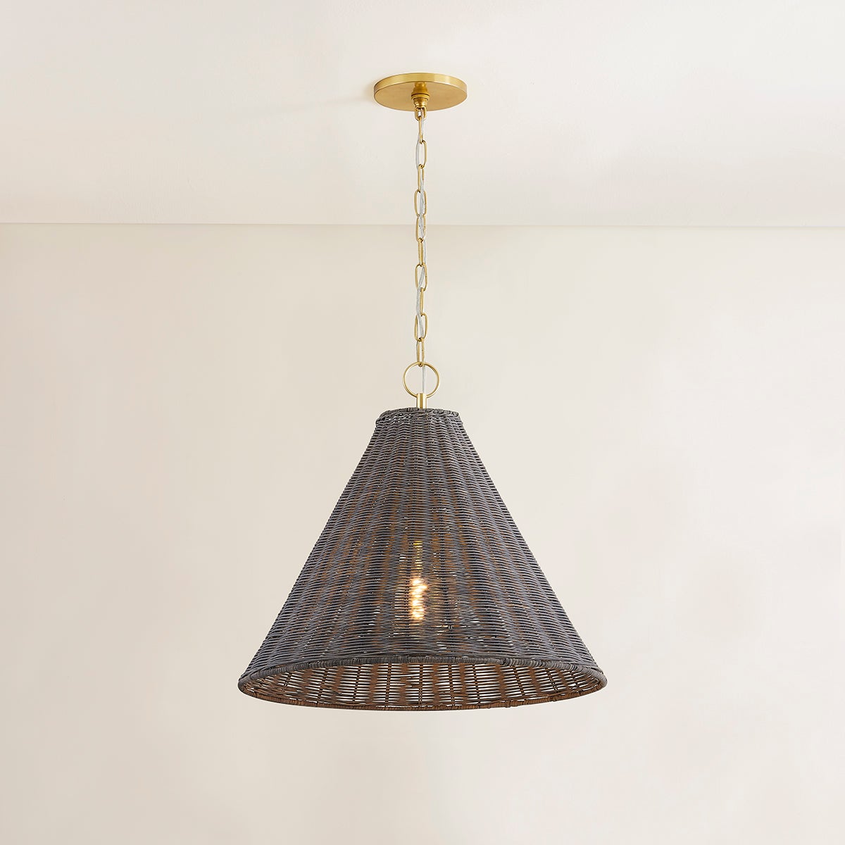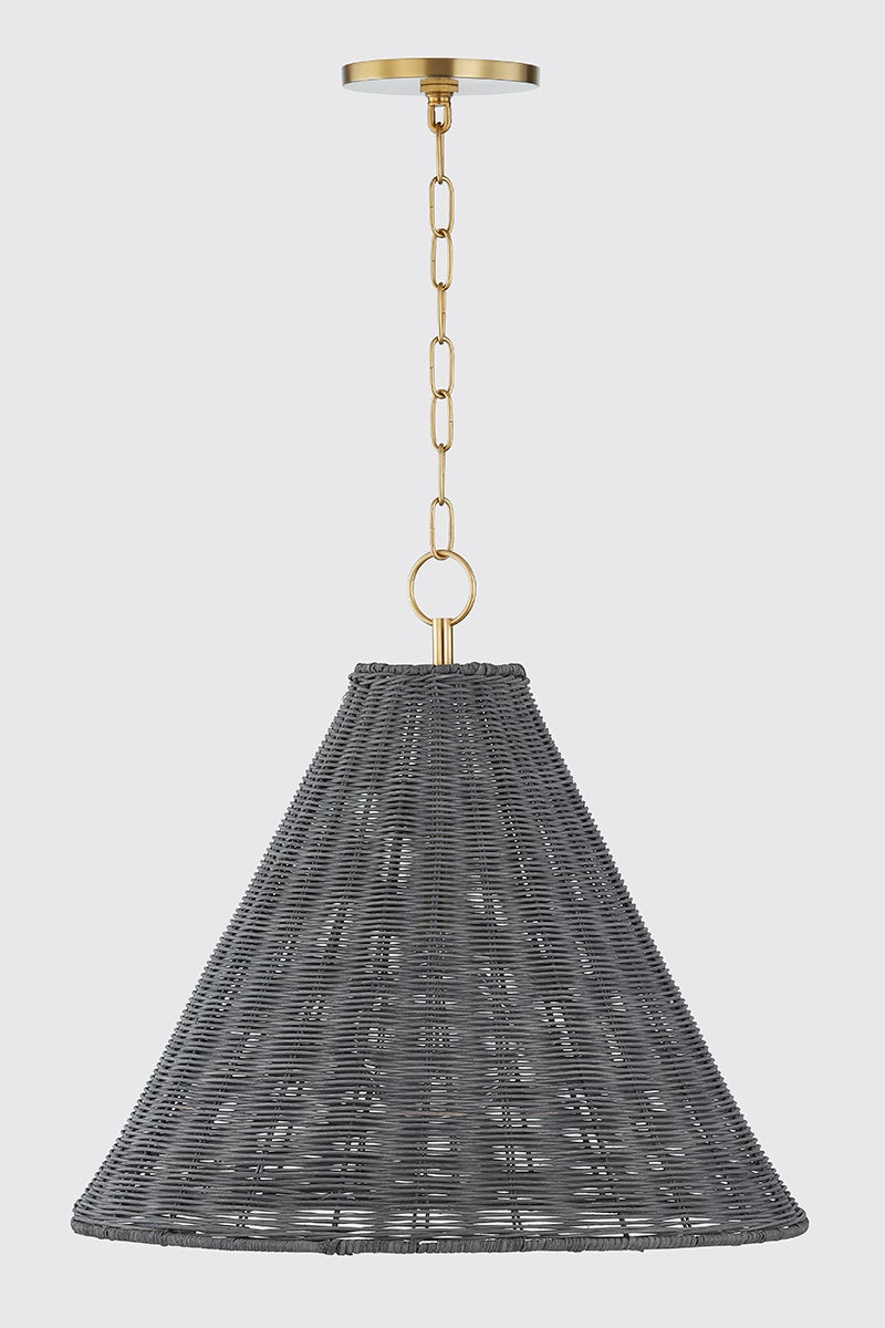 Combining the beauty of natural wicker and polished Aged Brass, this coastal-inspired fixture exudes understated elegance. When illuminated, the golden-hued brass gleams through the gray wicker, creating a warm and earthy glow. Available as a sconce, pendant, or floor lamp. Part of THELIFESTYLEDCO® collection.