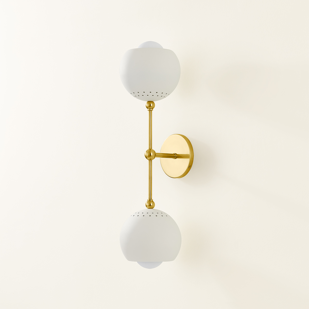 An imaginative twist on a mid-century modern design, Saylor has a modernized atomic look with large orb shades, an Aged Brass framework, and subtle vintage details. The swivel arms of this chandelier can be configured at any angle, providing control over the direction of light. Perforation details add a pop of interest to the shades. Saylor is available as a 6 or 8-light chandelier and a 2-light sconce.