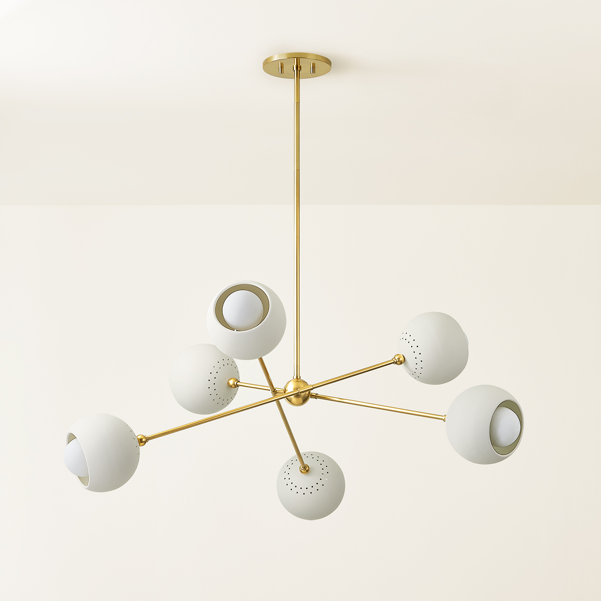An imaginative twist on a mid-century modern design, Saylor has a modernized atomic look with large orb shades, an Aged Brass framework, and subtle vintage details. The swivel arms of this chandelier can be configured at any angle, providing control over the direction of light. Perforation details add a pop of interest to the shades. Saylor is available as a 6 or 8-light chandelier and a 2-light sconce.