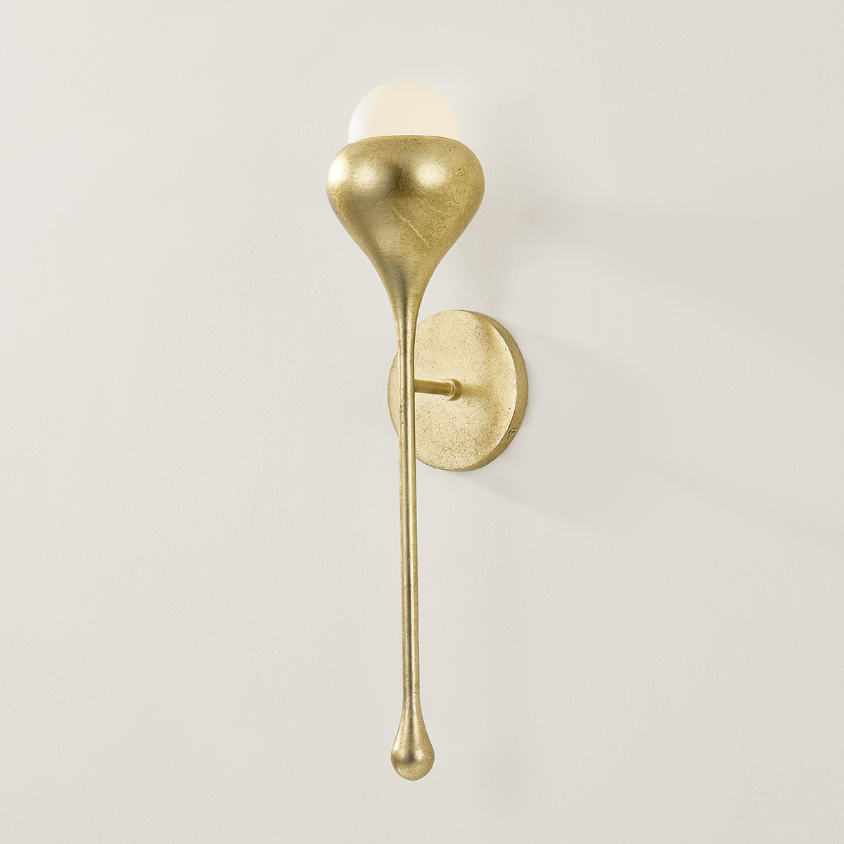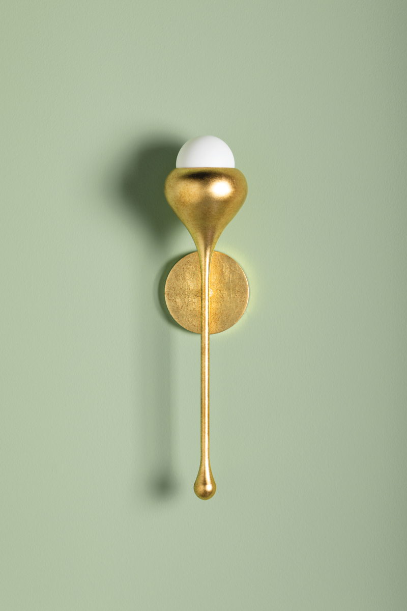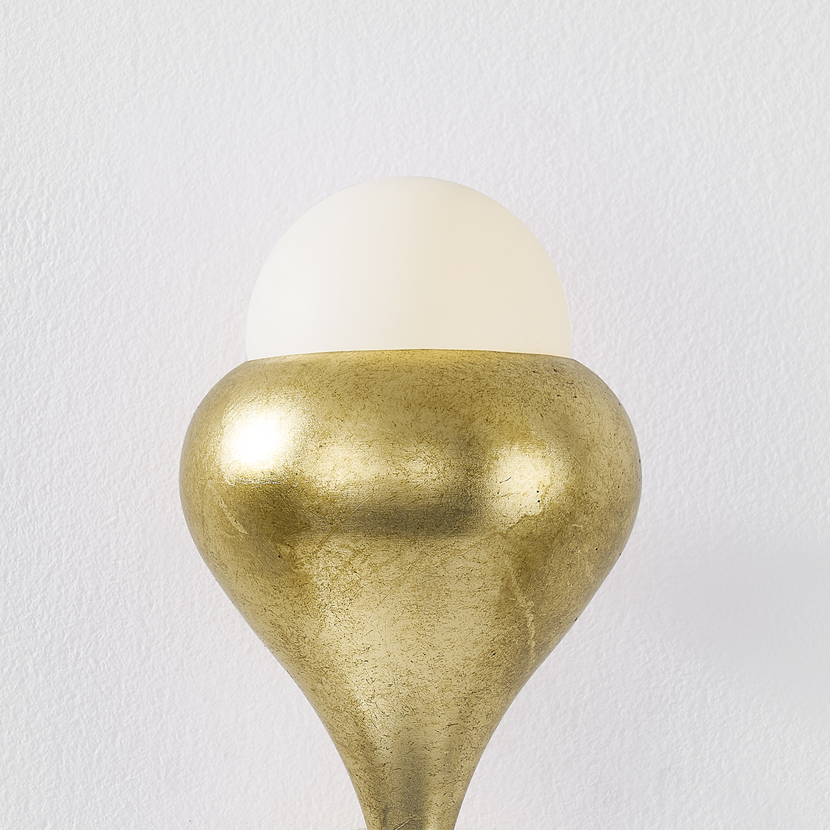 Inspired by an acorn growing on a branch, Luciel features gently curved forms, soft Opal Shiny Glass shades, and a luxurious Vintage Gold Leaf finish. The refined, jewelry-like aesthetic of the fixture is elongated to create a surreal, otherworldly representation of nature. Luciel is available as a sconce, chandelier, and pendant.