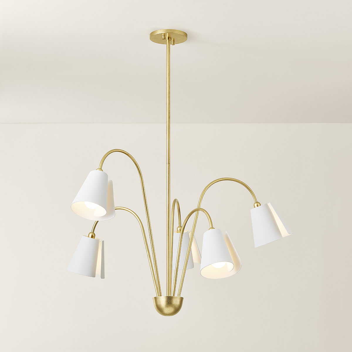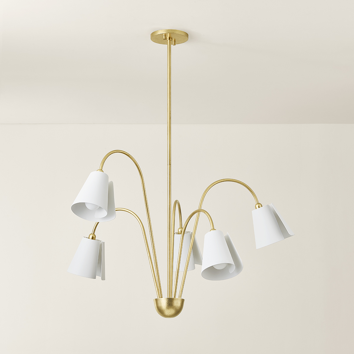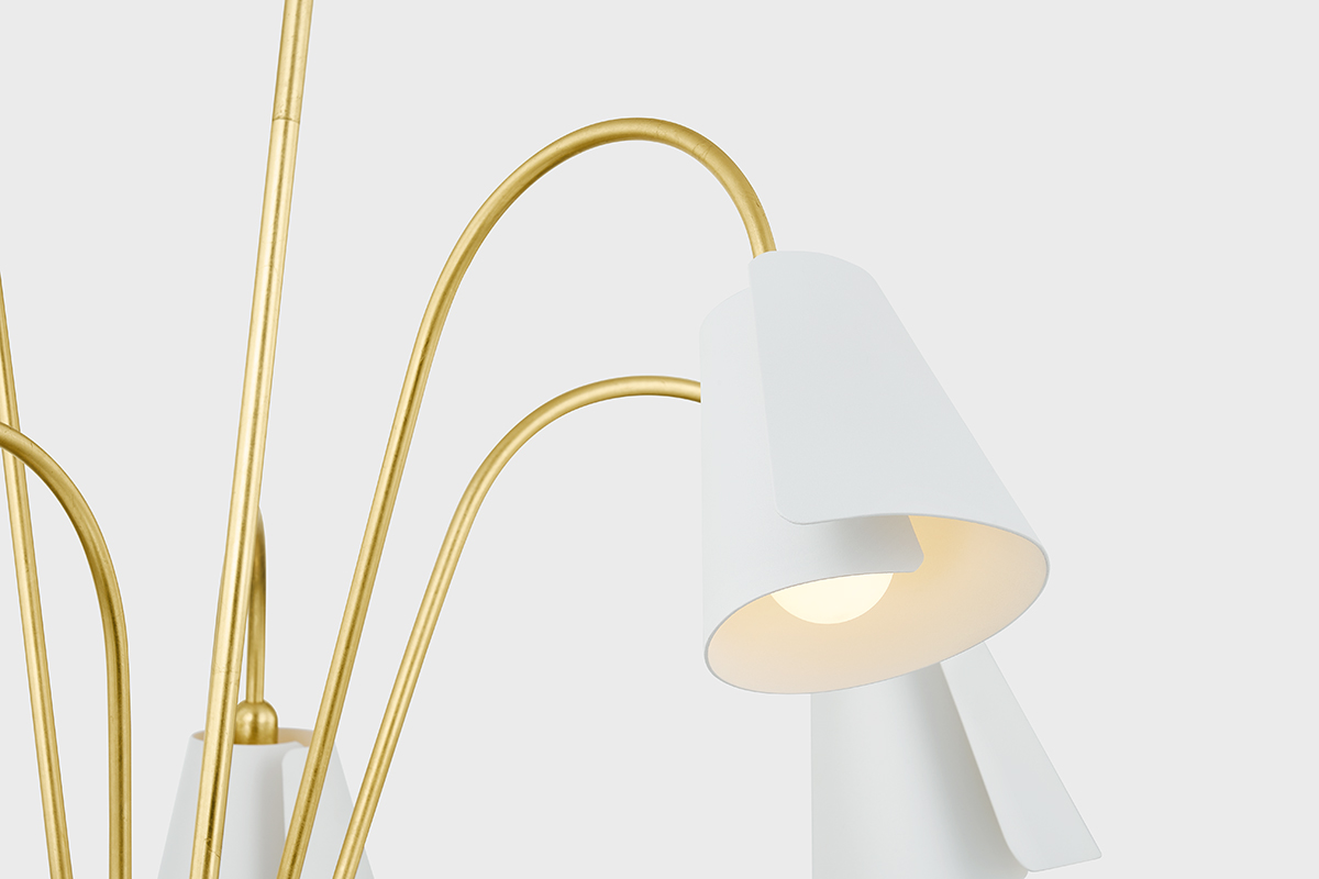 A spray of flower forms elegantly springs from the striking Lila. Reminiscent of a simplified calla lily bud, each bloom is defined by a coiled metal shade in a Textured White finish, supported by Gold Leaf ‘stems. Arranged at varying heights, the arched flowers create a sense of dynamism within the fixture. Available as a chandelier or sconce, Lila is a joyful celebration of curved edges and vintage silhouettes.