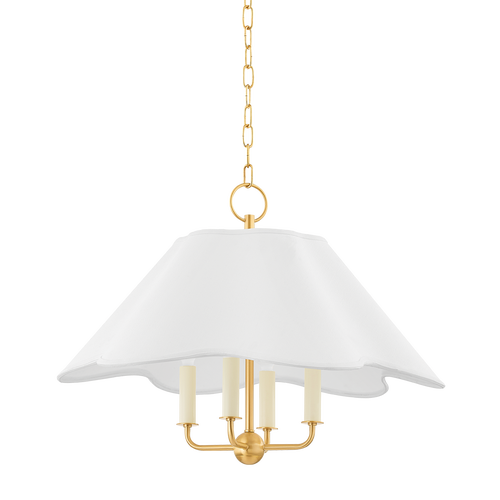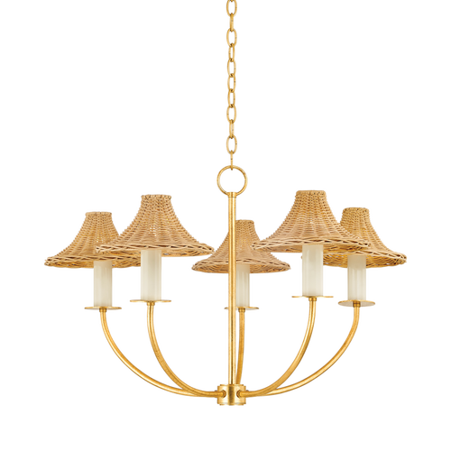 Arwen offers a playful twist on a classic half-dome chandelier. The candle array is shaded in natural rattan wicker, intricately woven to allow light to peak through.  The effect is a fresh take on a traditional style, accented in sleek Aged Brass metalwork.