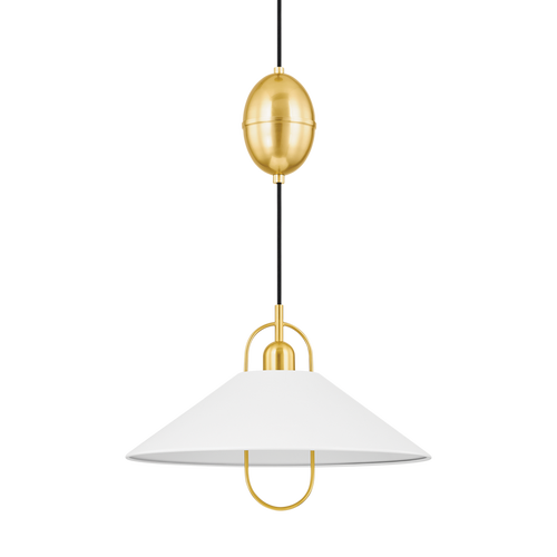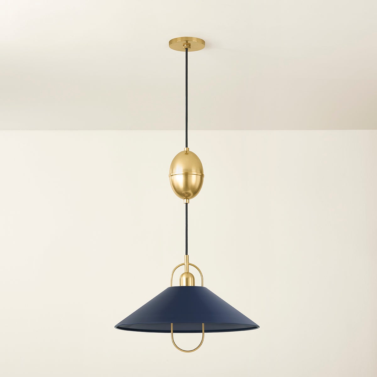 In a modernization of a traditional style, the shaded silhouette of Mariel utilizes the harp holding the metal shade as a design detail. The curve of the harp complements the socket cup with a halo-like effect. A rounded finial in Aged Brass provides a finishing touch on top of the shade, which comes in a Soft Navy or Soft White hue.