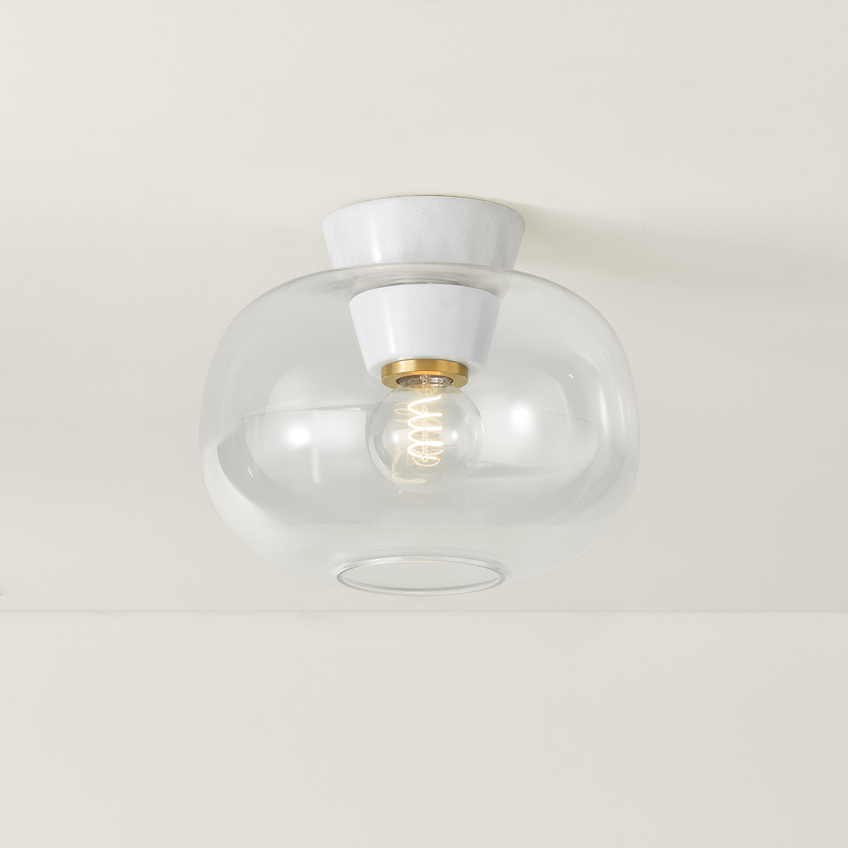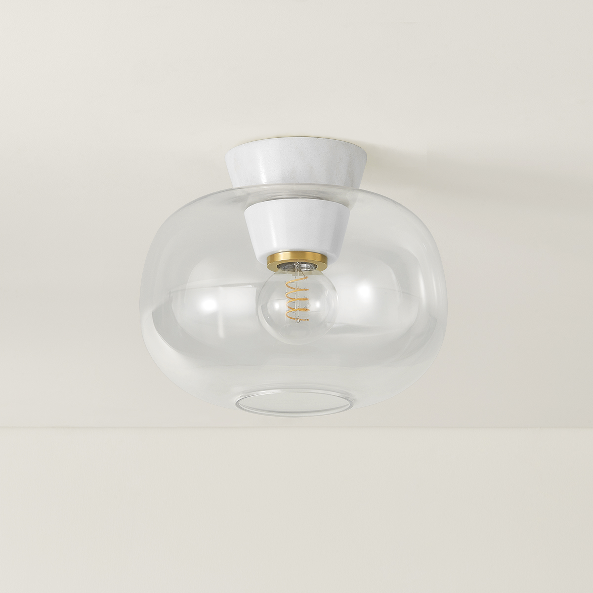 A marriage of opposing materials, this sculptural flush mount features a honed Thasos marble canopy, which creates the illusion of piercing through a soft glass shade. The bubble-like nature of the clear glass swells around the light source. Accessible, yet with a designer feel, Ariella floats overhead in contemporary bathrooms, bedrooms, and kitchens.