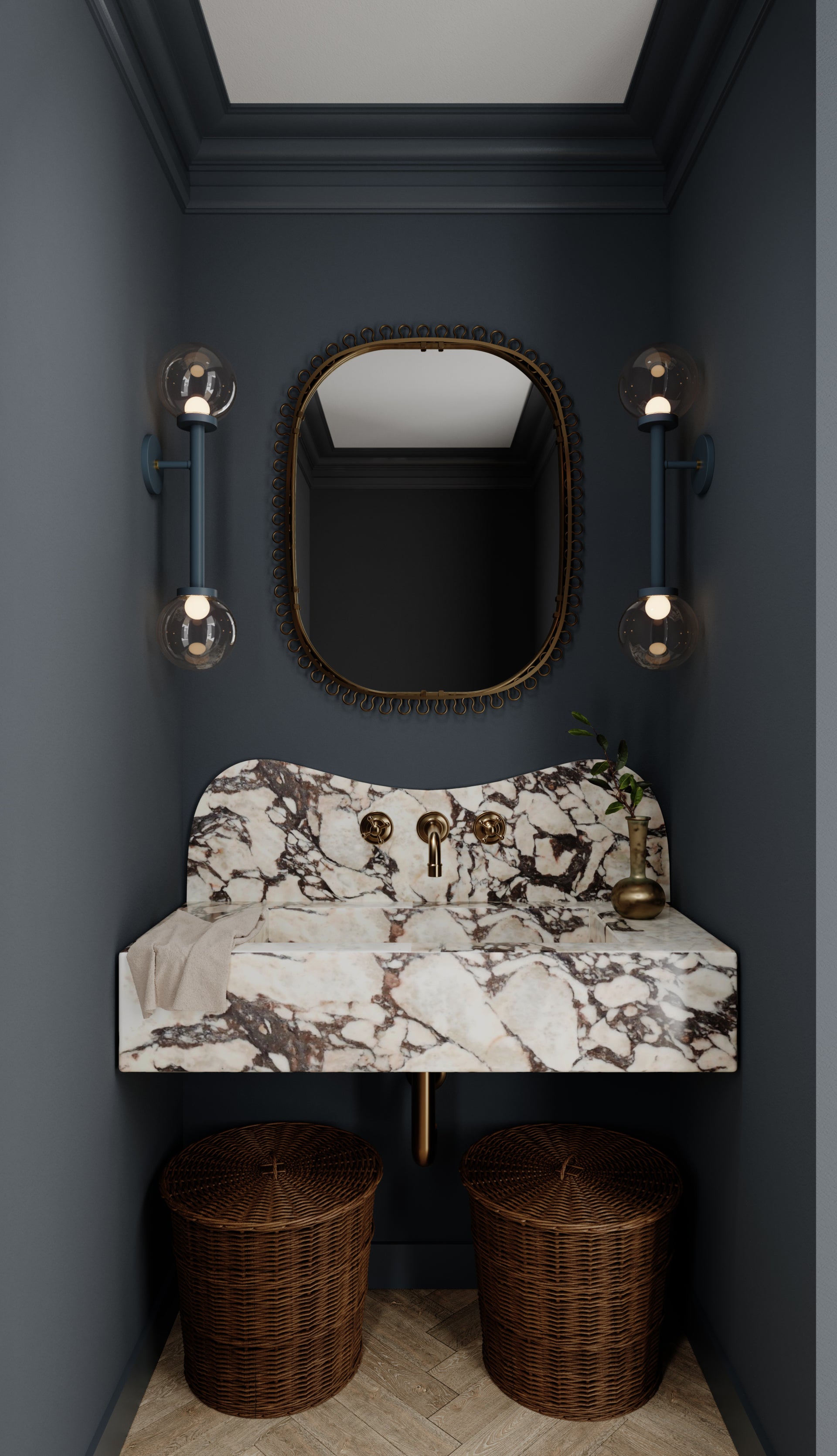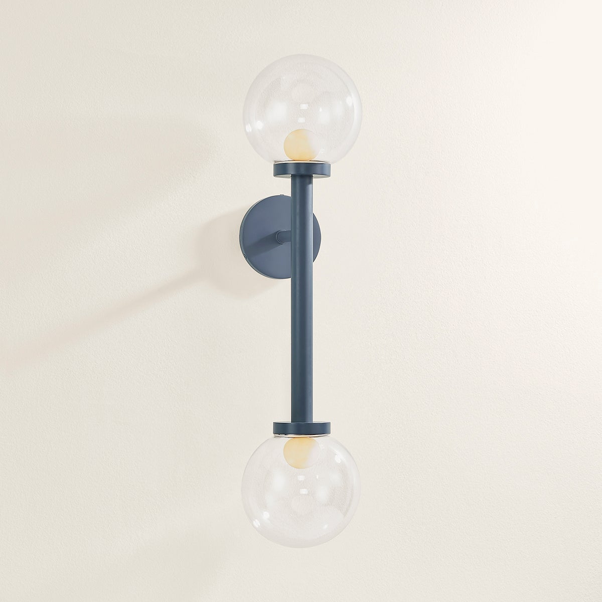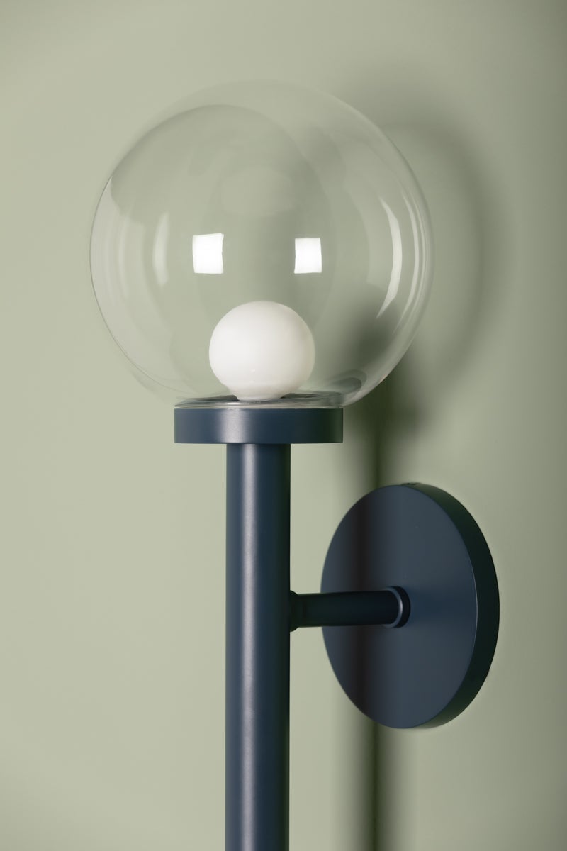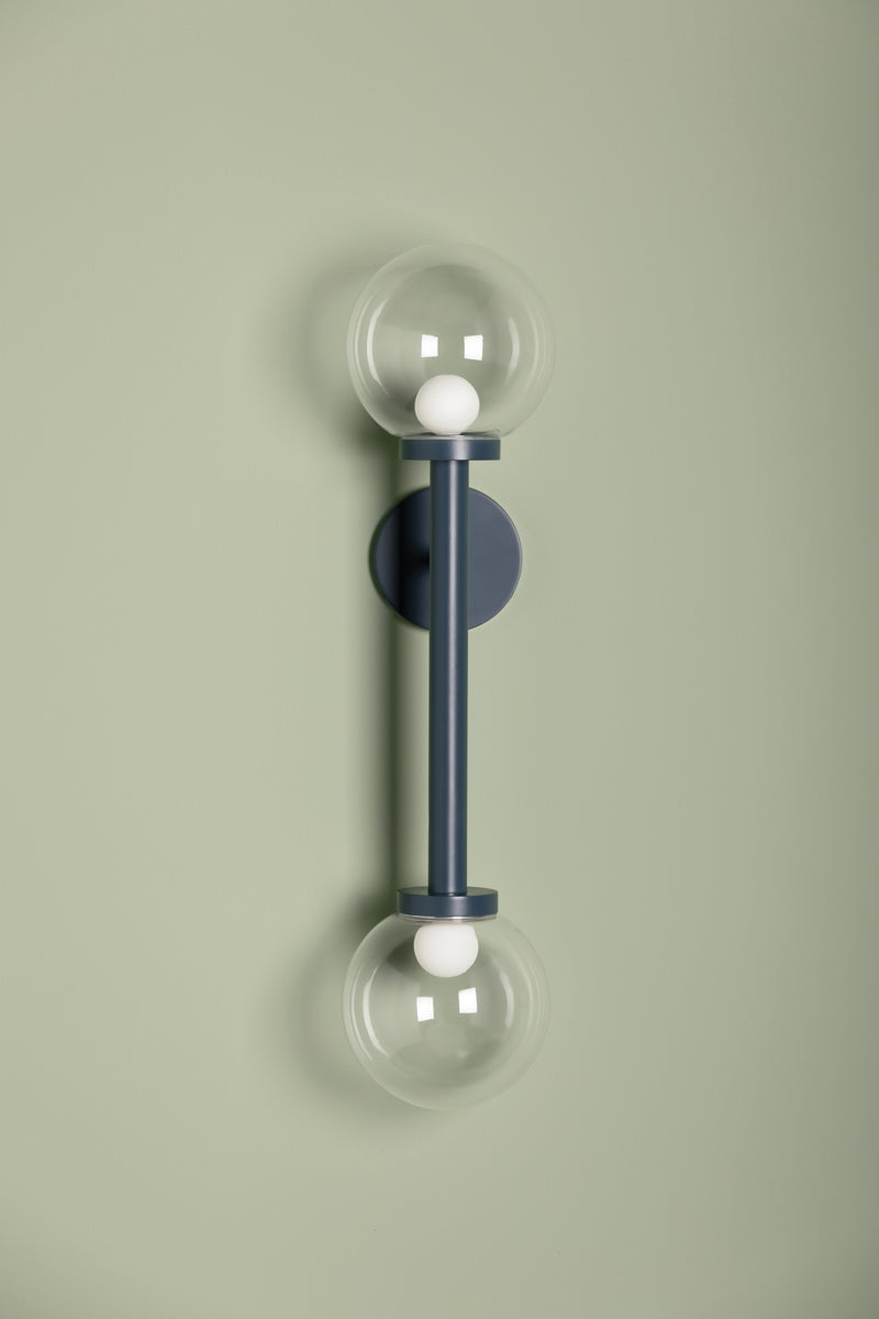 Inspired by a mobile, Sia nods to designs of the 1950s and 60s with its symmetry and bold style. Available as a chandelier or wall sconce, it contrasts the hard and soft elements of bold lines and large Clear Glass orbs. Finished in a cool Slate Blue with an Aged Brass rod, this fixture adds a pop of light and color to kitchens, dining areas, and other living spaces. Part of our Zoe Feldman collection.