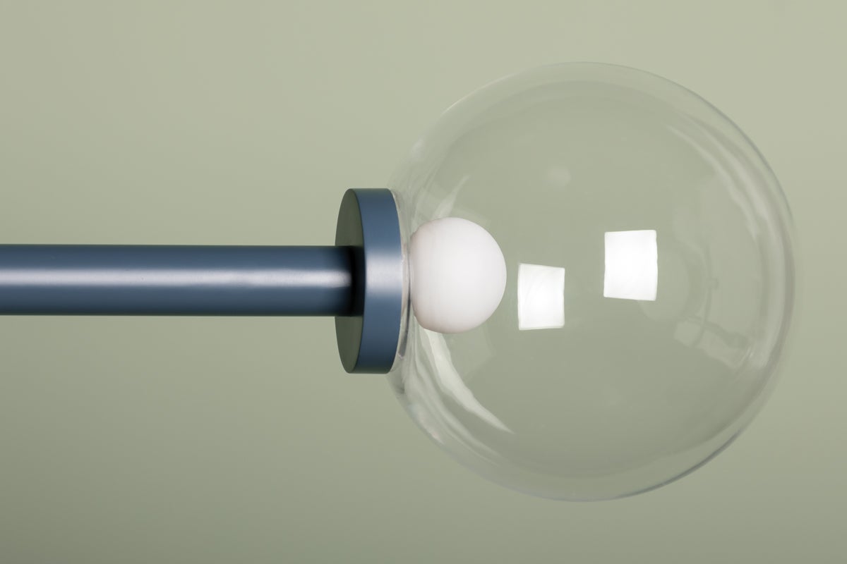 Inspired by a mobile, Sia nods to designs of the 1950s and 60s with its symmetry and bold style. Available as a chandelier or wall sconce, it contrasts the hard and soft elements of bold lines and large Clear Glass orbs. Finished in a cool Slate Blue with an Aged Brass rod, this fixture adds a pop of light and color to kitchens, dining areas, and other living spaces. Part of our Zoe Feldman collection.