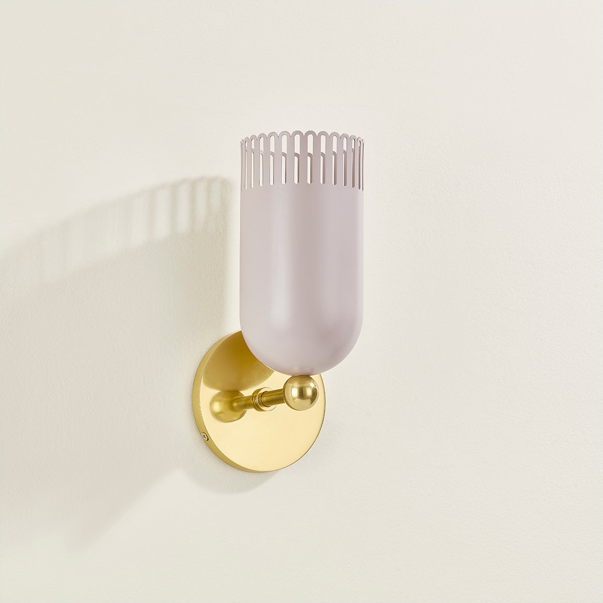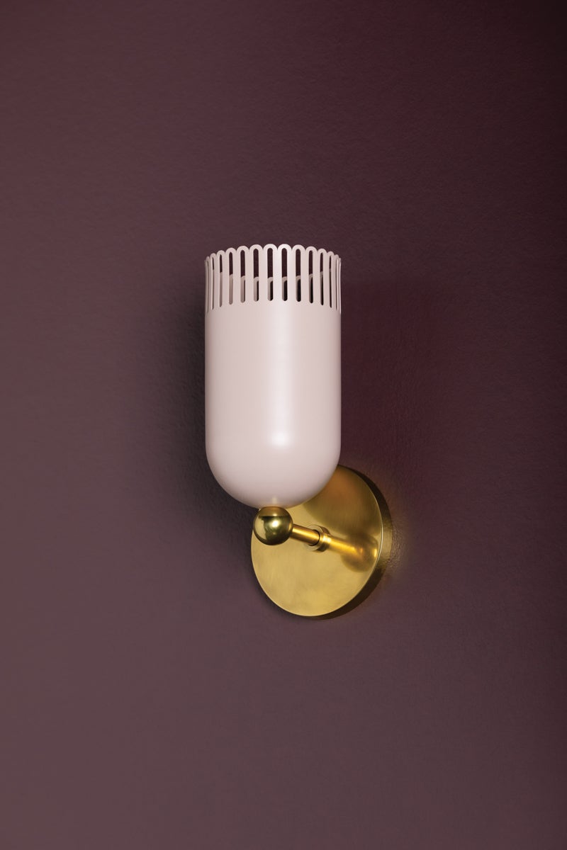 A visual treat, Liba features classic forms updated with eye-catching details. Known for her color sensibility, Zoe Feldman has added a playful touch to this fixture with its unique hue. The warm neutral has a hint of pink that creates a calming, inviting presence which is complemented by the Aged Brass framework. The slender scalloped edges of the fixture allow light to shine through while adding a whimsical note. Available as a 1 or 2-light sconce and a pendant in two sizes, Liba is a thing of beauty. Part of our Zoe Feldman collection.