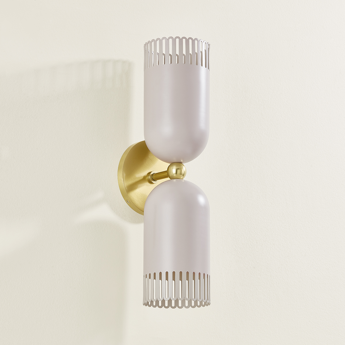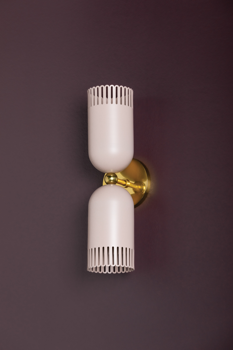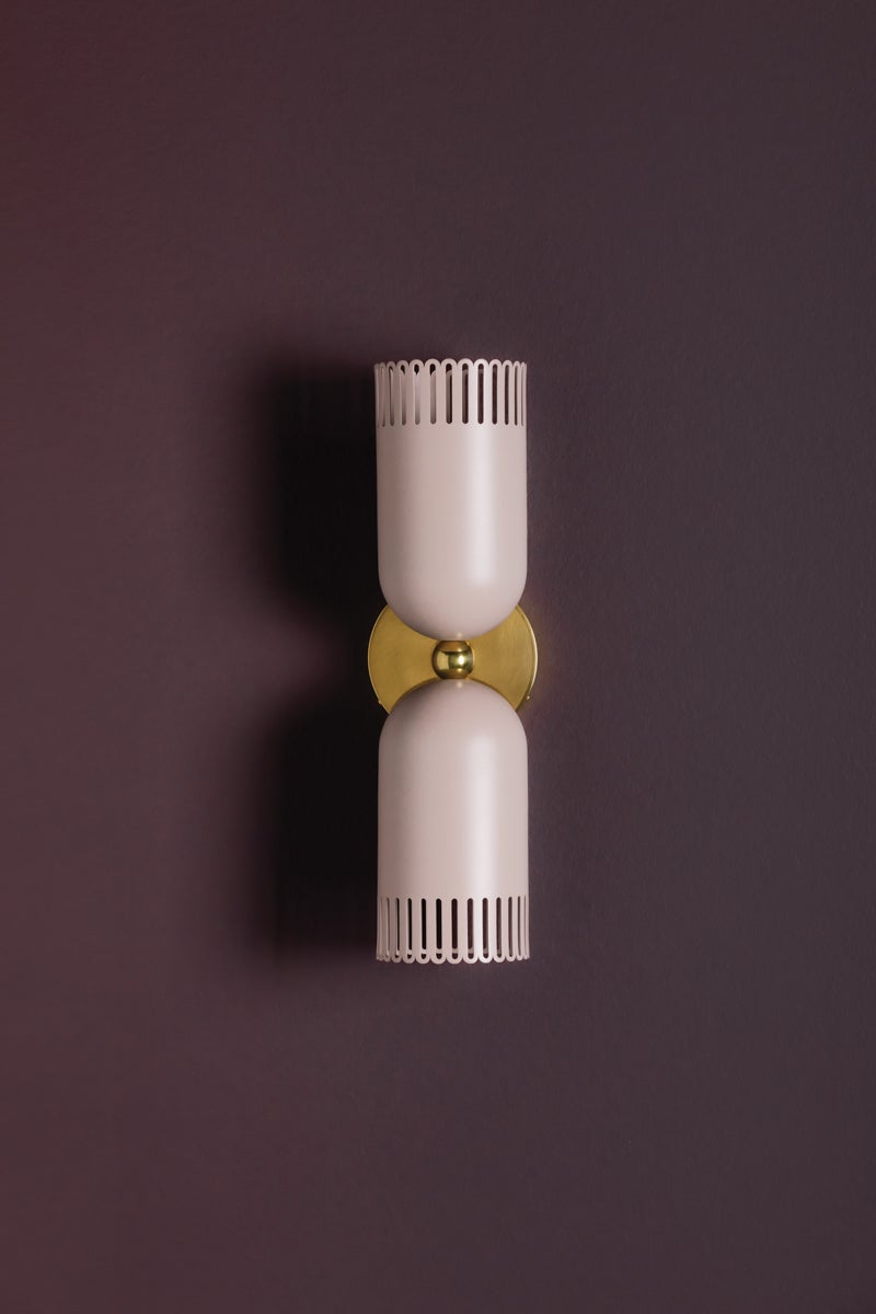 A visual treat, Liba features classic forms updated with eye-catching details. Known for her color sensibility, Zoe Feldman has added a playful touch to this fixture with its unique hue. The warm neutral has a hint of pink that creates a calming, inviting presence which is complemented by the Aged Brass framework. The slender scalloped edges of the fixture allow light to shine through while adding a whimsical note. Available as a 1 or 2-light sconce and a pendant in two sizes, Liba is a thing of beauty. Part of our Zoe Feldman collection.