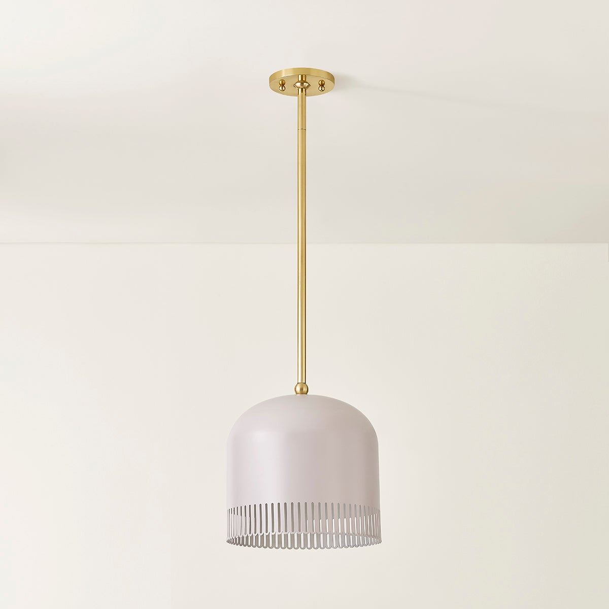 A visual treat, Liba features classic forms updated with eye-catching details. Known for her color sensibility, Zoe Feldman has added a playful touch to this fixture with its unique hue. The warm neutral has a hint of pink that creates a calming, inviting presence which is complemented by the Aged Brass framework. The slender scalloped edges of the fixture allow light to shine through while adding a whimsical note. Available as a 1 or 2-light sconce and a pendant in two sizes, Liba is a thing of beauty. Part of our Zoe Feldman collection.