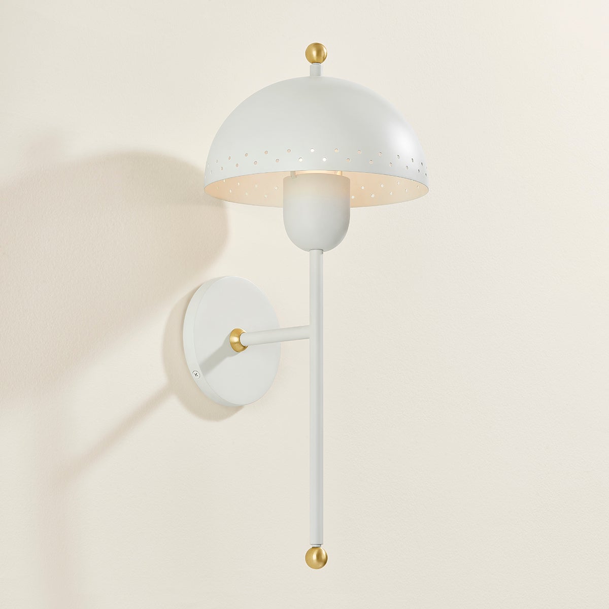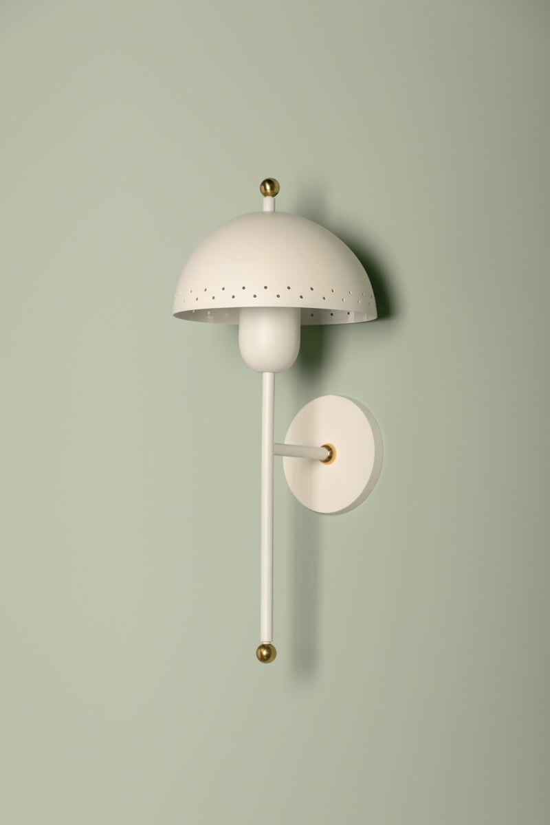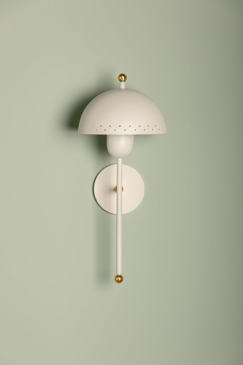 Influenced by midcentury design, Jojo features a dome-shaped shade with decorative perforations that allow light to escape. Both the pendant and sconce come in a Soft White finish while the lamp is available in a moody green as an eye-catching accent piece. The pendant features 2 lights within its bowl, optimizing illumination. All variations are elegantly accented in Aged Brass. Part of our Zoe Feldman collection.