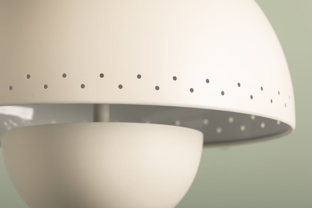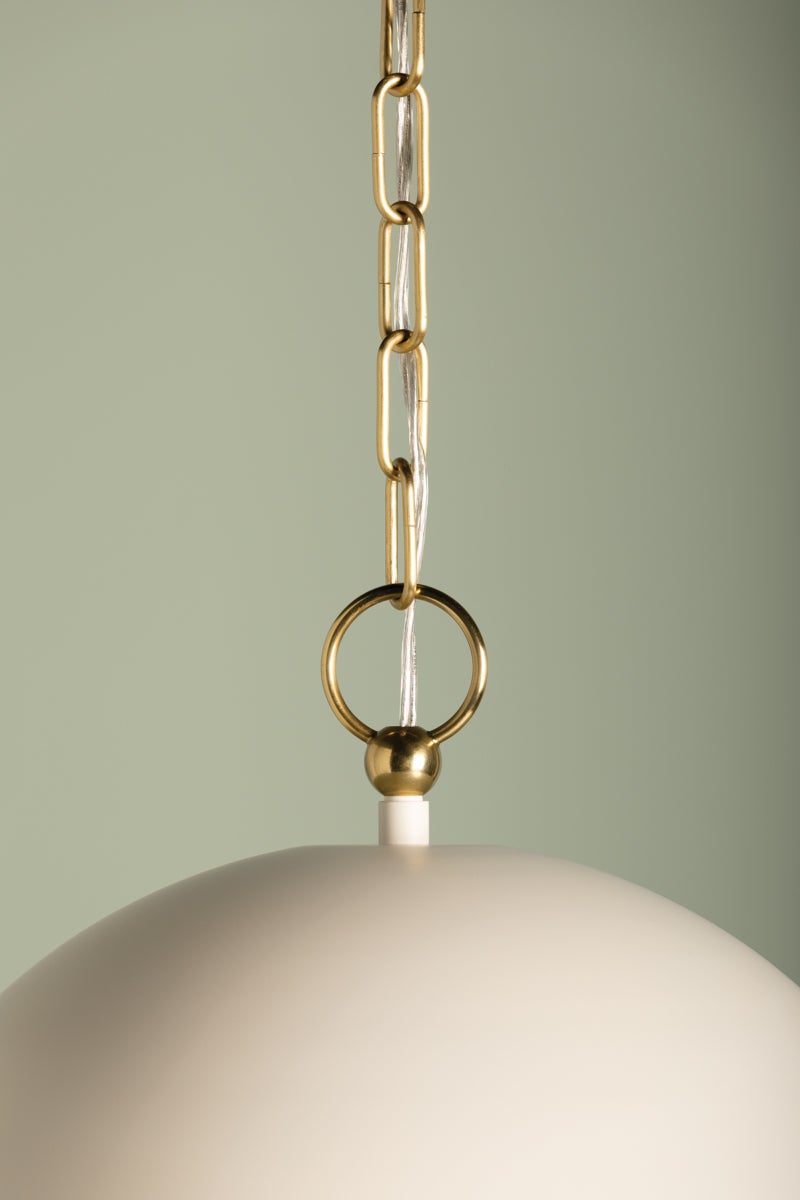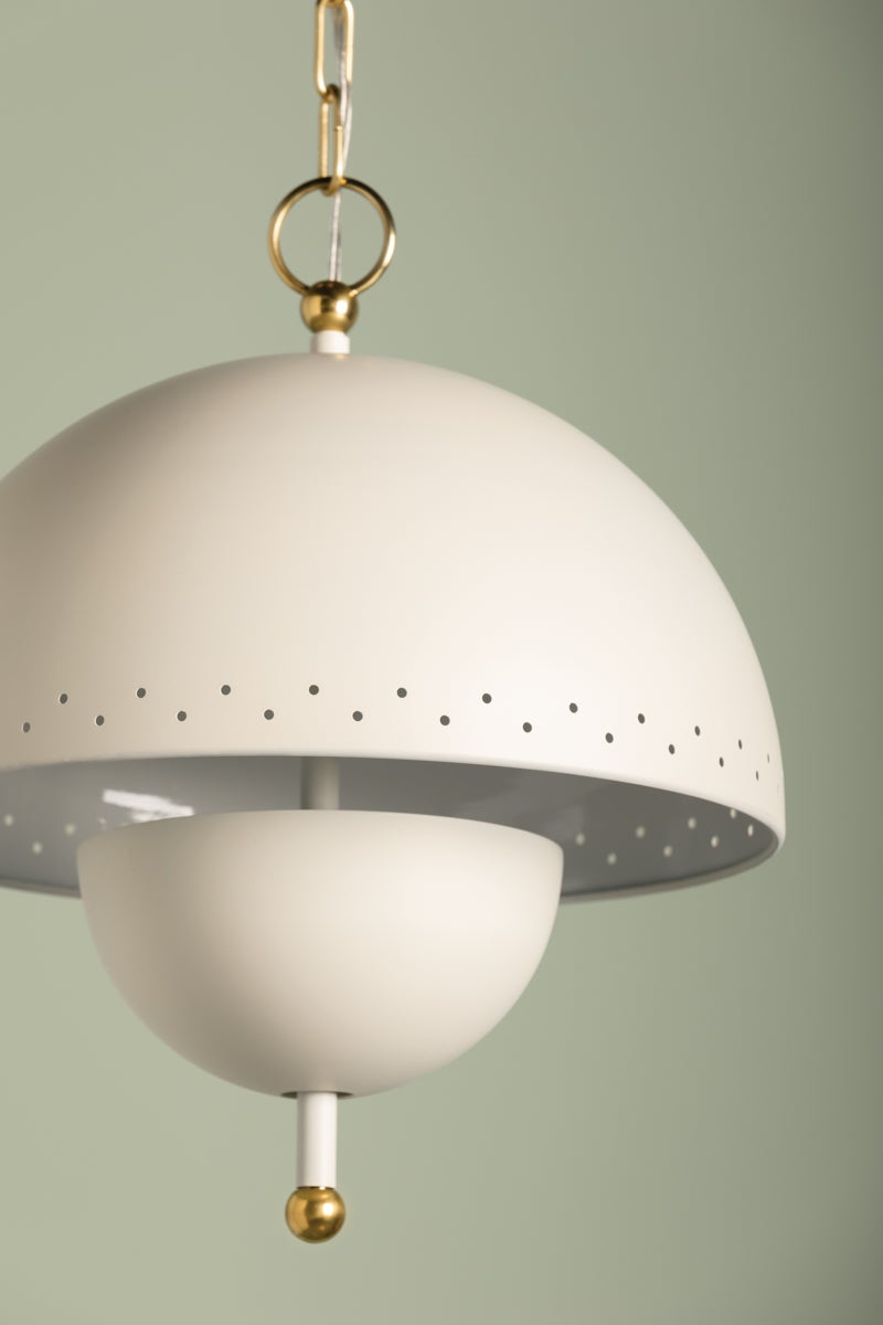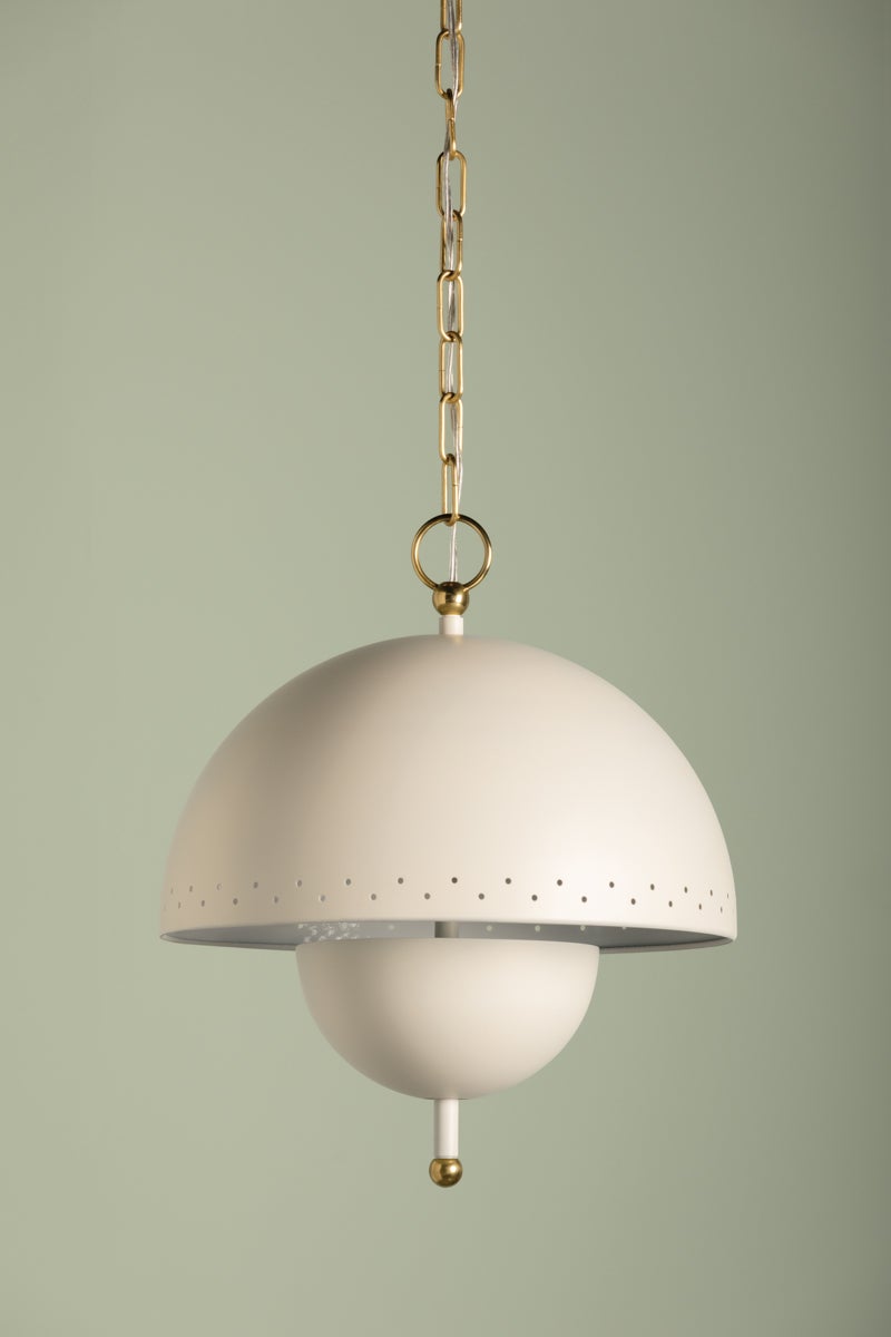 Influenced by midcentury design, Jojo features a dome-shaped shade with decorative perforations that allow light to escape. Both the pendant and sconce come in a Soft White finish while the lamp is available in a moody green as an eye-catching accent piece. The pendant features 2 lights within its bowl, optimizing illumination. All variations are elegantly accented in Aged Brass. Part of our Zoe Feldman collection.
