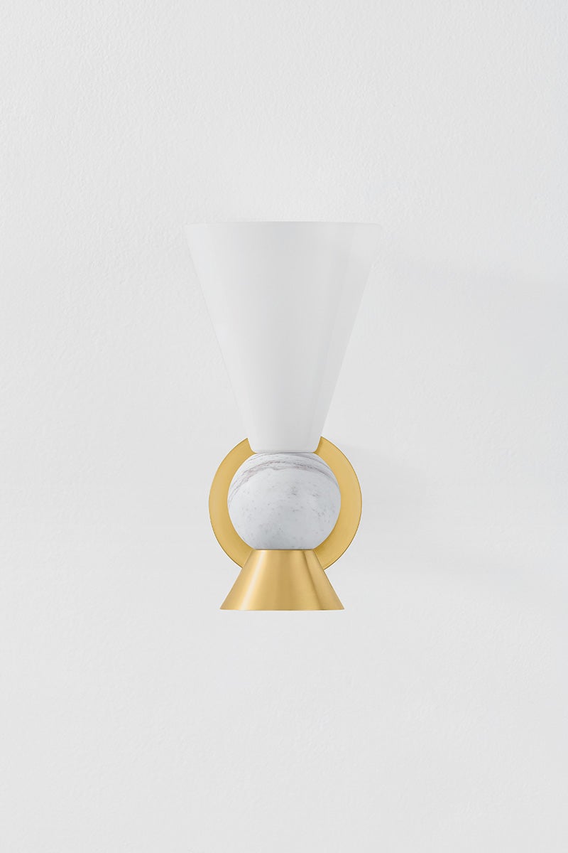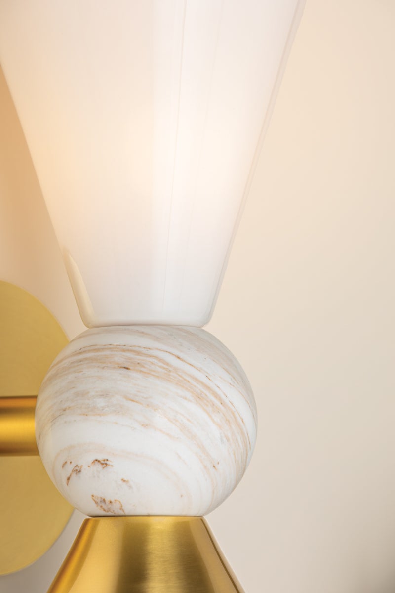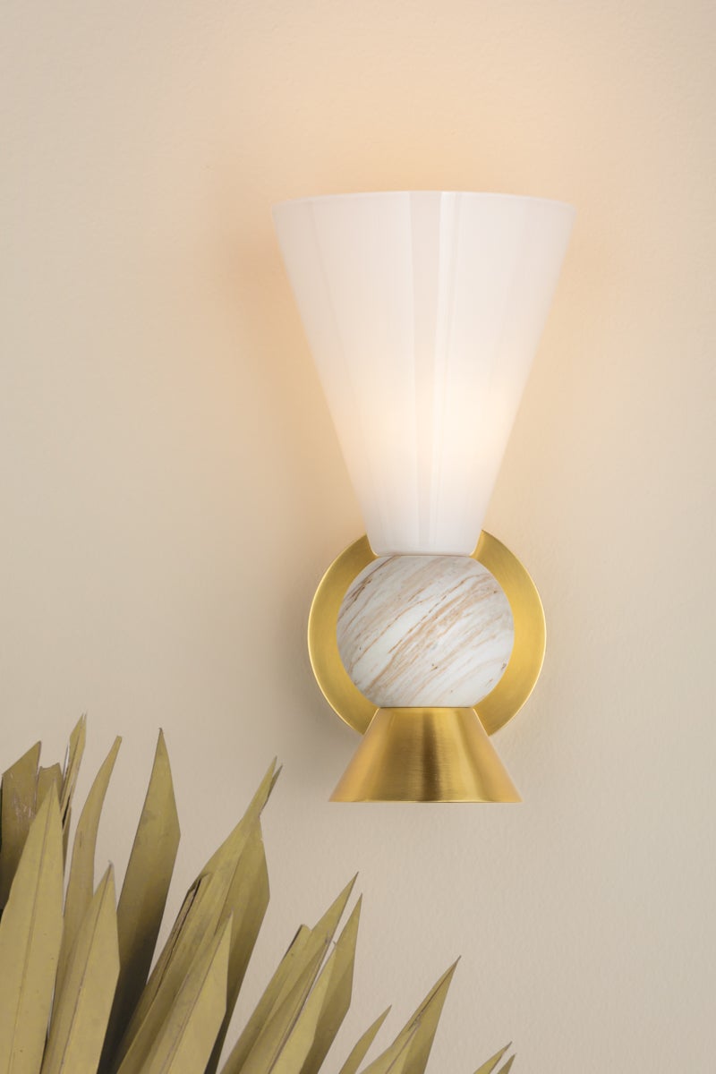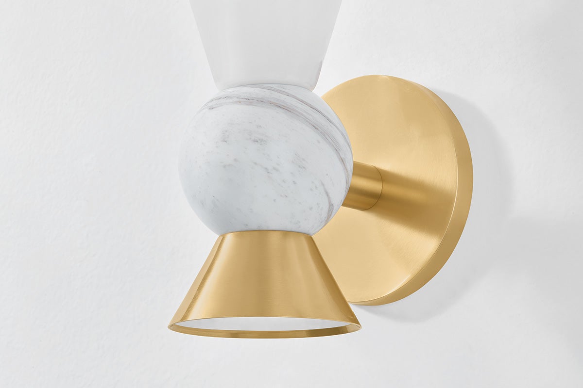 Simple yet elevated, the totemic silhouette of Mona makes a playful first impression. Stacked between a large opal shiny glass shade and a tapered Aged Brass cuff is a striking Calacatta gold marble sphere. When viewed from the front, the Aged Brass back panel encircles the marble like a halo, completing the puzzle-like composition. Part of our Megan Molten x Mitzi Tastemakers collection.