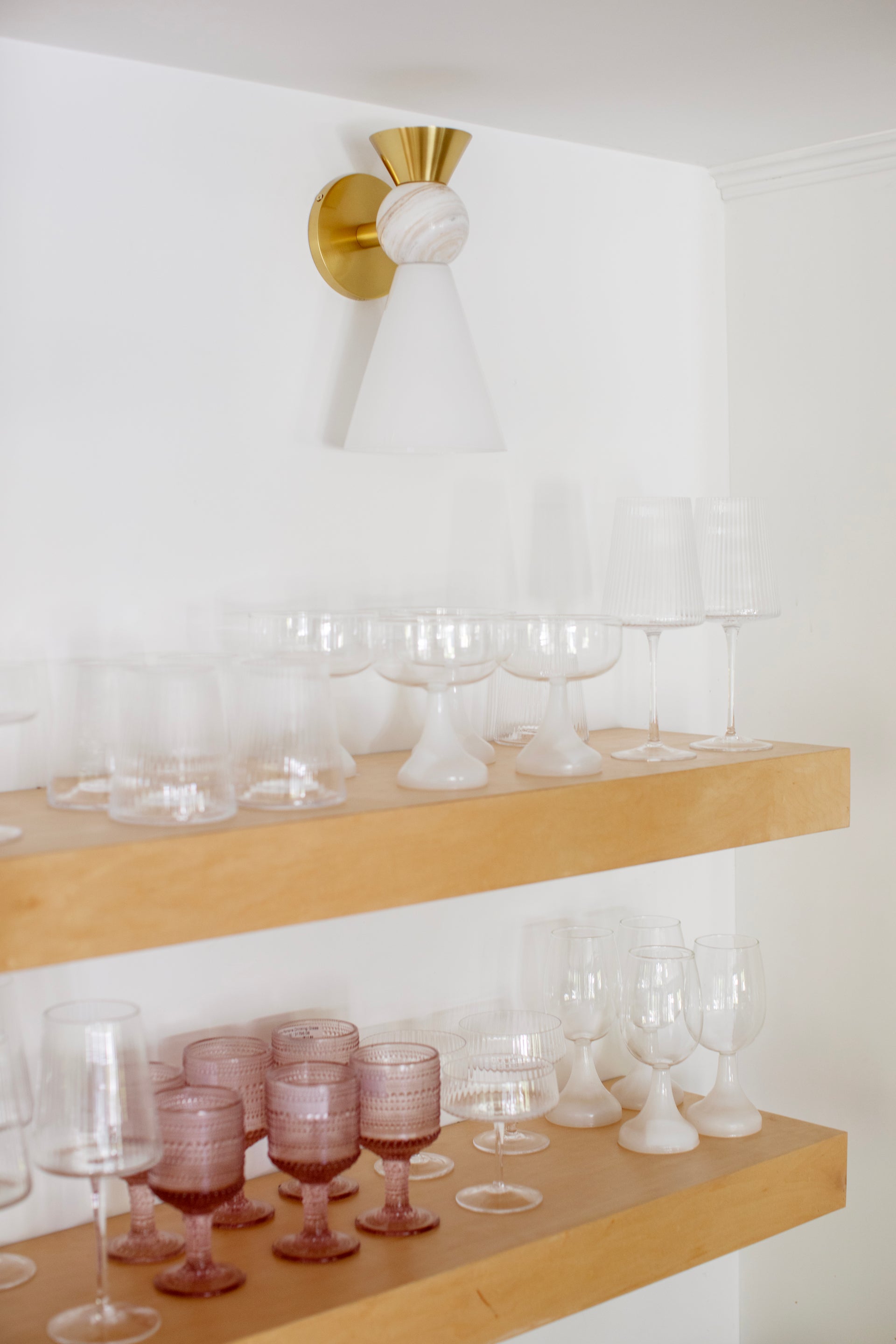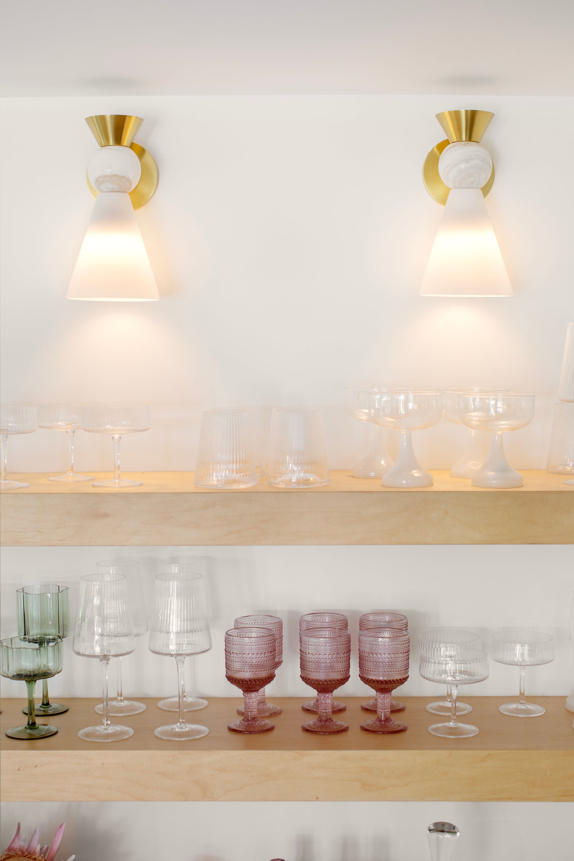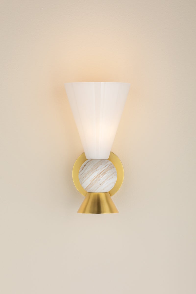 Simple yet elevated, the totemic silhouette of Mona makes a playful first impression. Stacked between a large opal shiny glass shade and a tapered Aged Brass cuff is a striking Calacatta gold marble sphere. When viewed from the front, the Aged Brass back panel encircles the marble like a halo, completing the puzzle-like composition. Part of our Megan Molten x Mitzi Tastemakers collection.