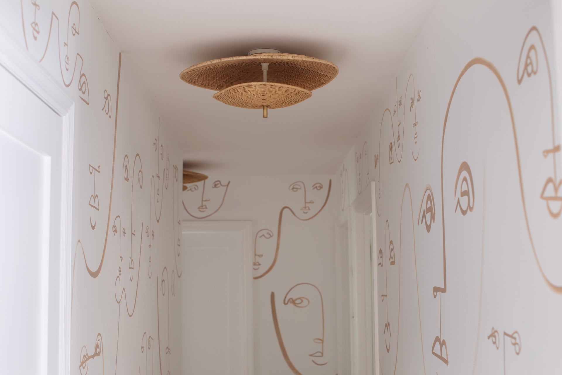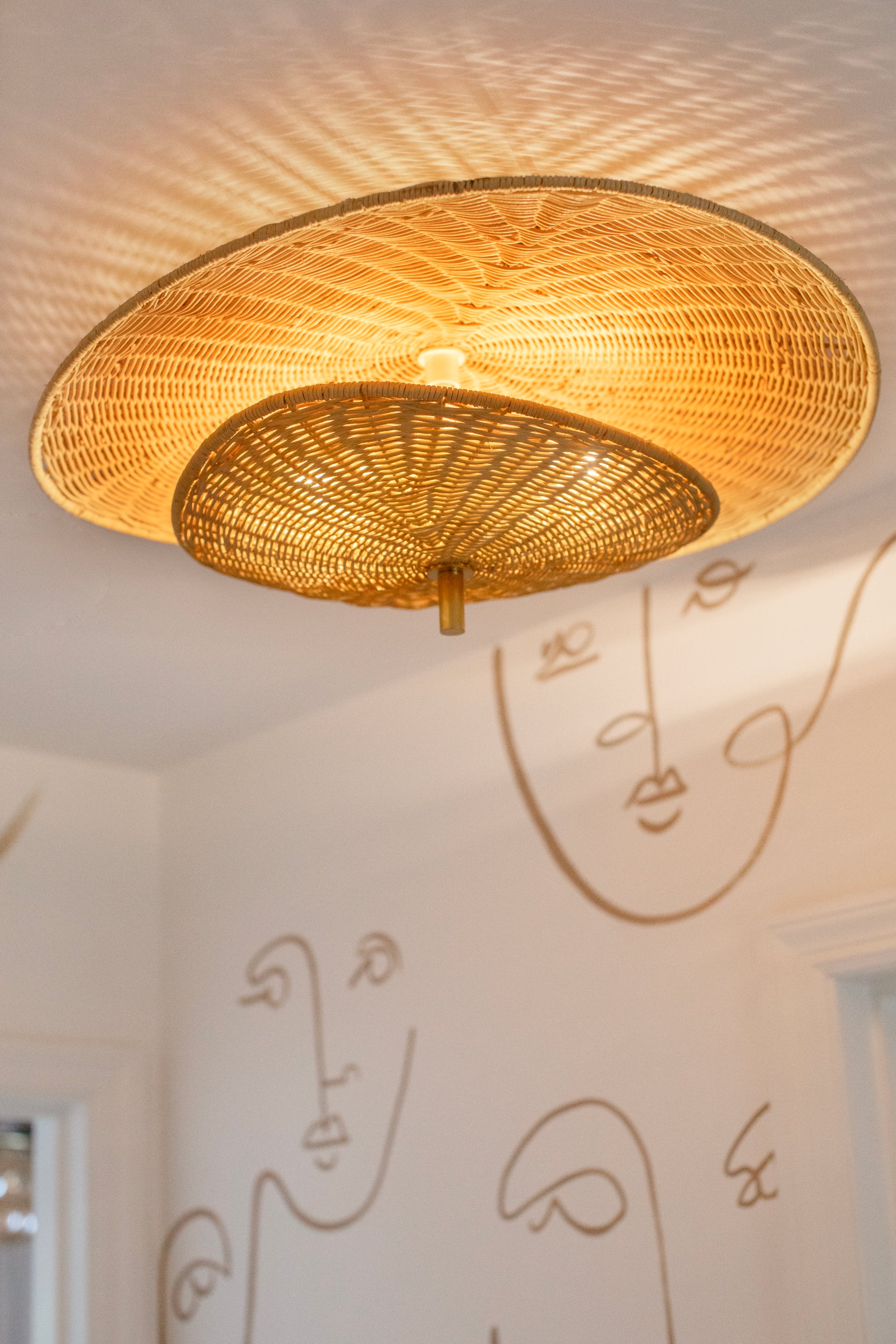 Two softly triangular shades are layered to create this organic-inspired flush mount. A glow emanates from the space between the shades, filtering through the warm natural rattan wicker. An Aged Brass rod pierces through the fixture, creating a sleek point of contrast to the floaty forms. Part of our Megan Molten x Mitzi Tastemakers collection.