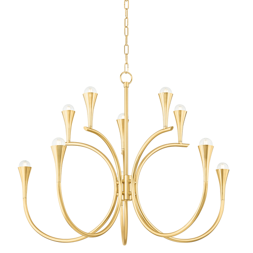 A modern interpretation of an Art Deco chandelier, Aviana makes a dramatic statement. Trumpeting metal shades rise from a swooping frame, filling both vertical and horizontal space with light. The airy, graceful arms feel almost musical, lending this chandelier a dynamic and joyful quality.