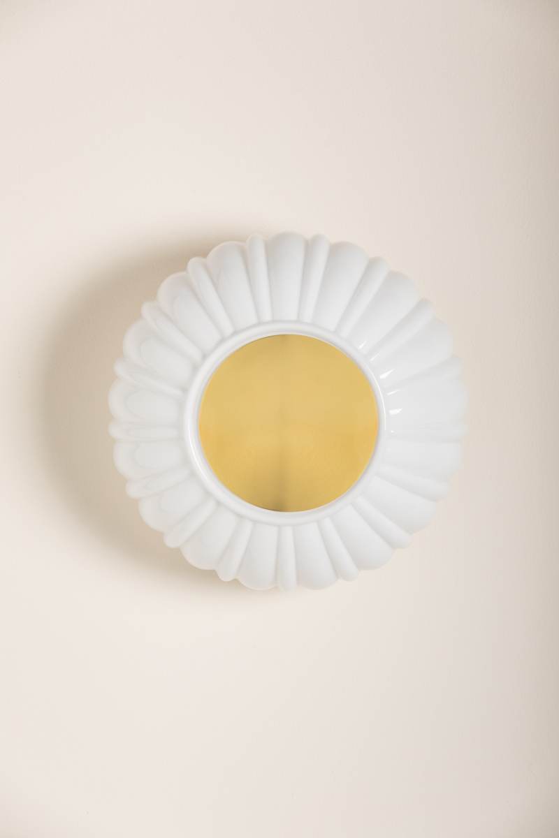 Recalling Art Deco designs, this decorative flush mount features a large Opal Shiny Glass shade with fluted edges. The metalwork is finished in timeless Aged Brass, adding a luxurious note. Anne provides warm illumination to a living room, bedroom, or office space. Part of our Zoe Feldman collection.