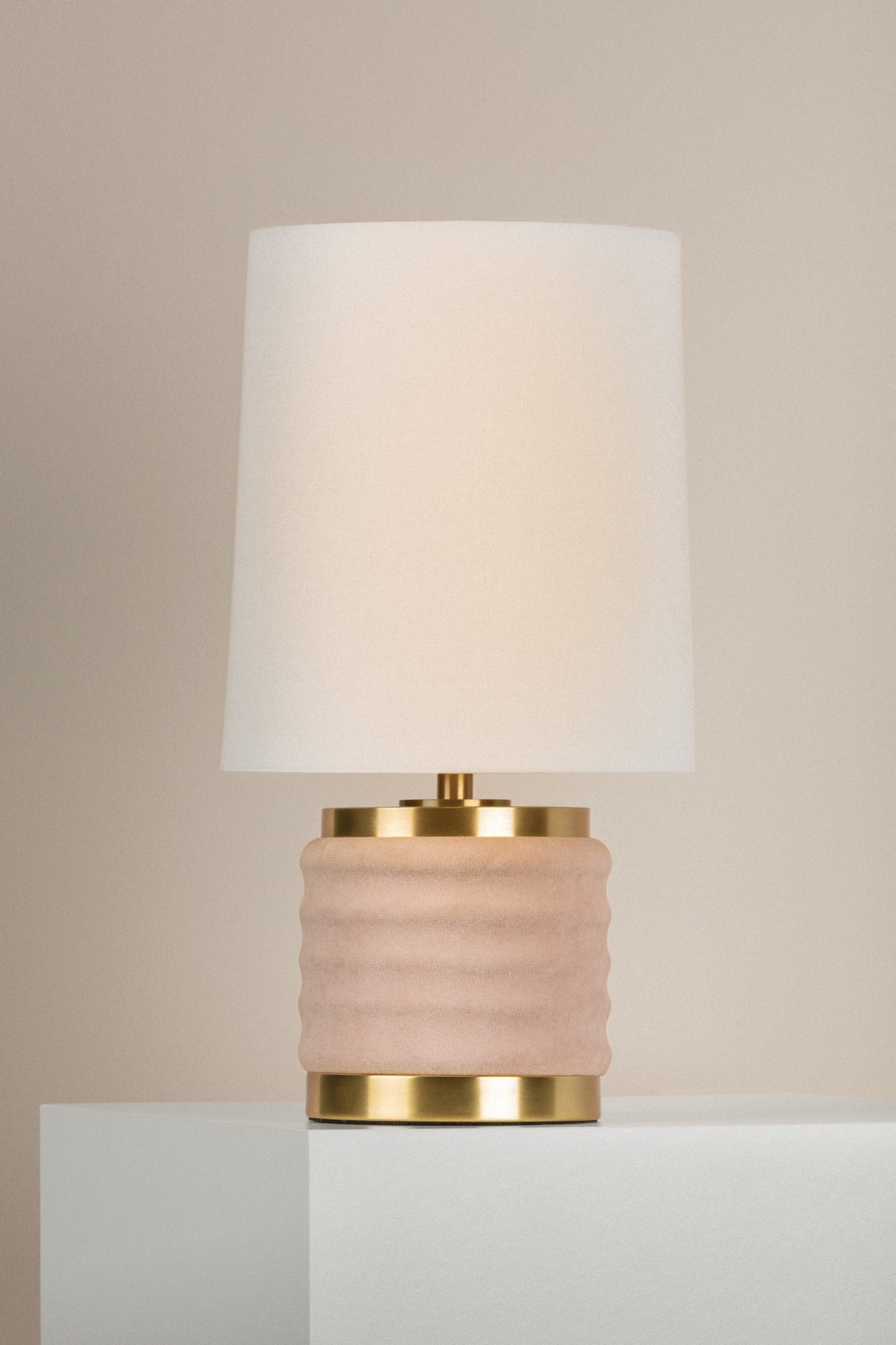 Our velvet crush, Bethany gives us 90s nostalgia with a prim and proper twist. Petite and playful, Bethany features soft, velvet curves covered in rosy blush or dark teal. A tapered linen shade and aged brass finish polish things up, priming Bethany for any seat in the house.