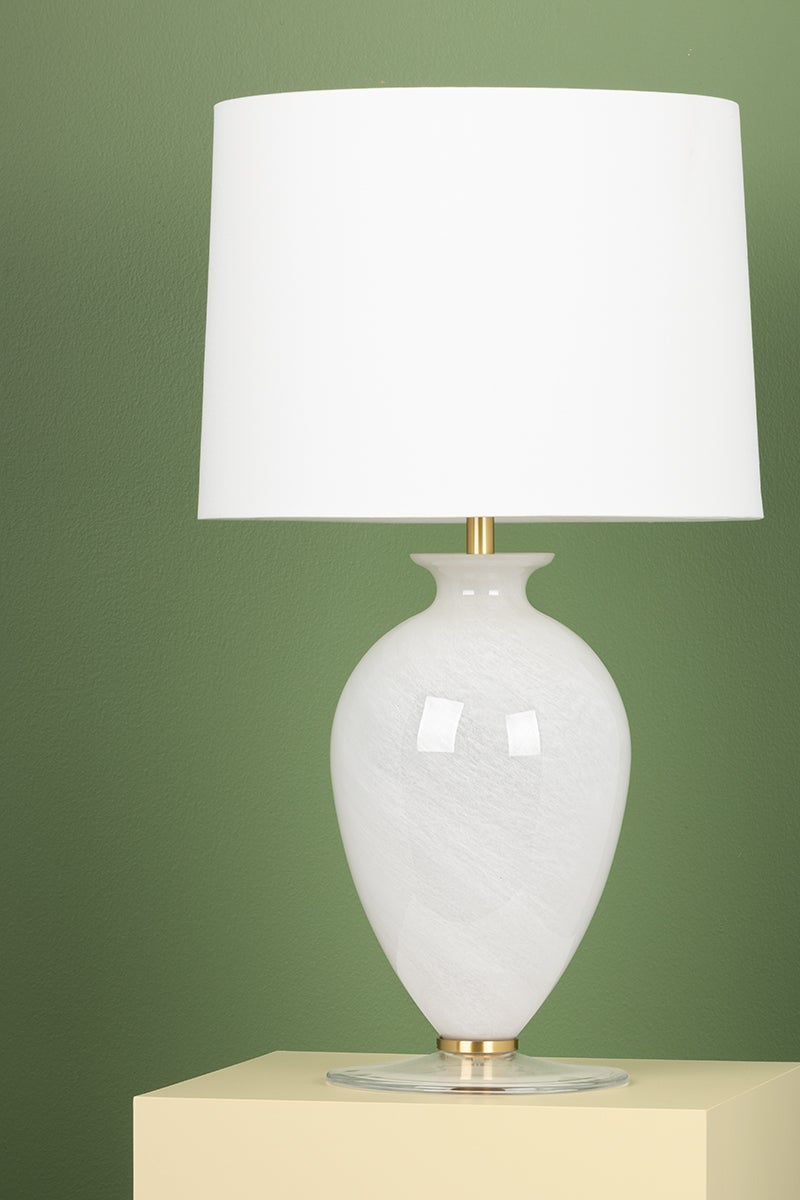 Laney gives the classic table lamp silhouette a gorgeous and intriguing update with a cloud glass base. Light fills the white linen drum shade and casts down to give the base a soft, inviting glow. Aged brass details accent the white hues beautifully.