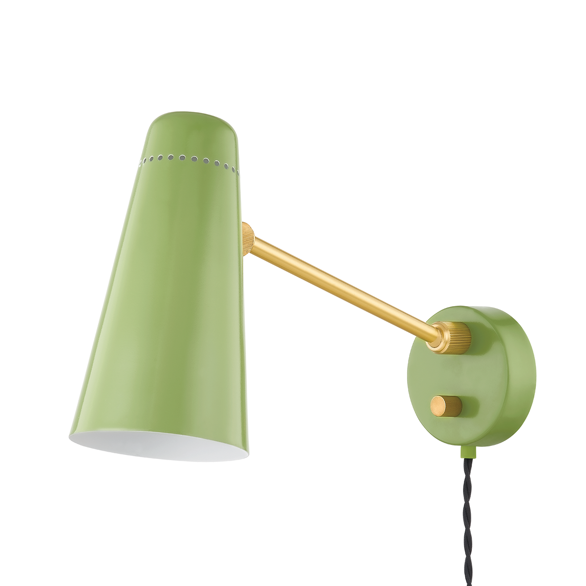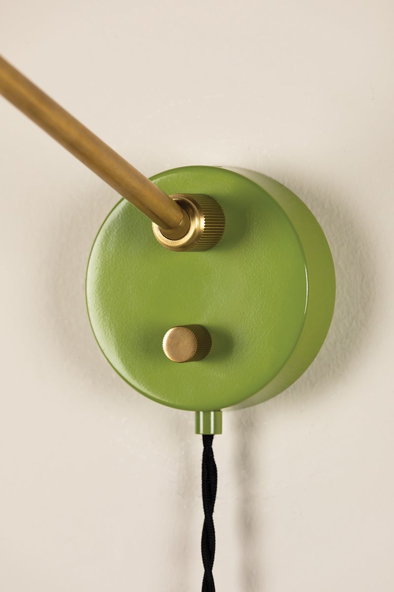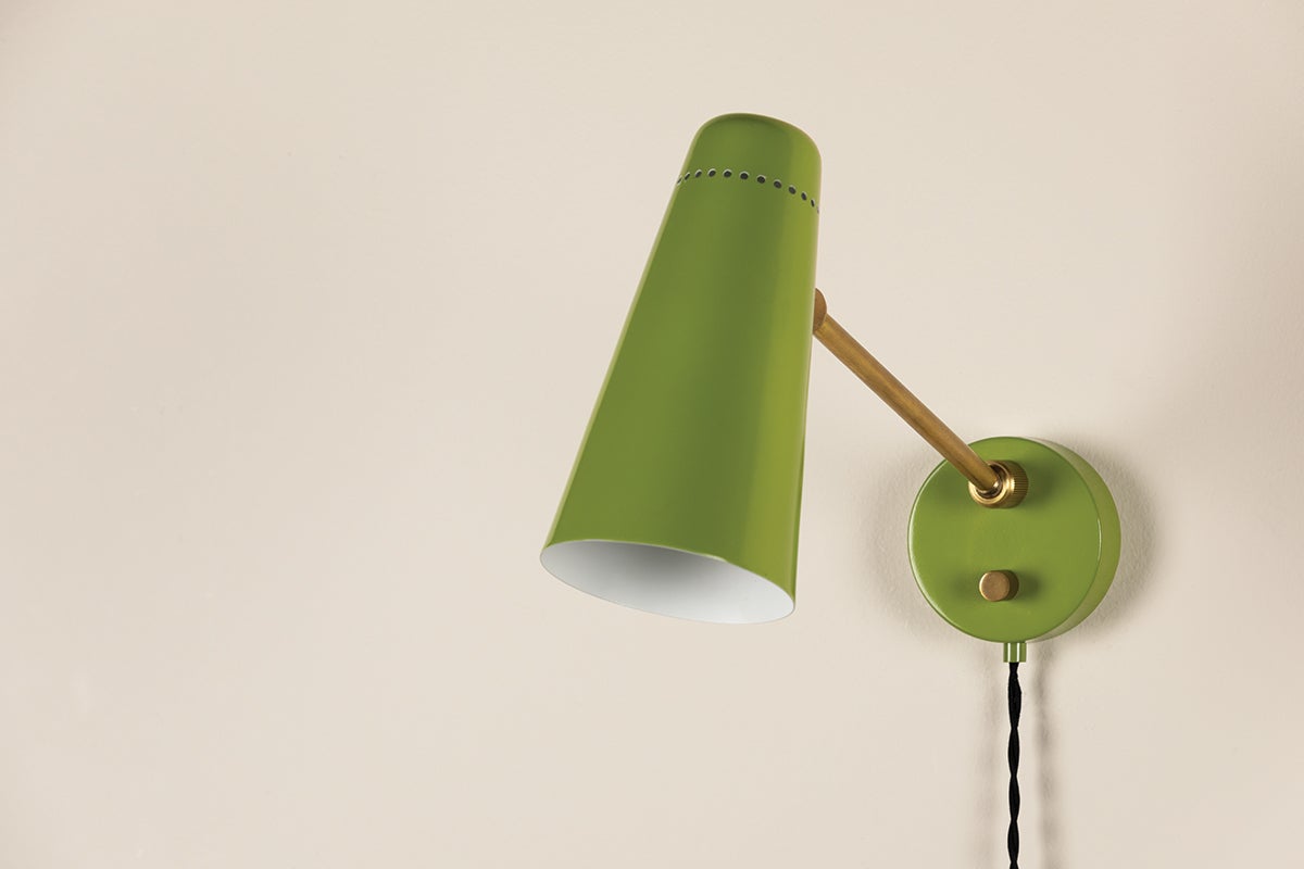 Mid-century references inspired the Alex Wall Sconce, revitalizing a historic design for the modern age. The combination of aged brass and soft green, white, or black finish is simply sublime. From the perforated shade to the etched joints, no detail was overlooked. The plug-in design is completely hassle-free, allowing you to plug into an existing outlet vs. hardwiring.