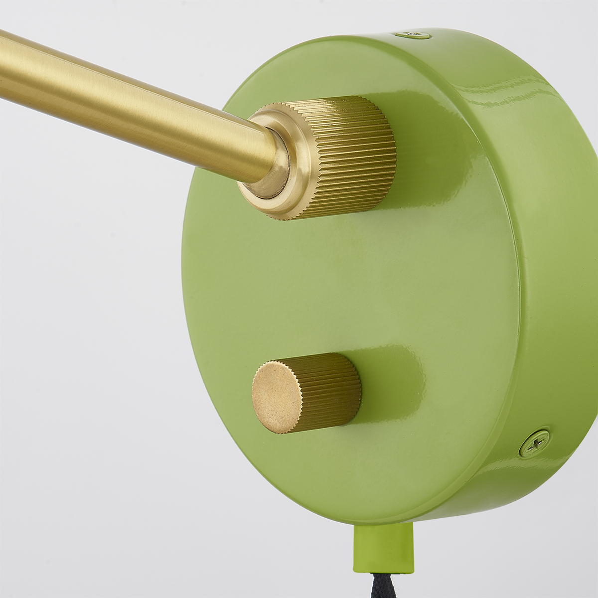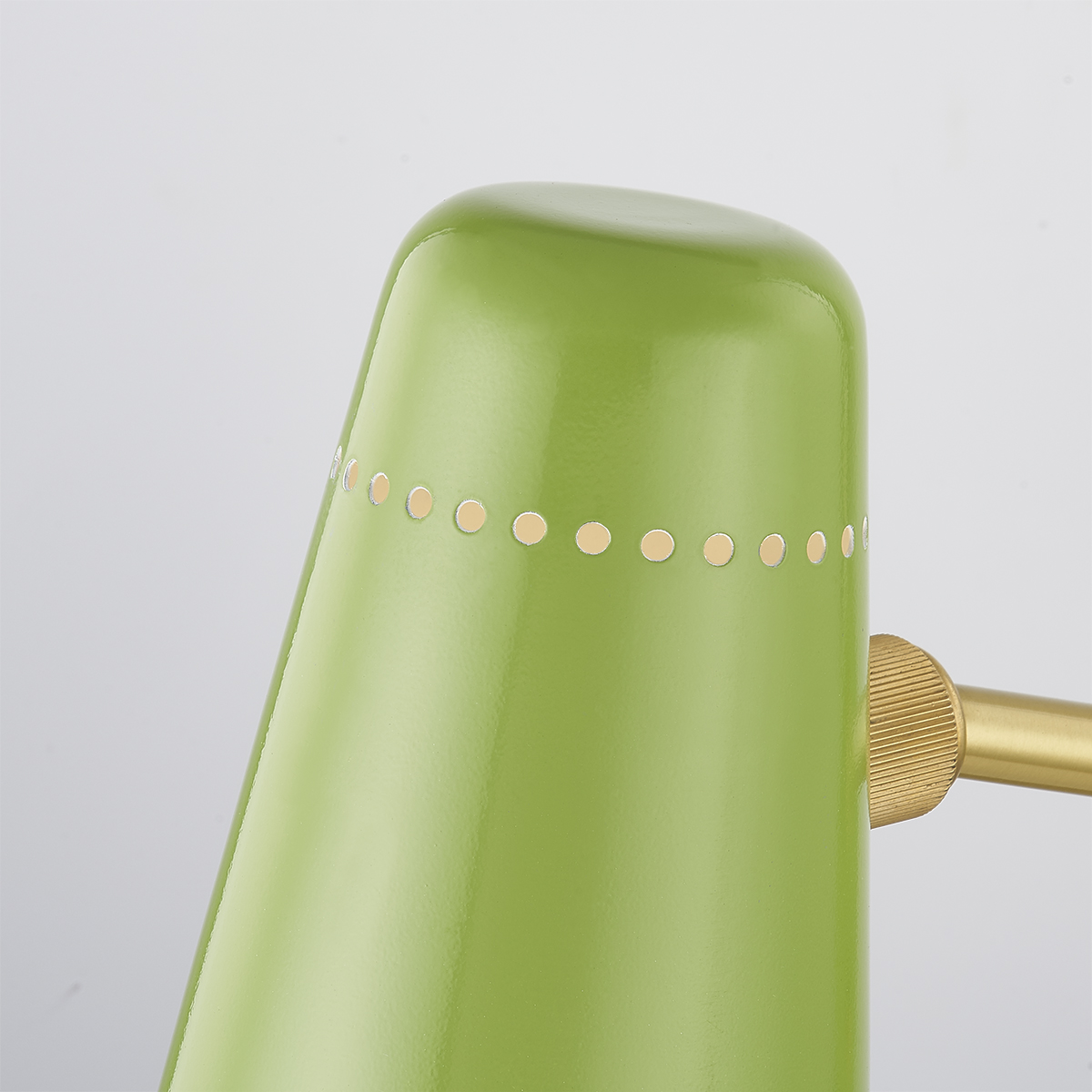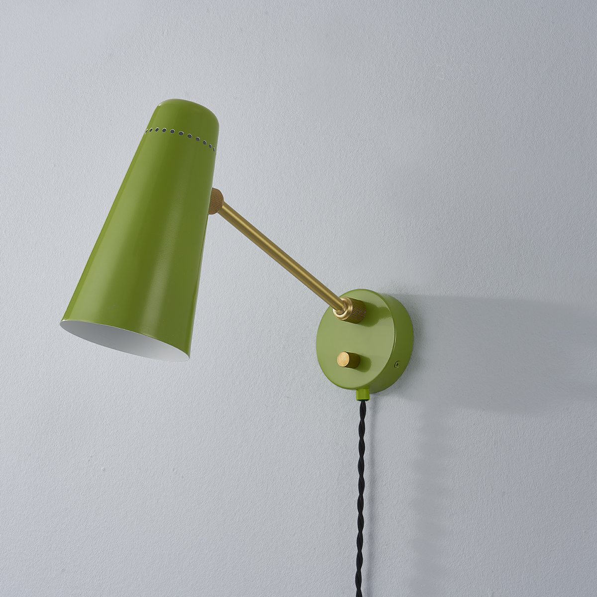 Mid-century references inspired the Alex Wall Sconce, revitalizing a historic design for the modern age. The combination of aged brass and soft green, white, or black finish is simply sublime. From the perforated shade to the etched joints, no detail was overlooked. The plug-in design is completely hassle-free, allowing you to plug into an existing outlet vs. hardwiring.
