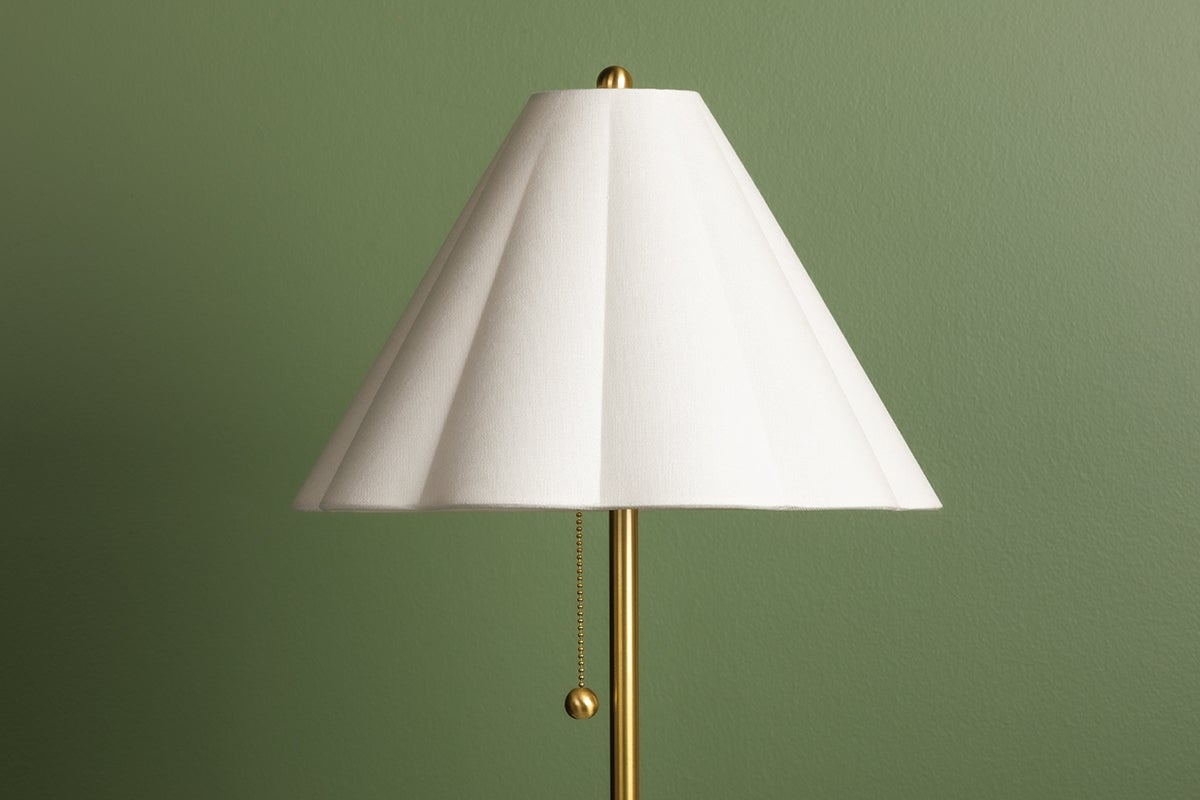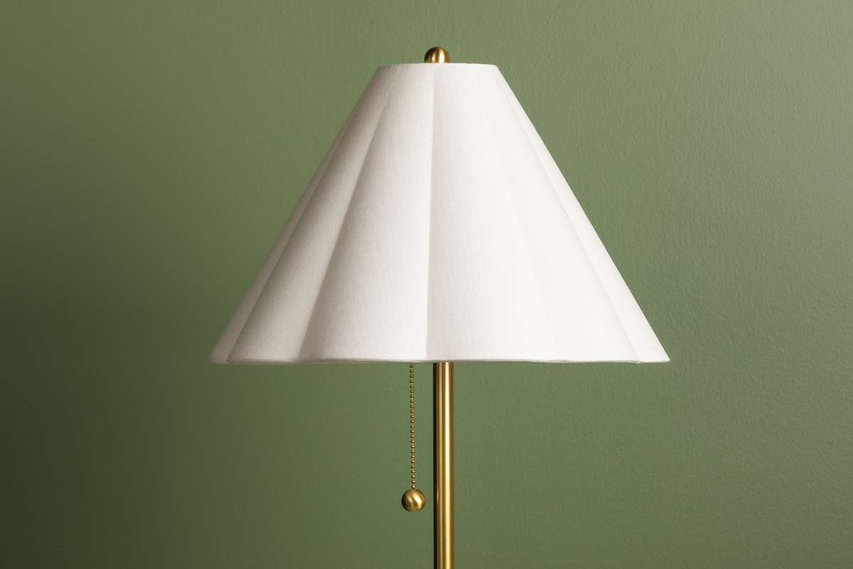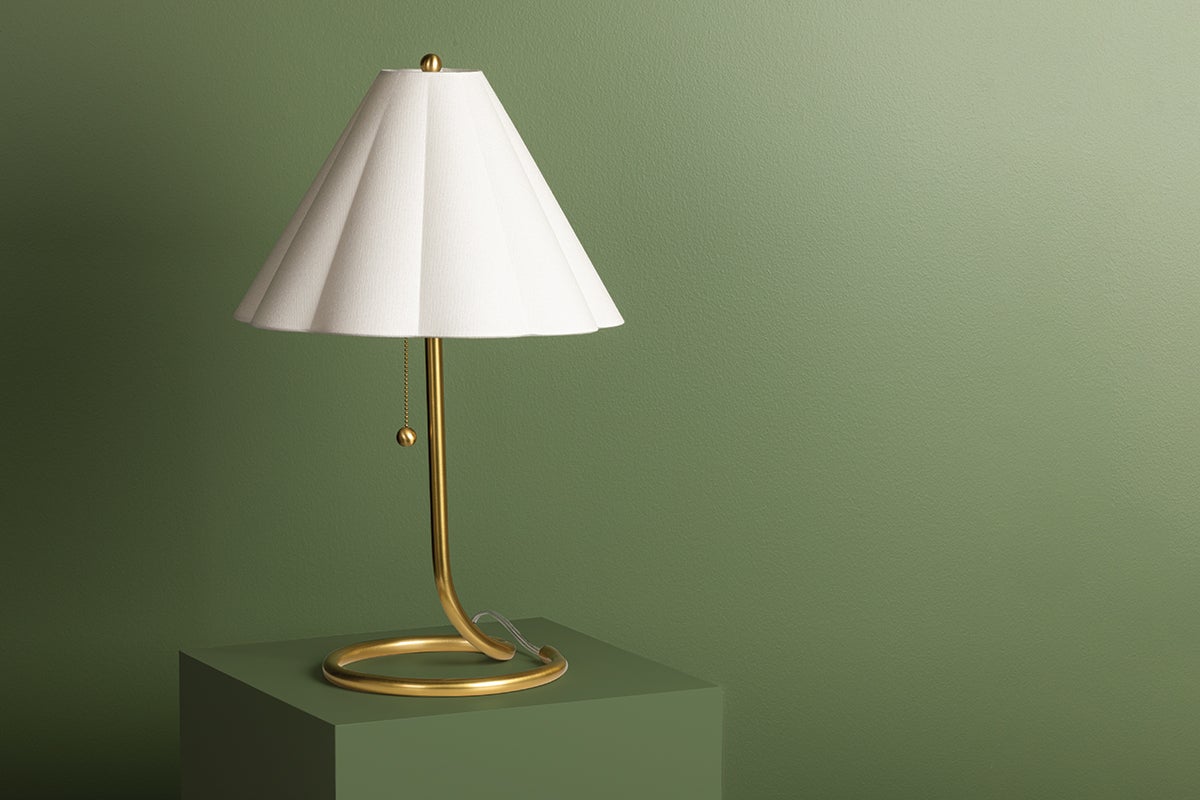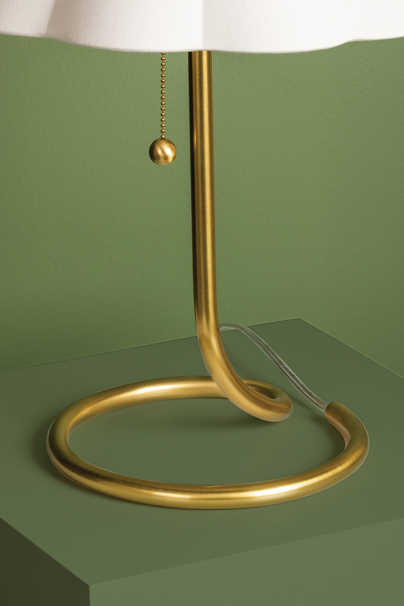 Martha brings style to the table. A thin, smooth rod of aged brass twists and loops to form an airy, abstract base that evokes motion. With its pretty white linen scalloped shade, finial ball and pull chain, this eye-catching table lamp makes a big statement without taking up a lot of space.