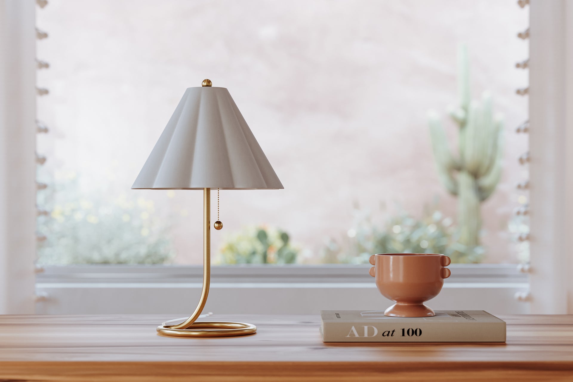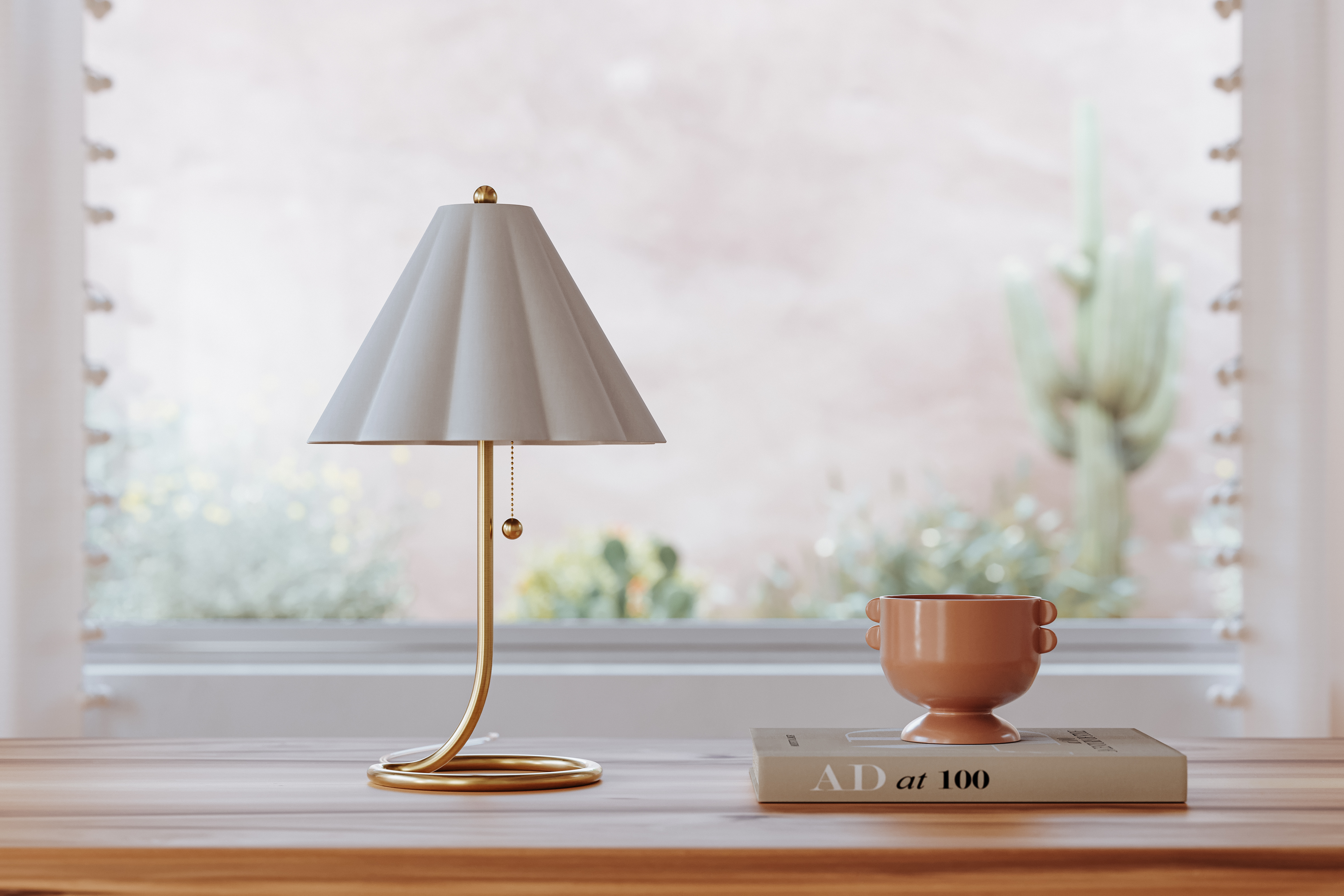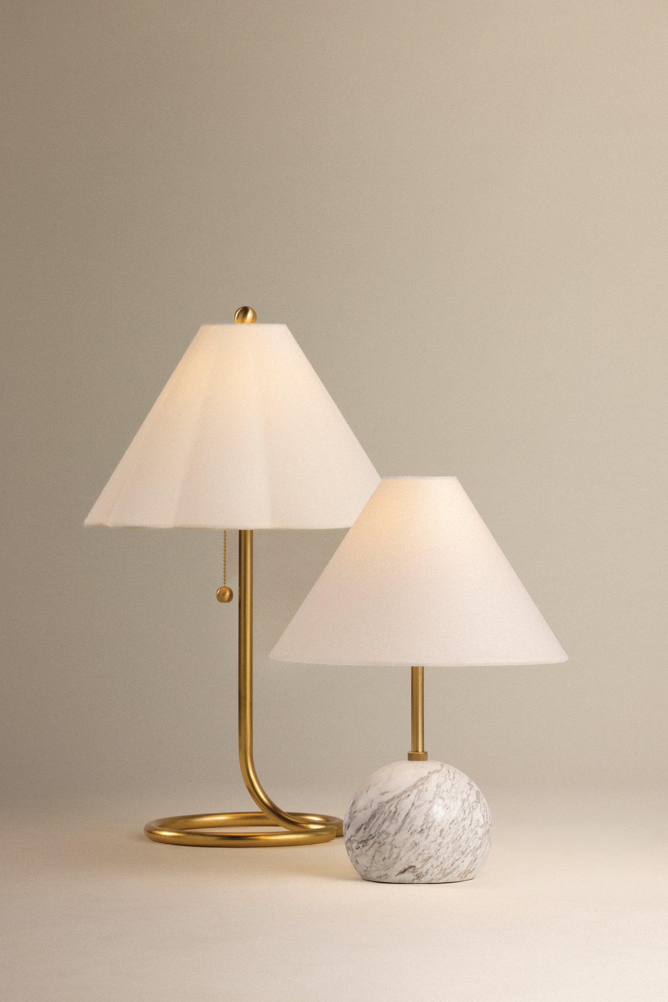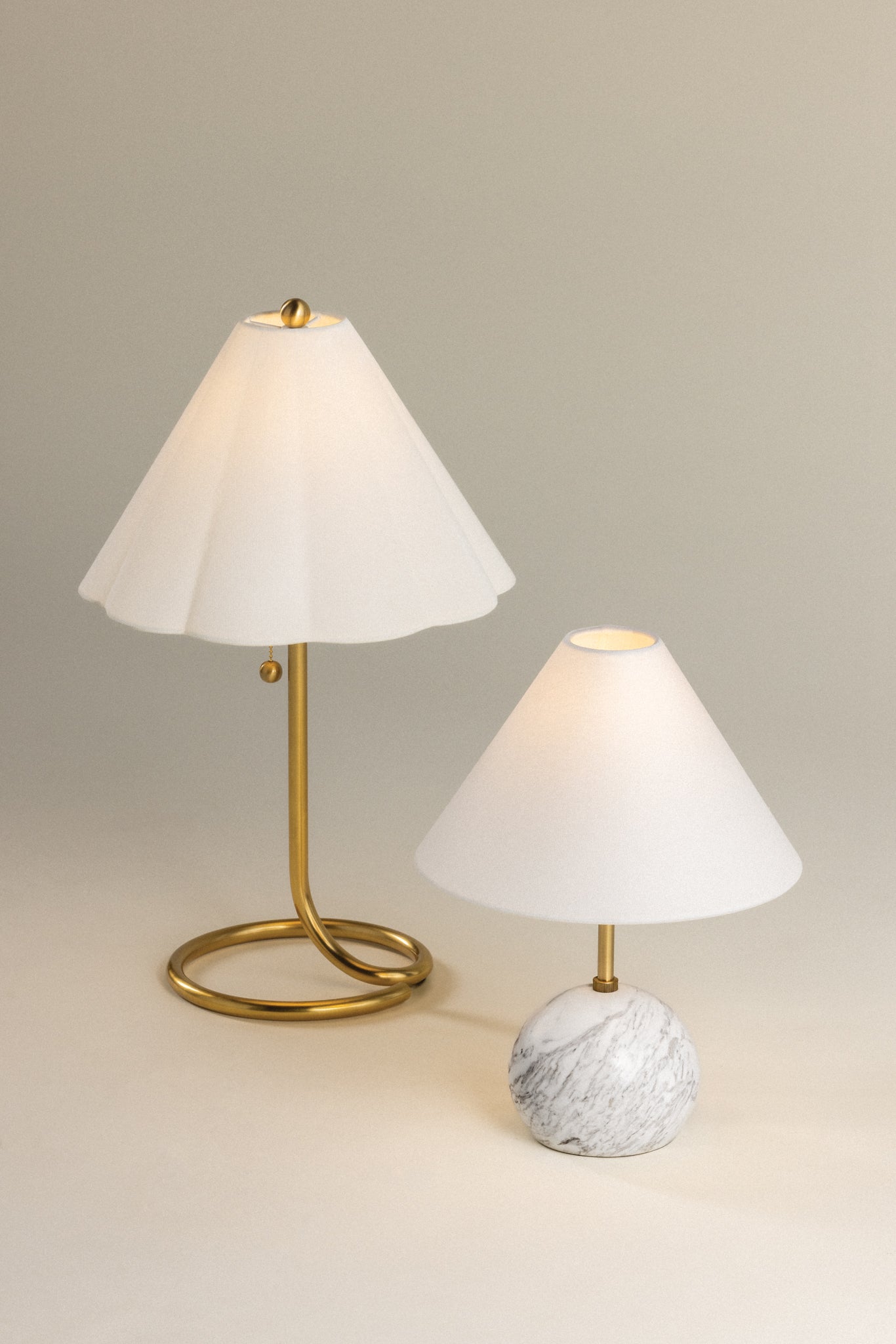 Martha brings style to the table. A thin, smooth rod of aged brass twists and loops to form an airy, abstract base that evokes motion. With its pretty white linen scalloped shade, finial ball and pull chain, this eye-catching table lamp makes a big statement without taking up a lot of space.
