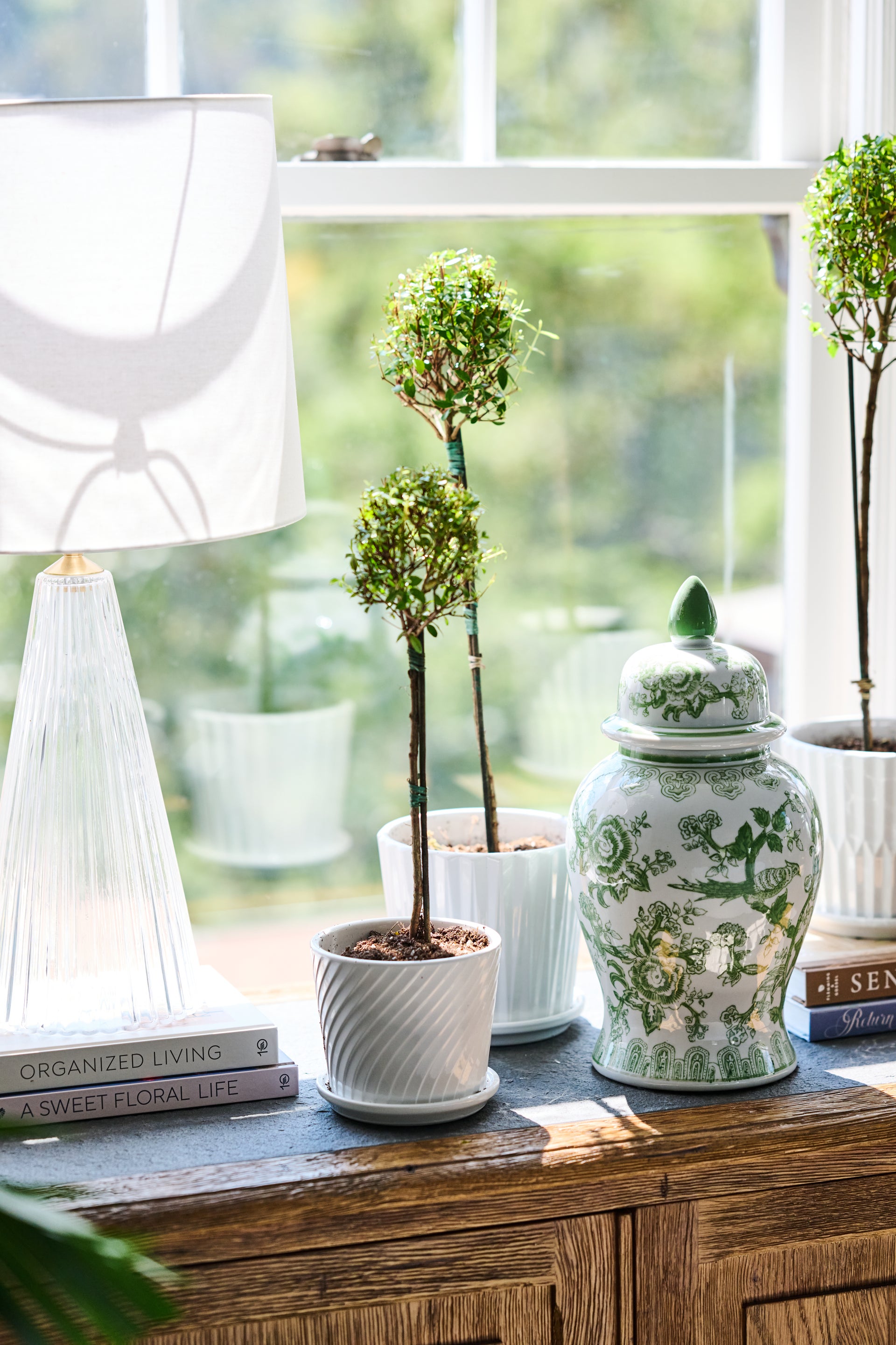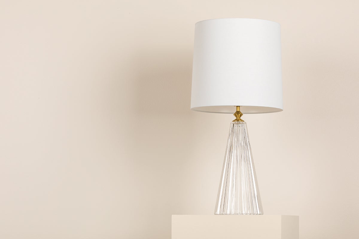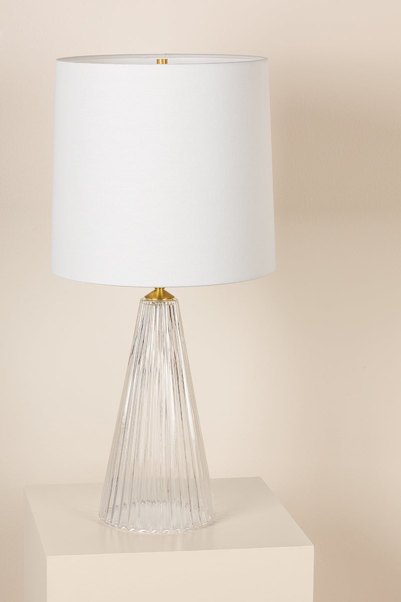 Simple yet elevated, Christie brings elegance to any table. Calling to mind a decorative vase or vintage perfume bottle, Christie combines a clear glass fluted base with a large white linen drum shade. A decorative aged brass neck accent draws the eye and adds a pop of color.