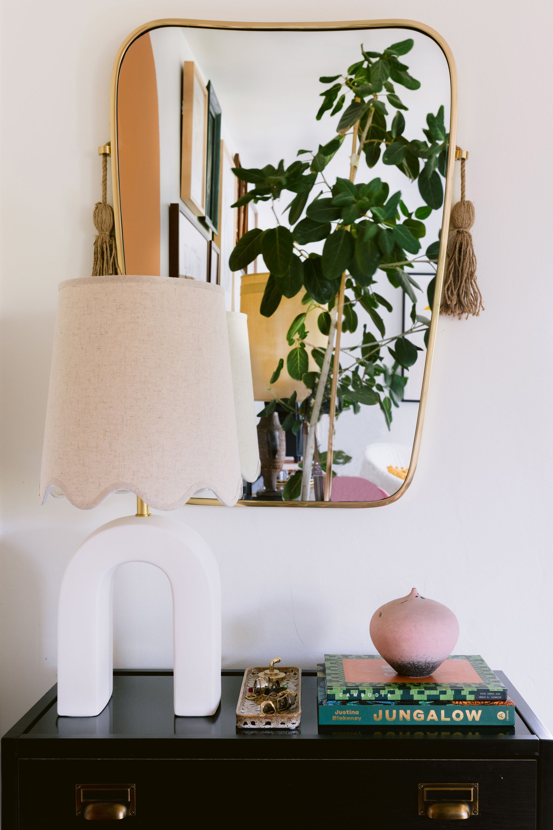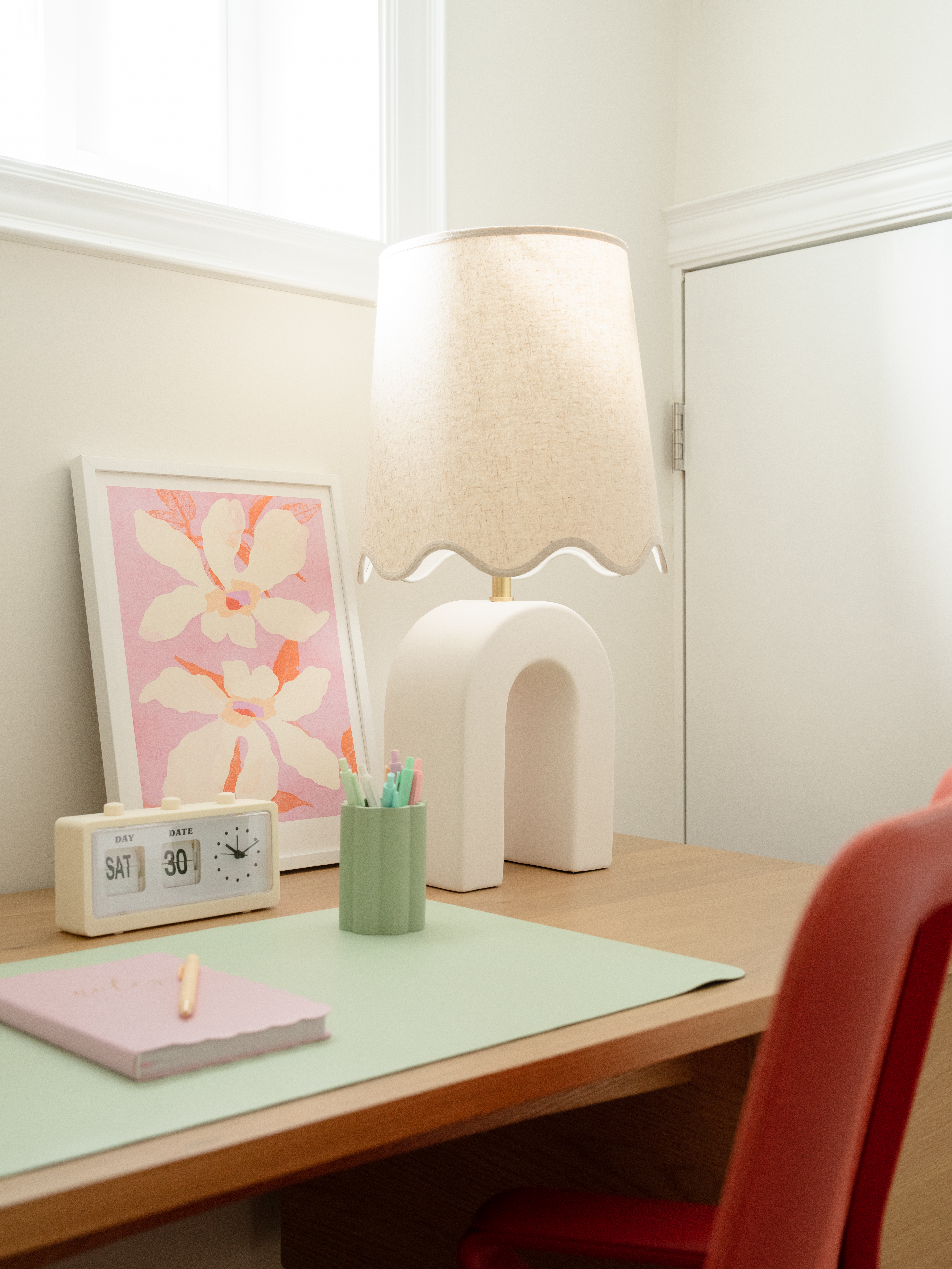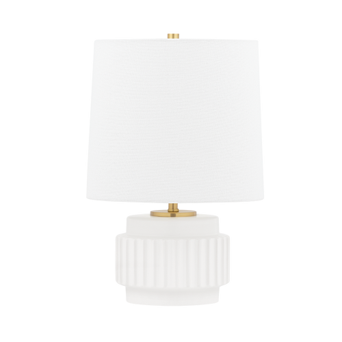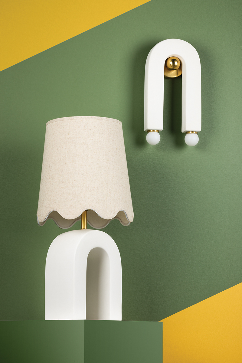 Roshani is undeniably unique, yet utterly usable. A smooth, matte white ceramic shape reminiscent of a magnet draws the eye and attracts attention. The sconce is draped over an aged brass backplate and the table lamp is topped by a natural linen shade with pretty scalloped detailing and aged brass accents. Both fixtures give off a warm, soft glow.