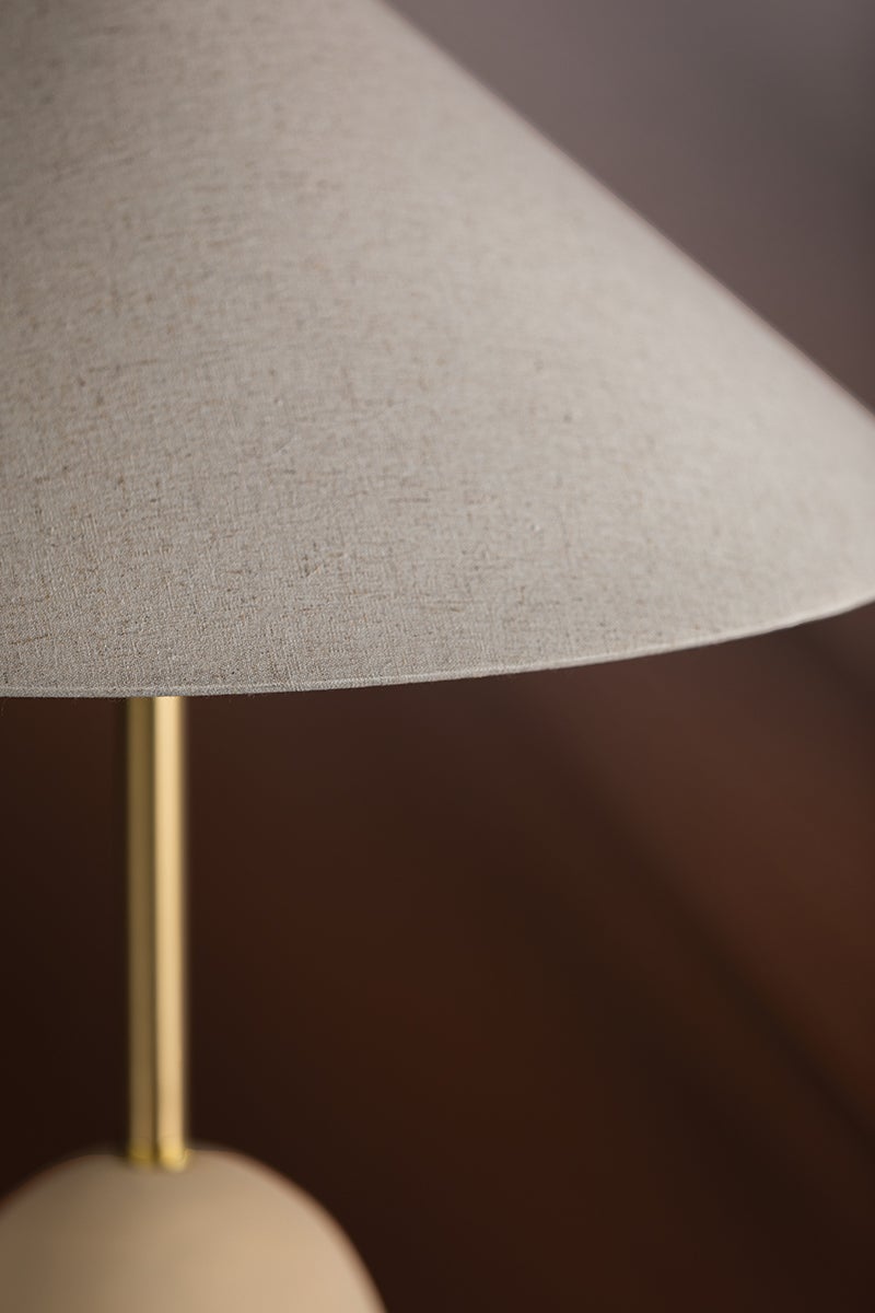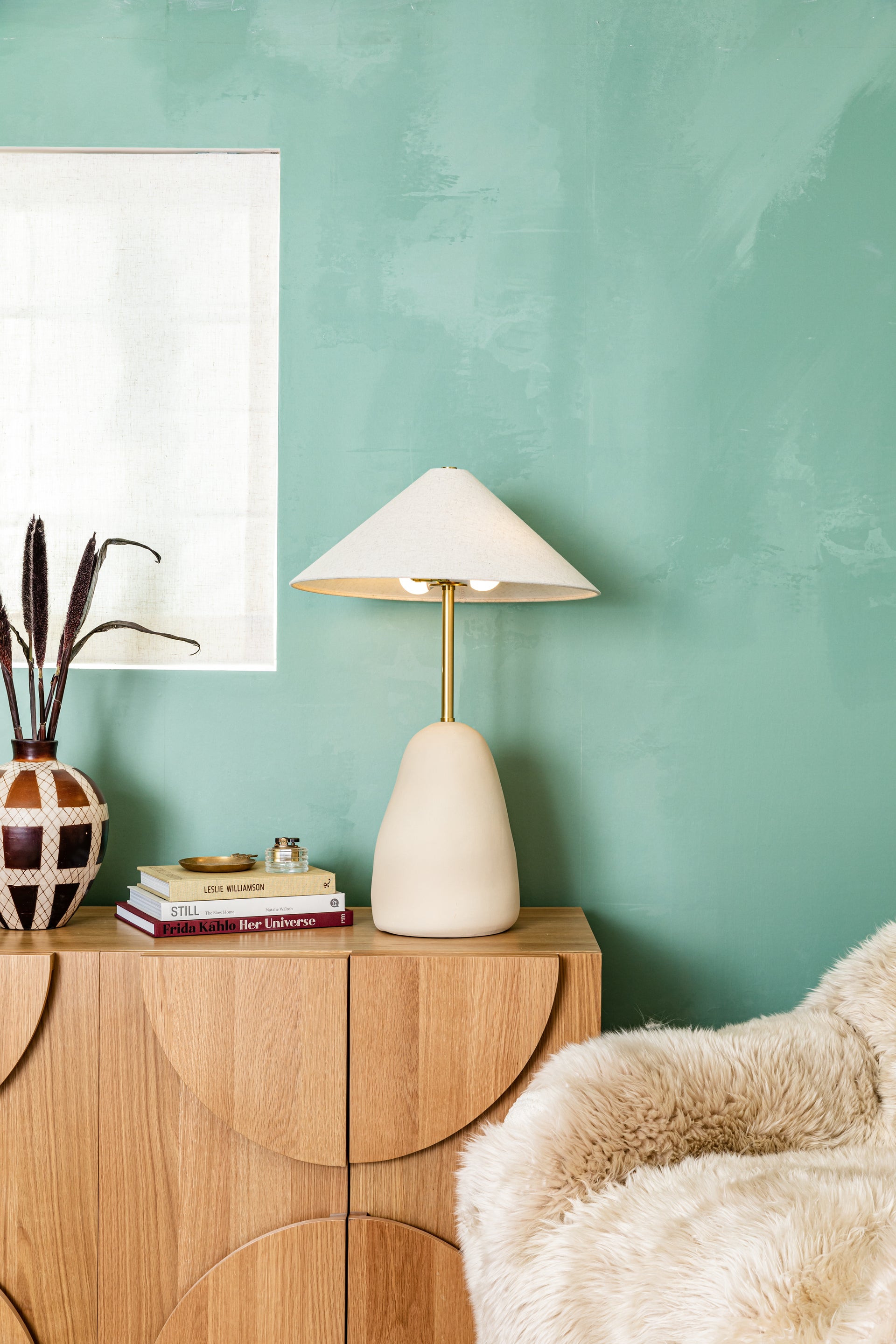 Capturing the designer's heritage, Maia is both intimate and intriguing. The perfectly imperfect ceramic base represents a Brazilian mountain, and the angular shade evokes the roof of a traditional Korean home. Aged brass accents give this natural, neutral beauty a hint of shine.
