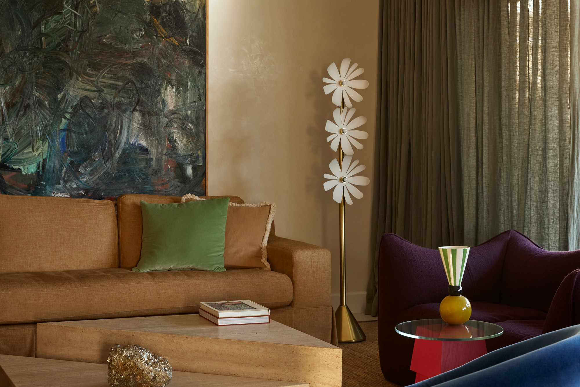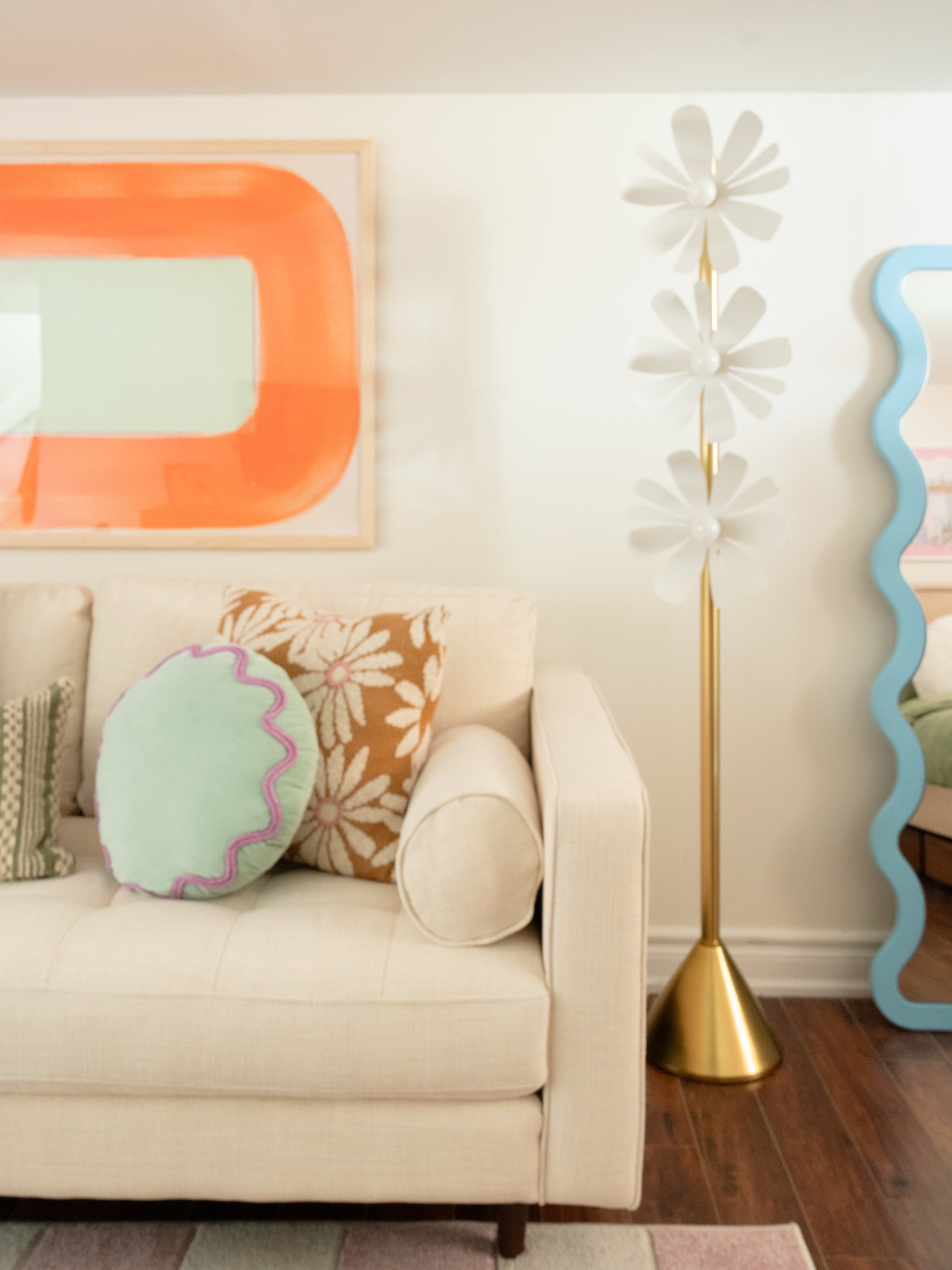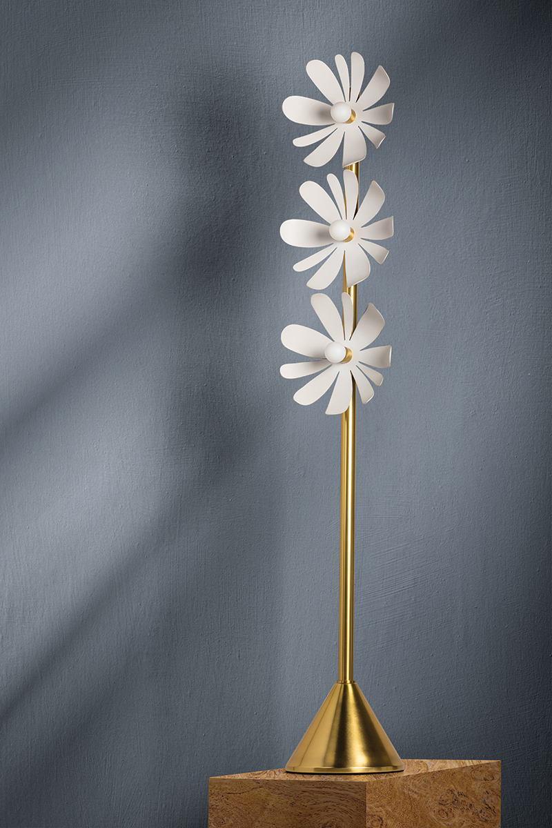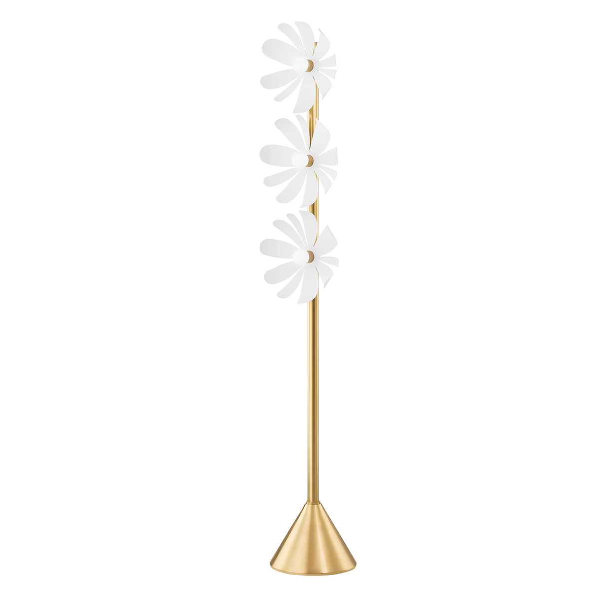 Pretty with a retro flair, Twiggy is floral inspiration at its finest. Different-sized textured white petals sprout from a petite opal matte bulb at the center. The aged brass accents add a pop of shine without taking away from the piece's organic feel. Twiggy offers an entire bouquet of options including a one- or three-light wall sconce, a 3-light semi flush and a 3-light floor lamp.