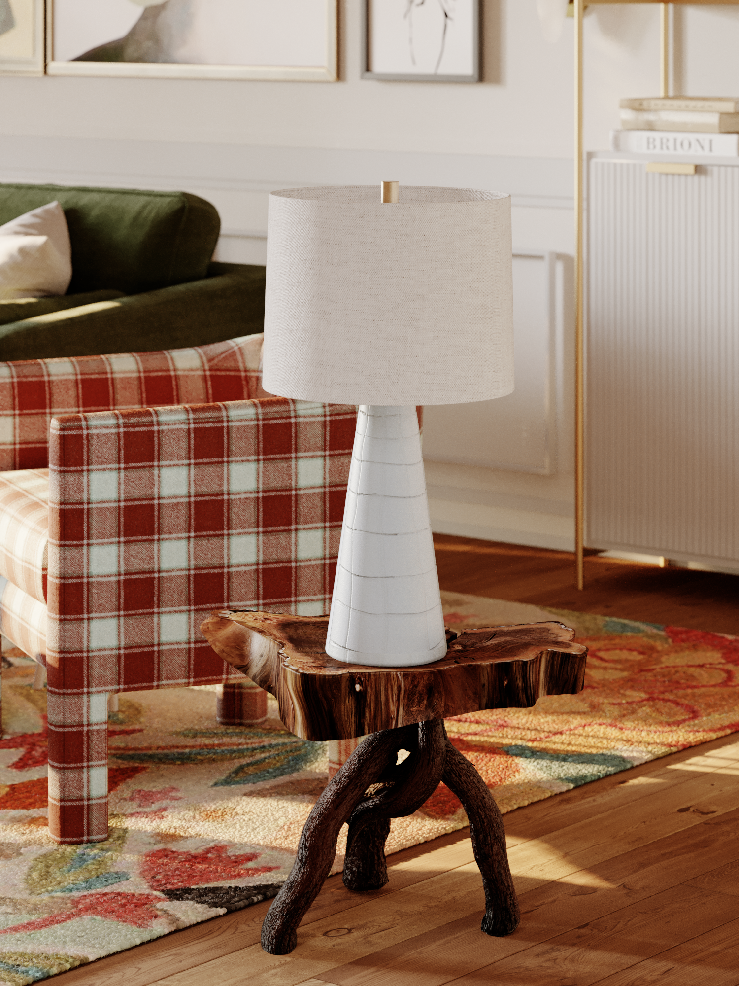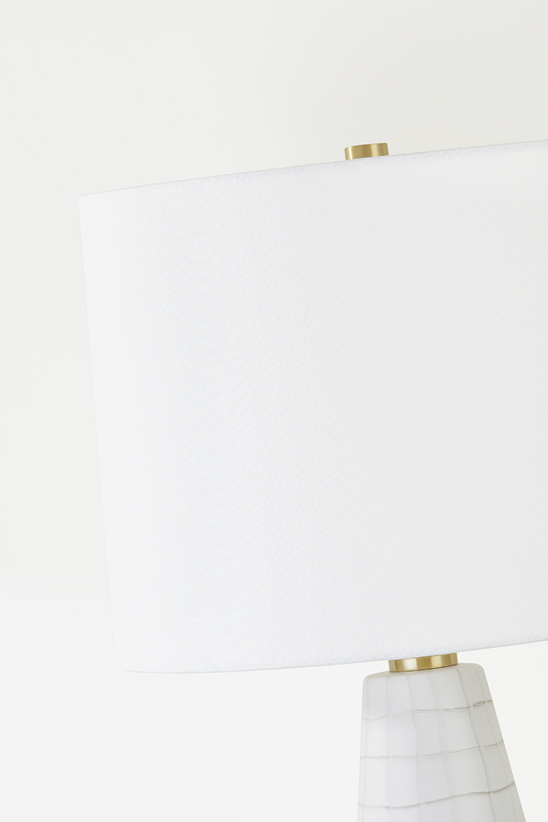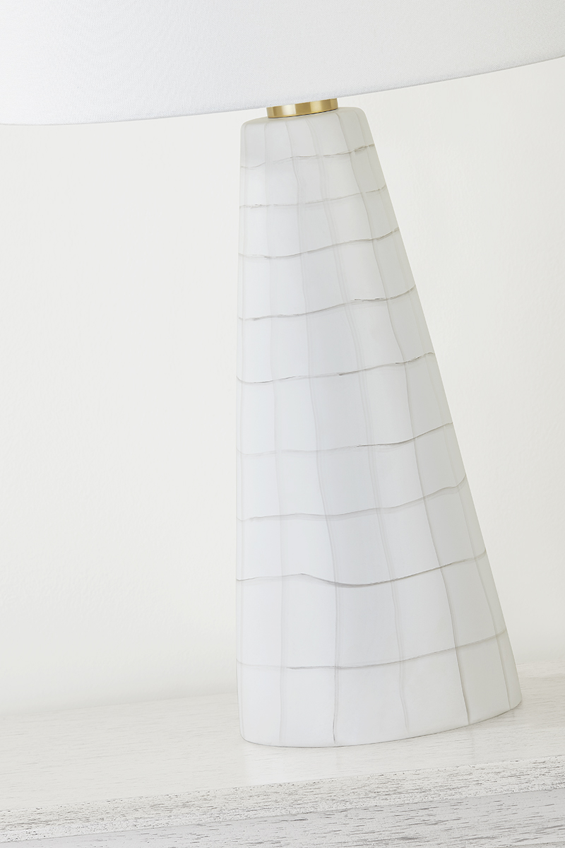 A hand-painted, uneven grid pattern gives this table lamp a fun and fresh style with a whimsical feel. The Satin White Ceramic base is topped by a white linen drum shade for a clean, neutral palette that works well with any interior. Aged Brass accents at the neck and finial add a glimmer of metal. Melinda adds just the right bit of whimsy to tabletops throughout the home.