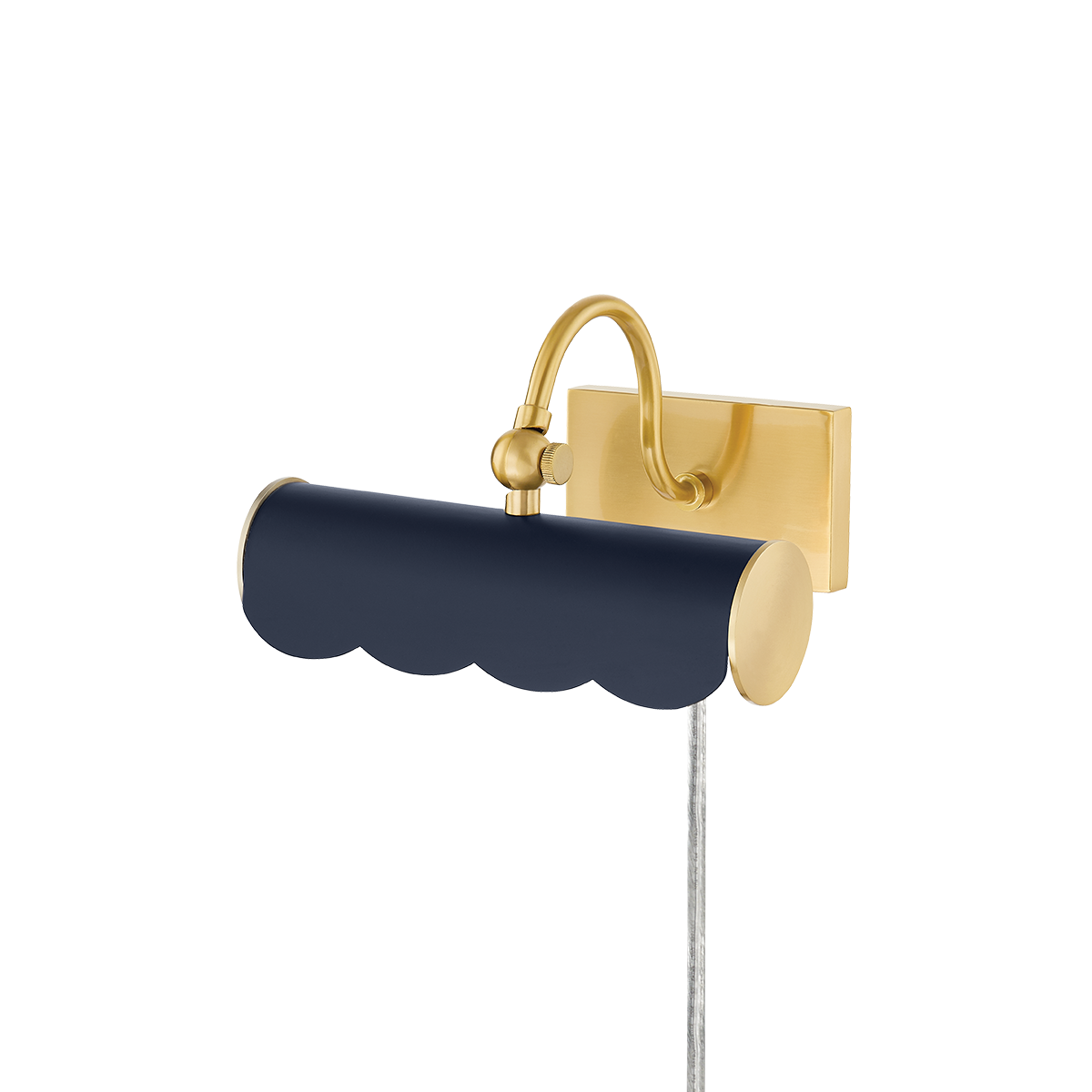 Highlight artwork, photos or other wall décor with this pretty, plug-in picture light. A new traditional take on the classic design, it features a sweet scalloped edge and curved arm that adds warmth and feels fresh. Fifi is available in three sizes and finishes; Aged Brass, Soft White, and Soft Navy to fit any space and color scheme. Part of our Ariel Okin x Mitzi Tastemakers collection.