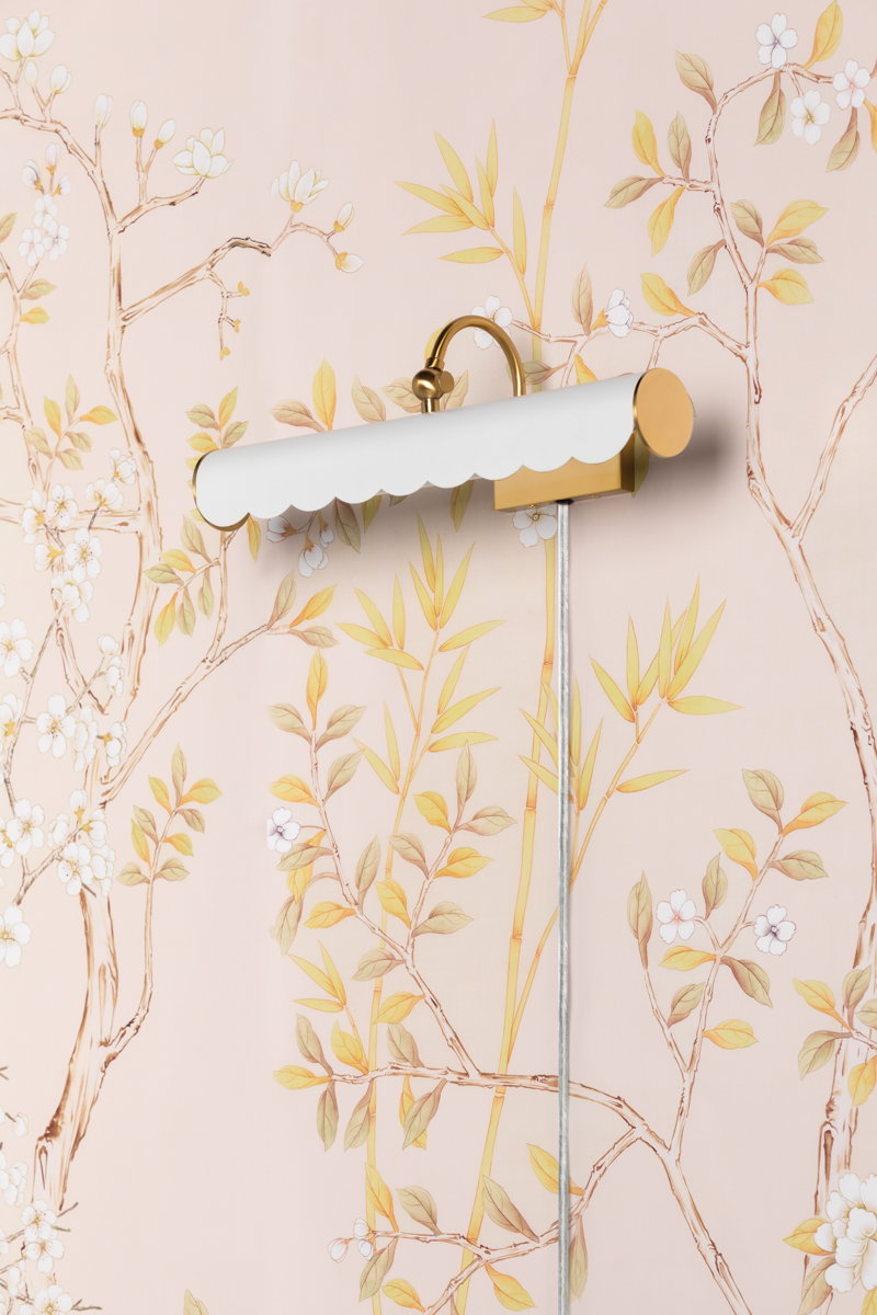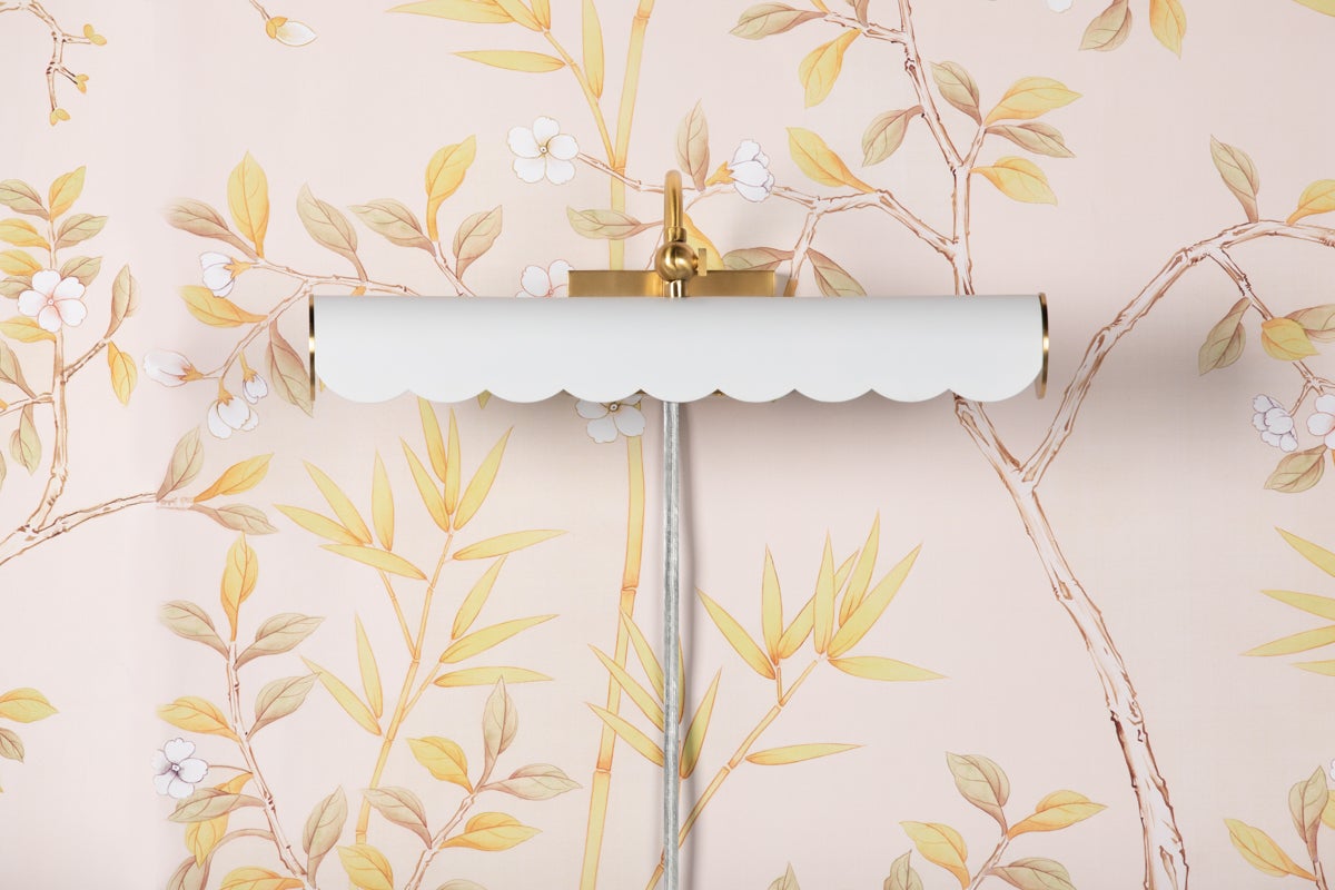 Highlight artwork, photos or other wall décor with this pretty, plug-in picture light. A new traditional take on the classic design, it features a sweet scalloped edge and curved arm that adds warmth and feels fresh. Fifi is available in three sizes and finishes; Aged Brass, Soft White, and Soft Navy to fit any space and color scheme. Part of our Ariel Okin x Mitzi Tastemakers collection.