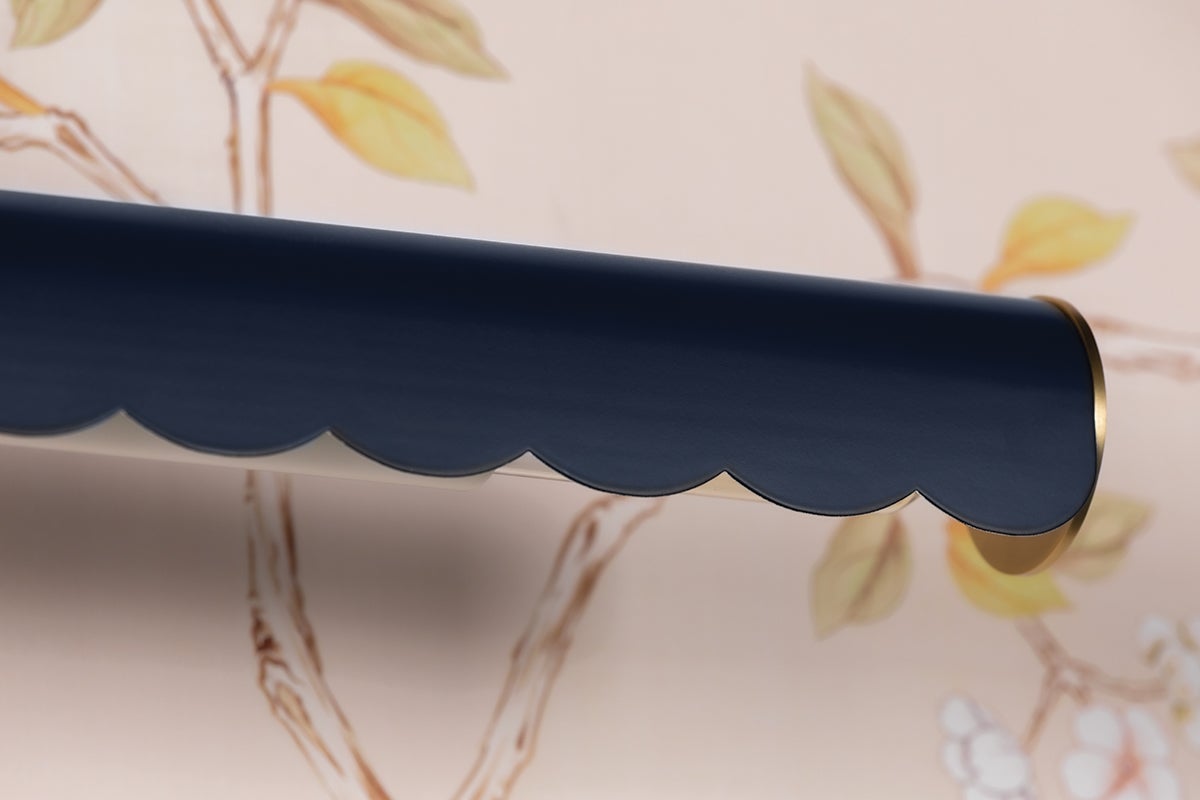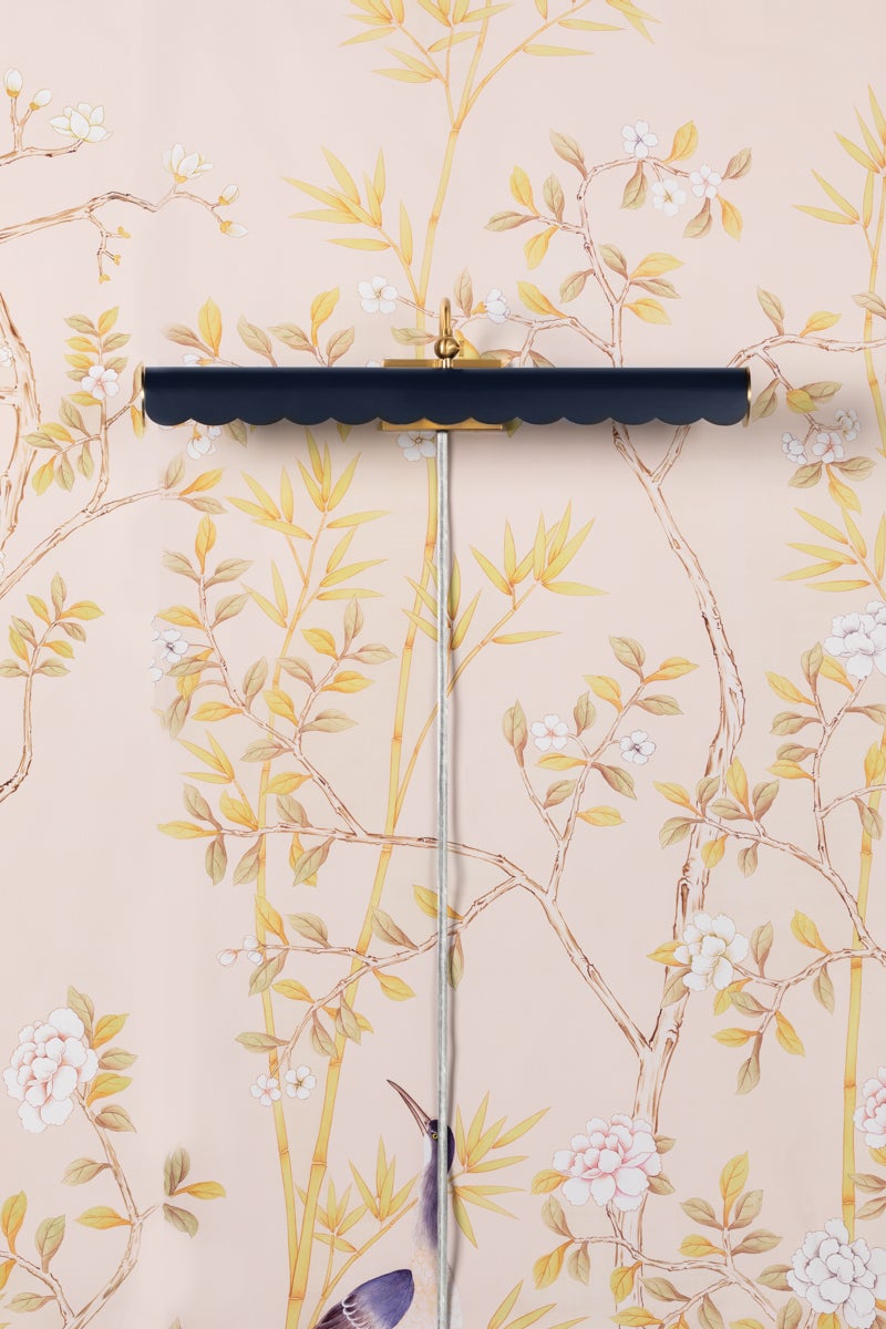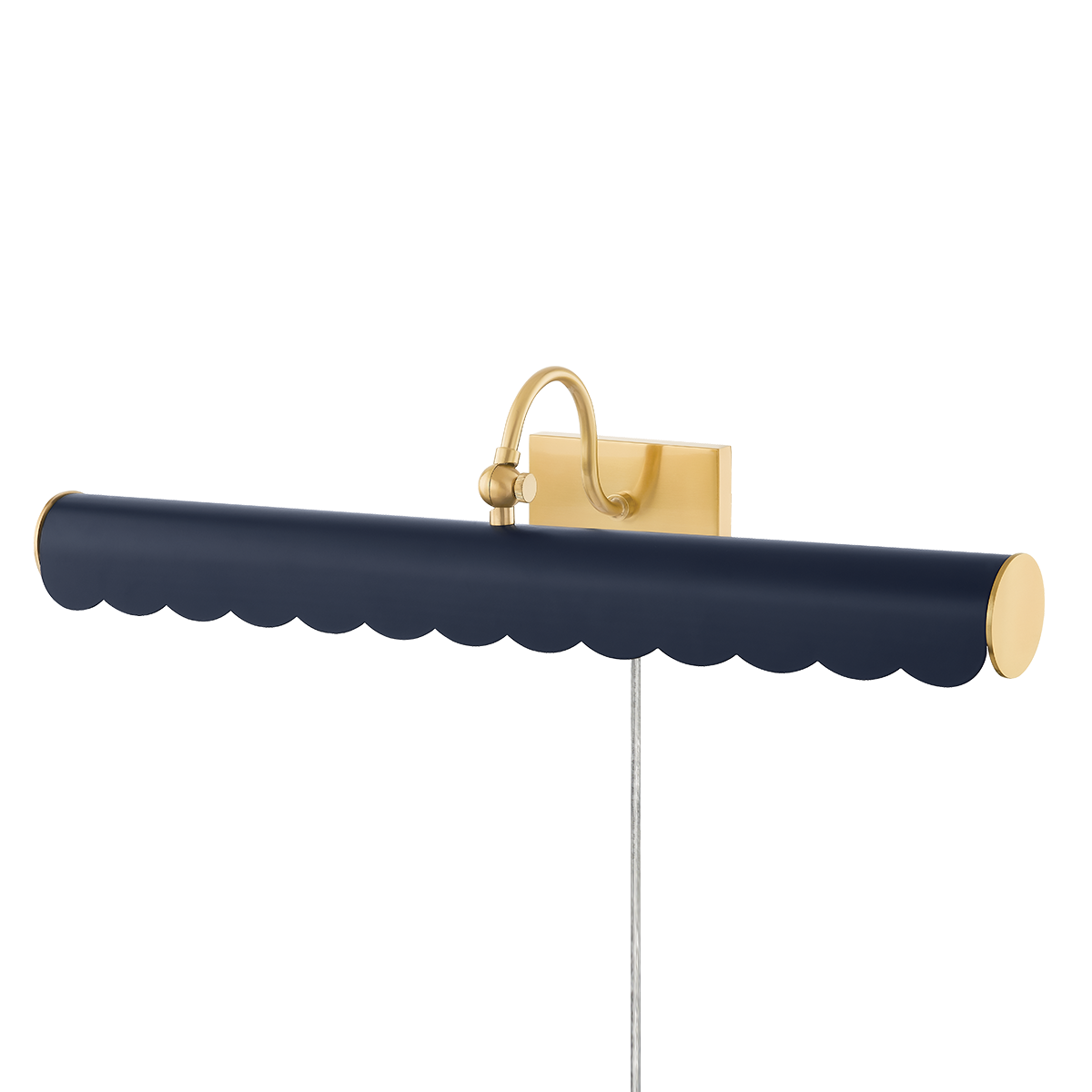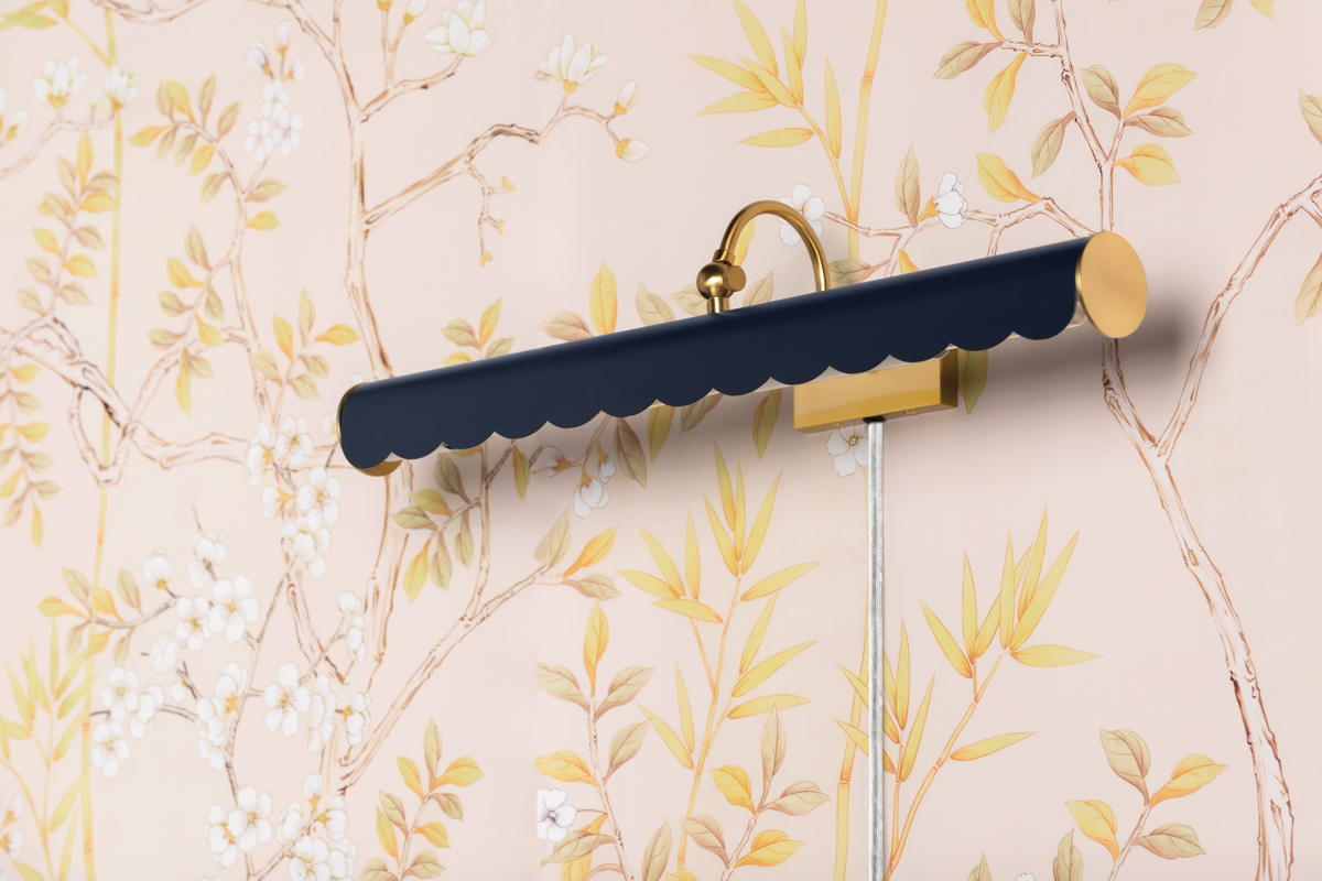 Highlight artwork, photos or other wall décor with this pretty, plug-in picture light. A new traditional take on the classic design, it features a sweet scalloped edge and curved arm that adds warmth and feels fresh. Fifi is available in three sizes and finishes; Aged Brass, Soft White, and Soft Navy to fit any space and color scheme. Part of our Ariel Okin x Mitzi Tastemakers collection.
